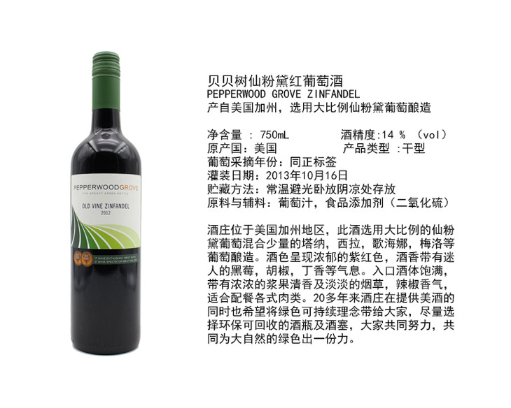 【双支特惠装】贝贝树-仙粉黛红葡萄酒 Pepperwood Groves Merlot 750ml*2