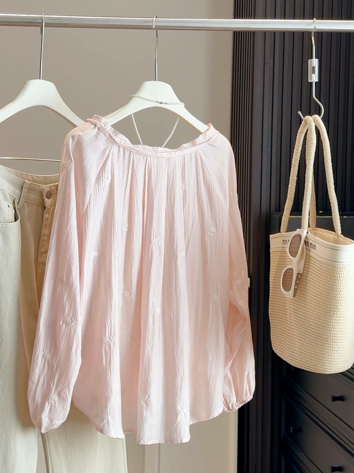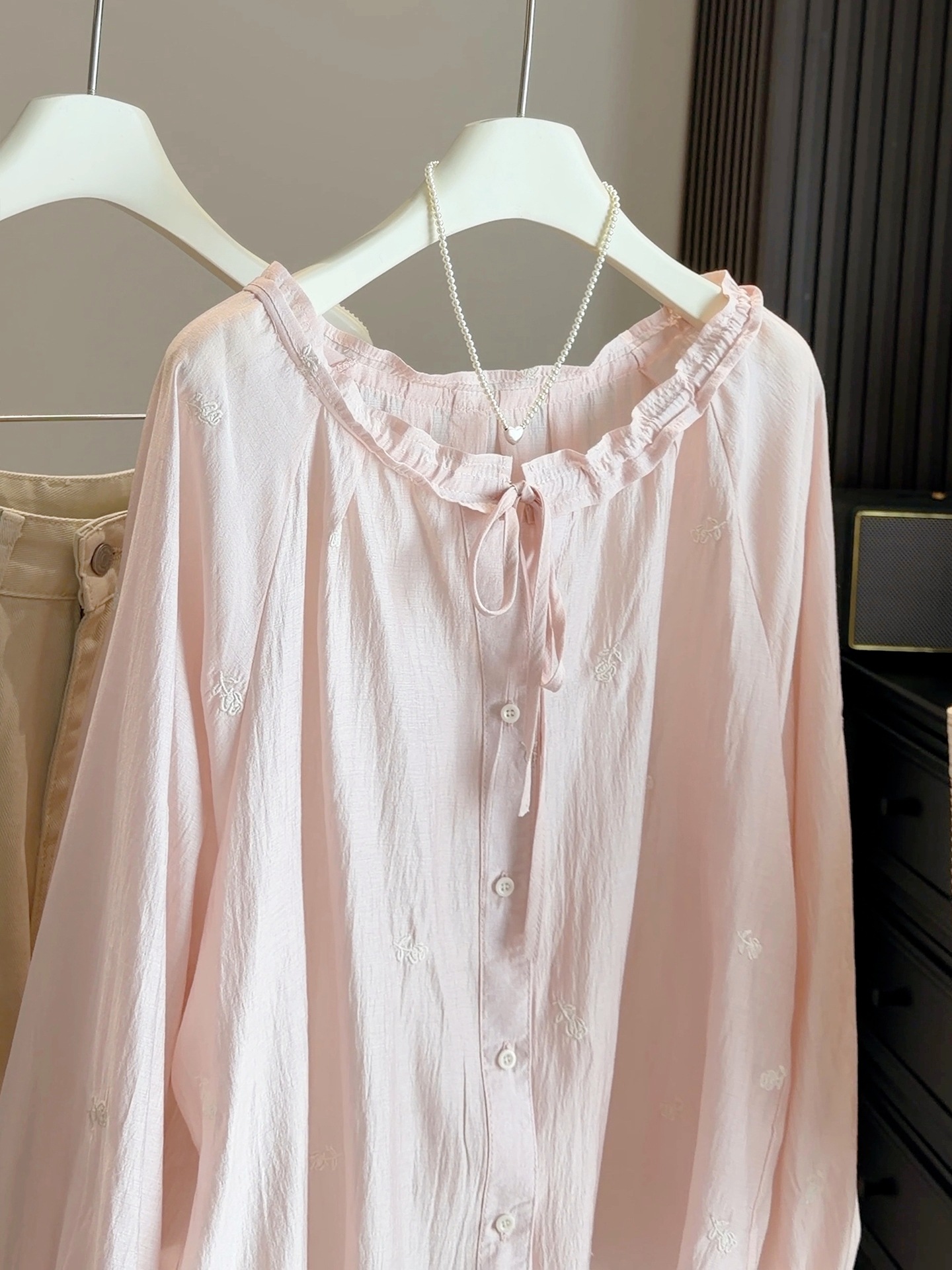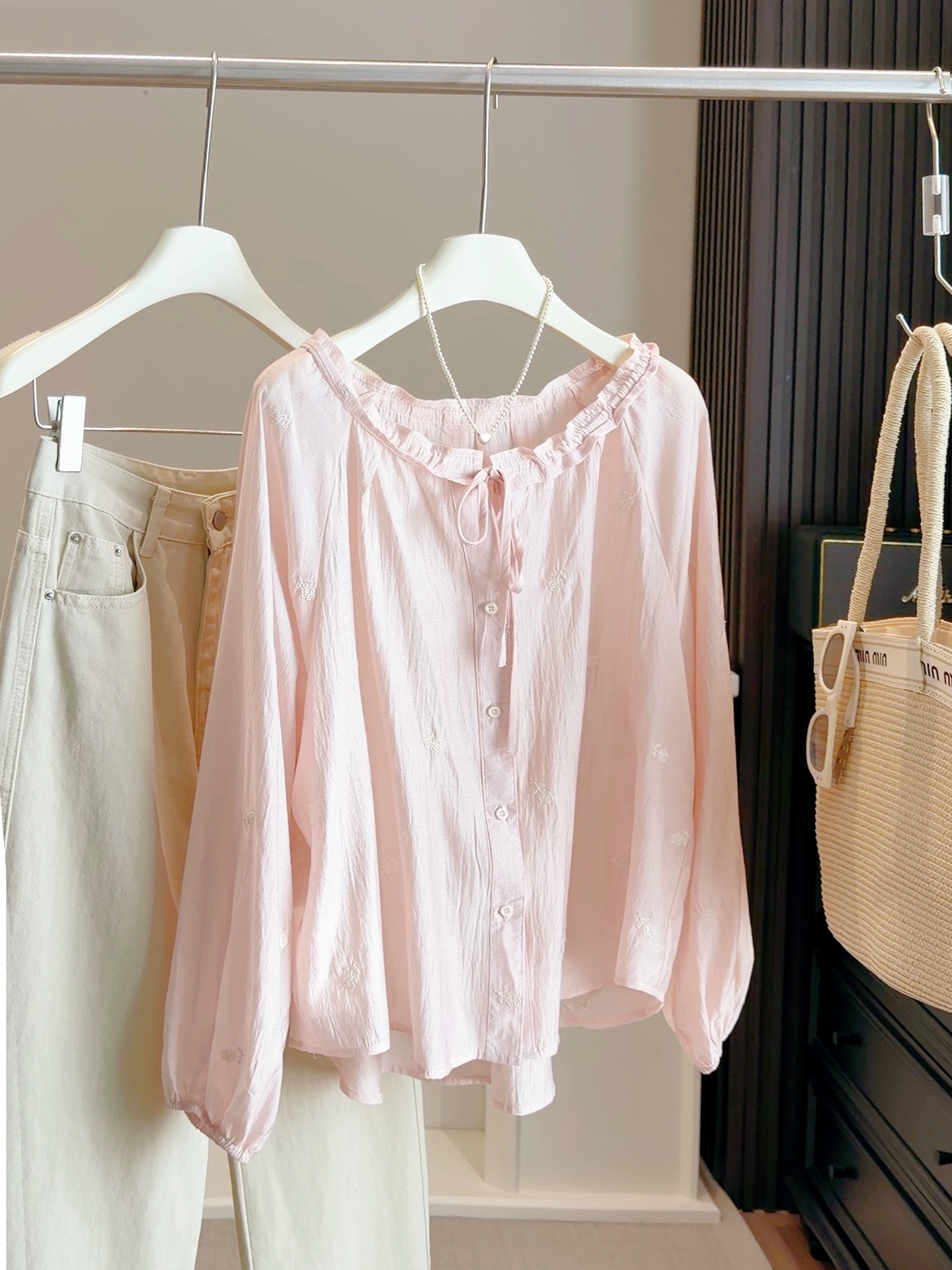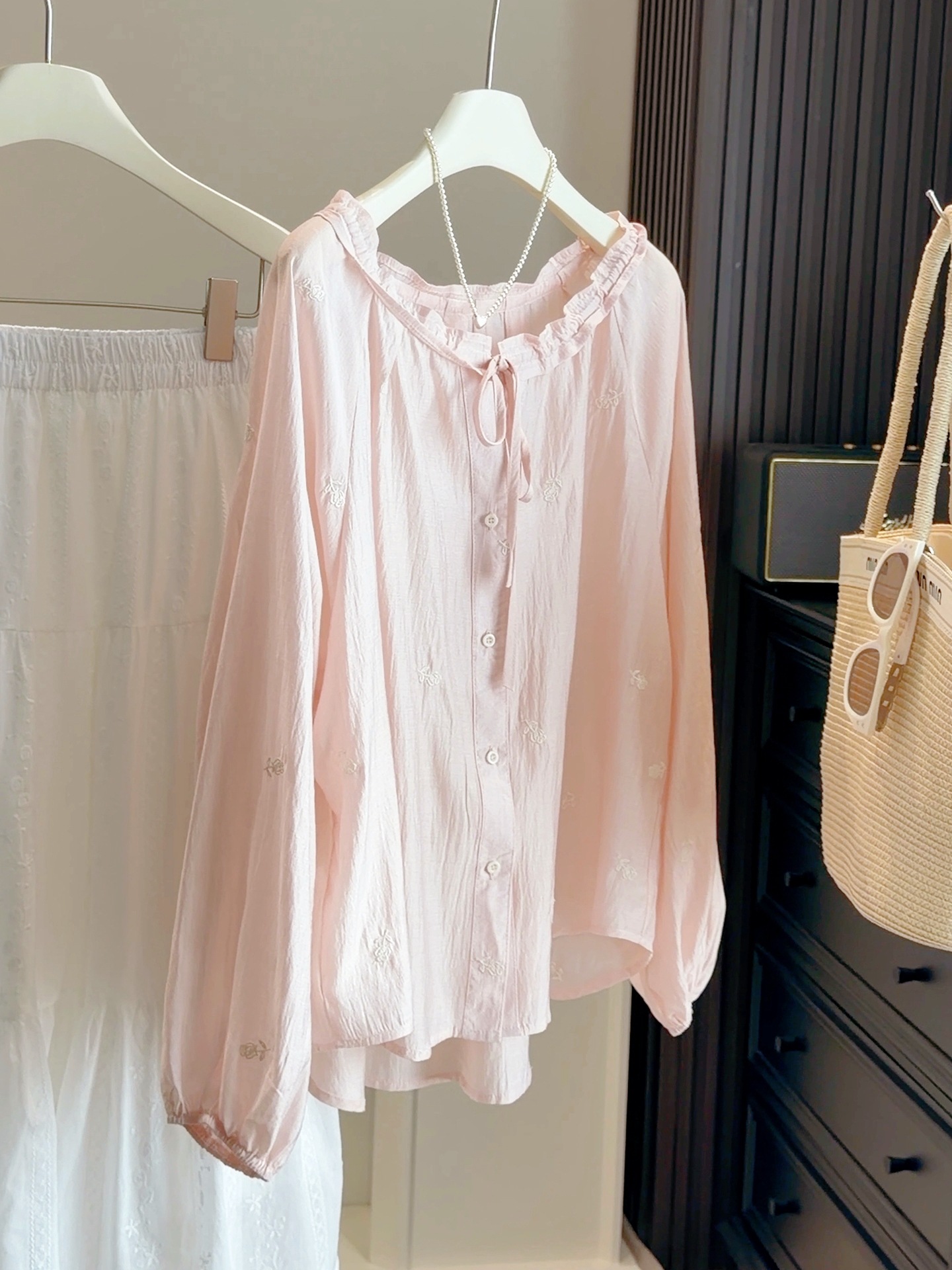 【韩版复古灯笼袖】显瘦玫瑰刺绣衬衫 春新款 木耳边绑带宽松防晒上衣