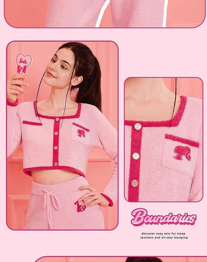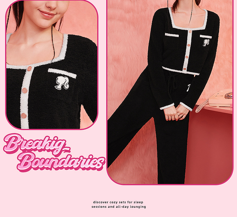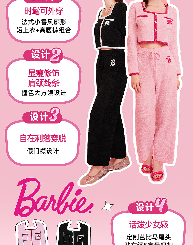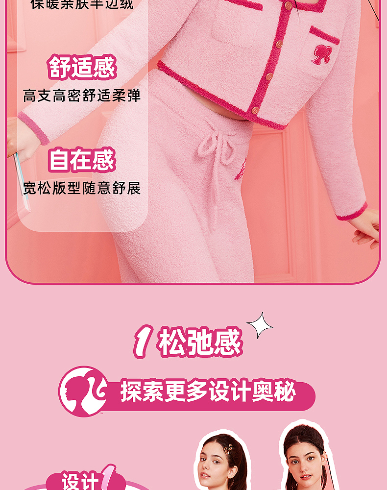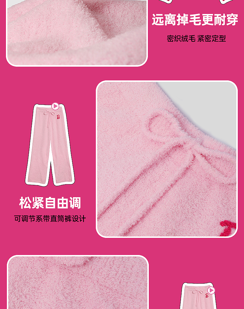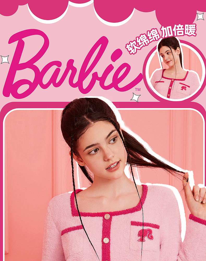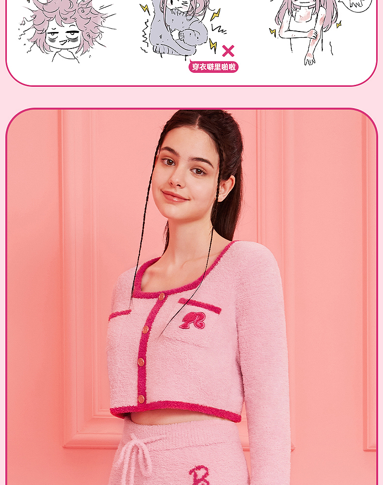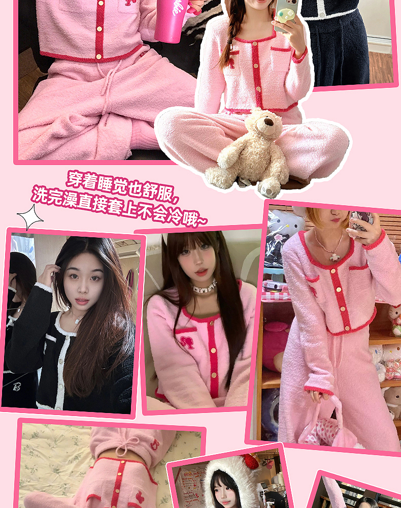 好奇蜜斯Barbie联名复古高腰小香风方领秋冬半边绒女士家居服套装 Elaine 伊莲恩