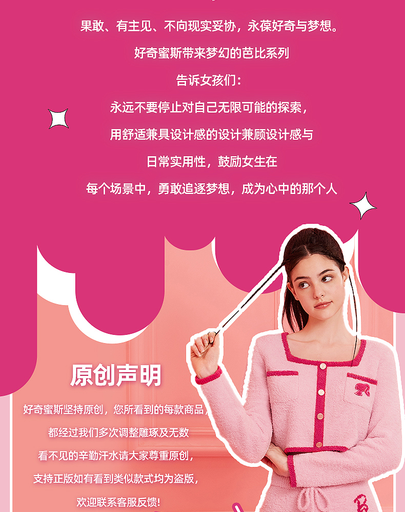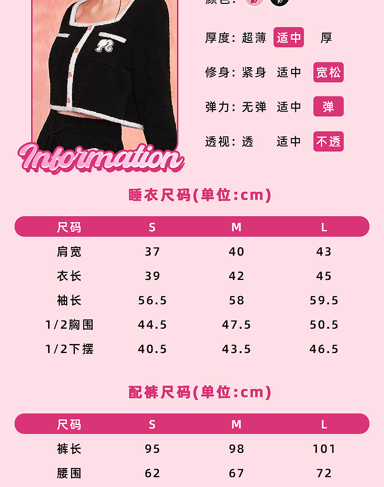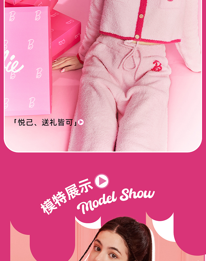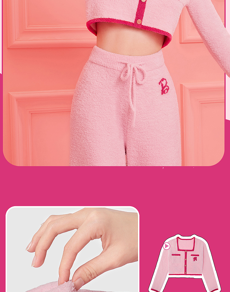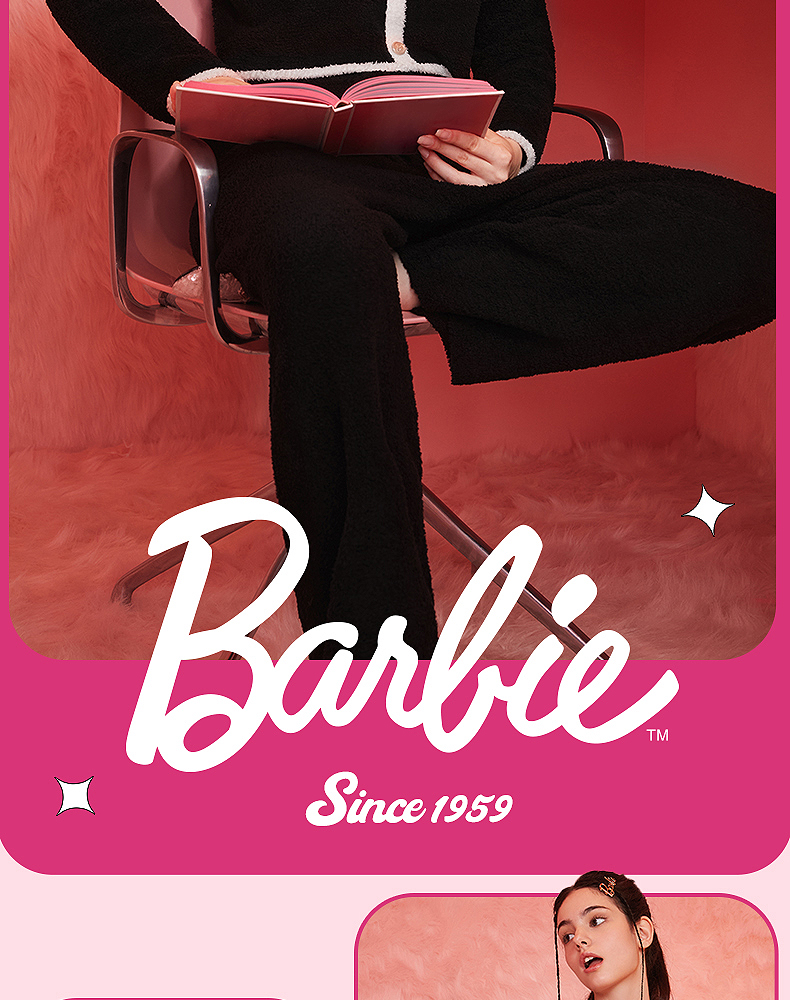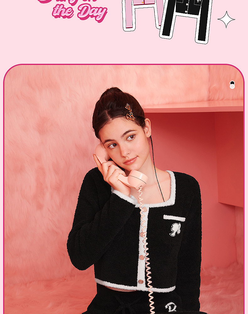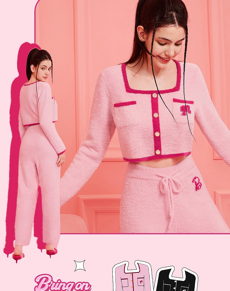 好奇蜜斯Barbie联名复古高腰小香风方领秋冬半边绒女士家居服套装 Elaine 伊莲恩