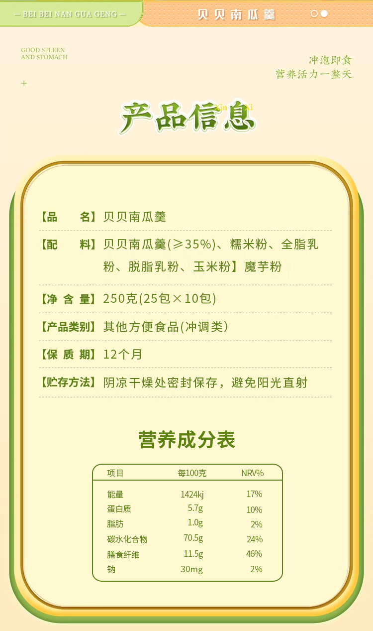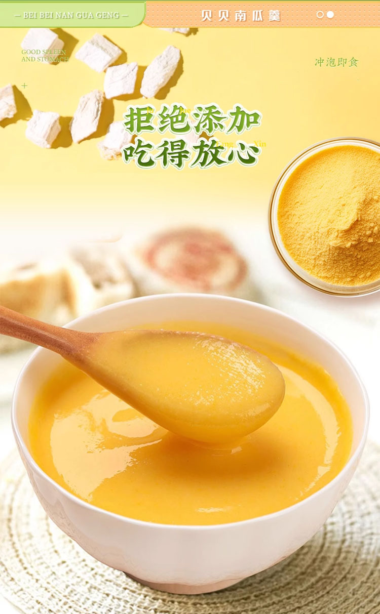 贝贝南瓜羹,12袋组合,配料干干净净,超微粉碎工艺,冲调不结块,富含多种营养,即冲即饮,口感软糯丝滑,细腻,香味浓郁,低脂高营养,高膳食纤维,有饱腹感身体没负担M