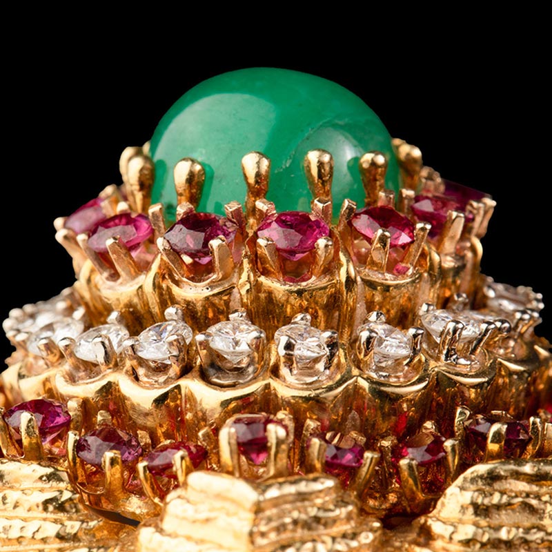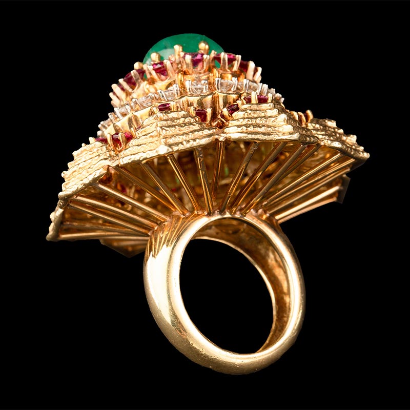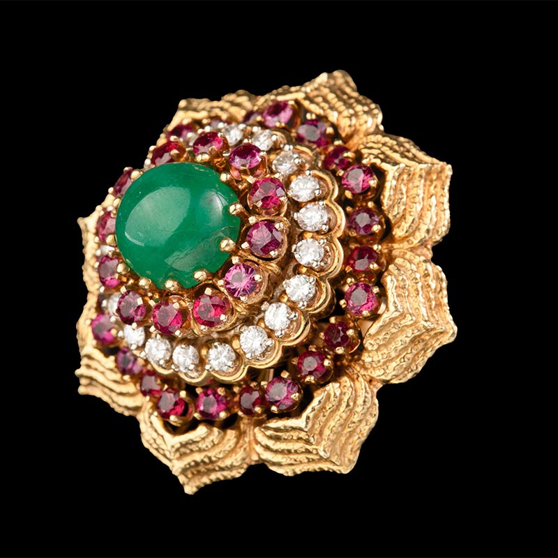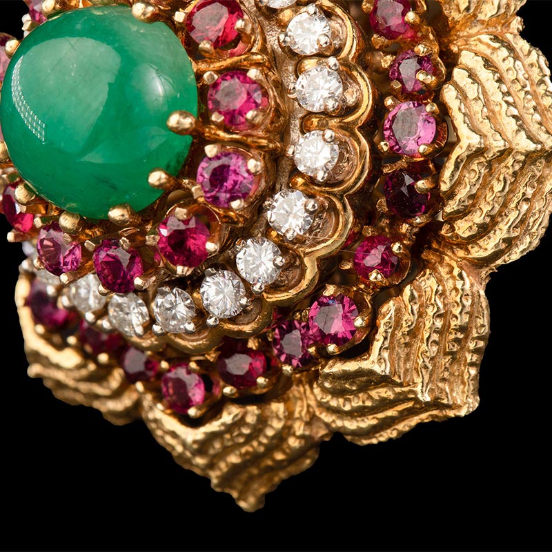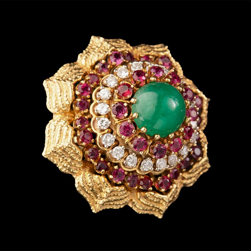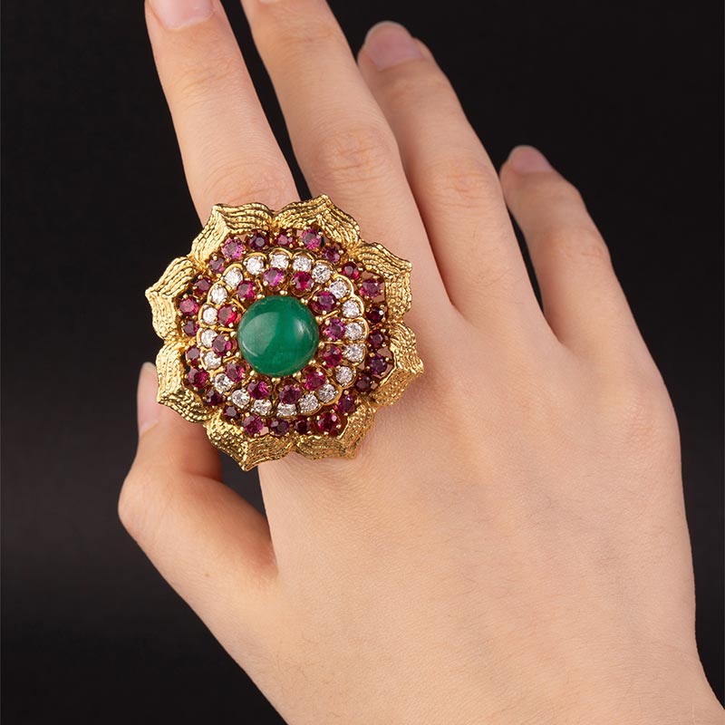 1970年代美国出品花朵造型黄金镶嵌钻石红宝石及蛋面祖母绿戒指