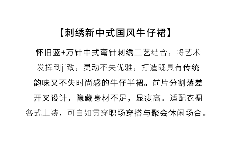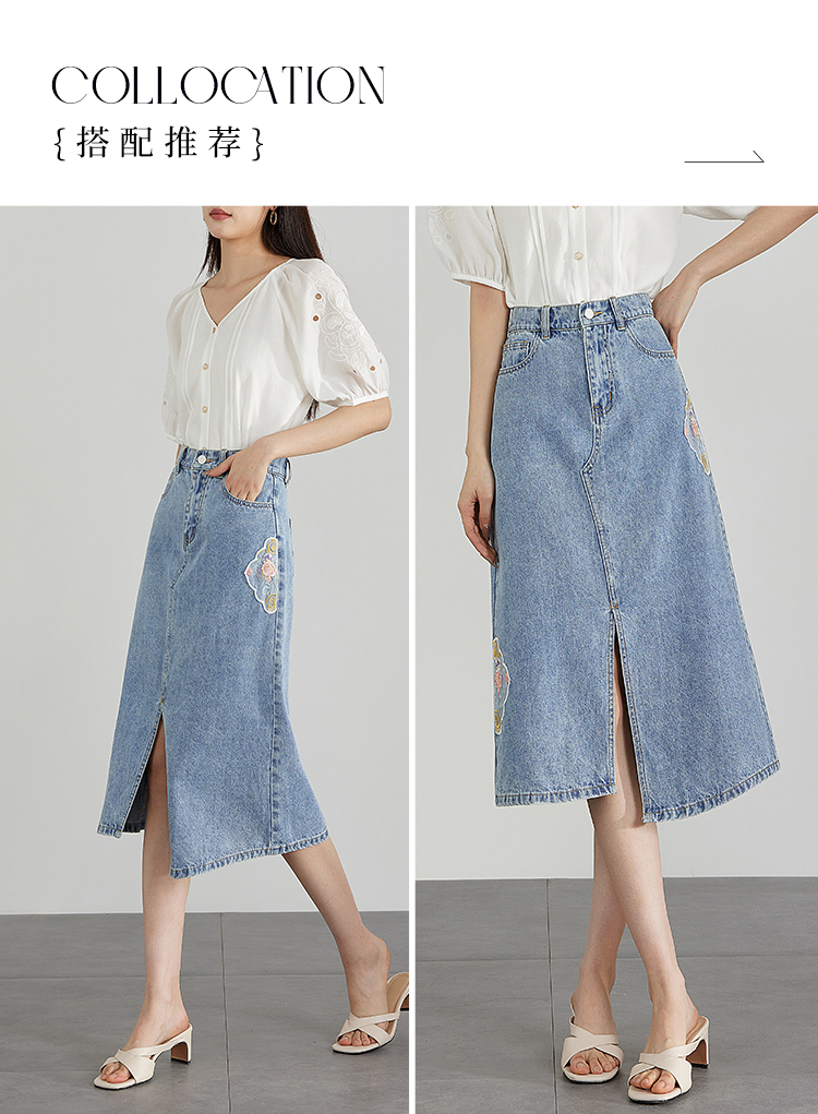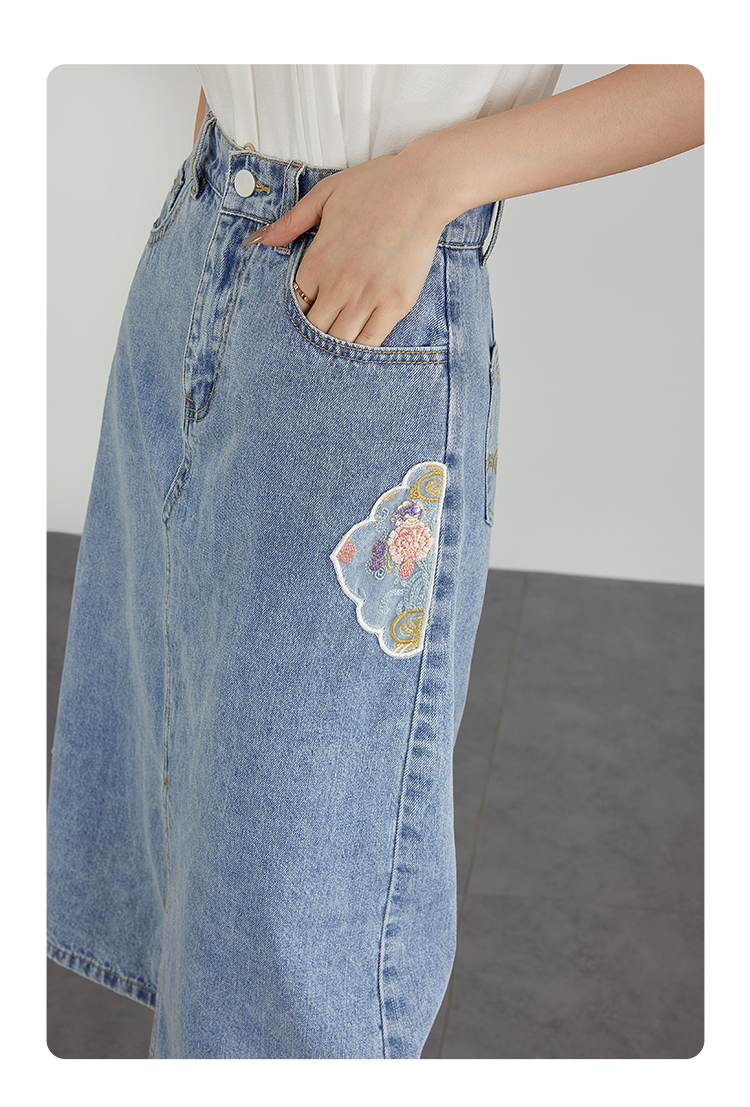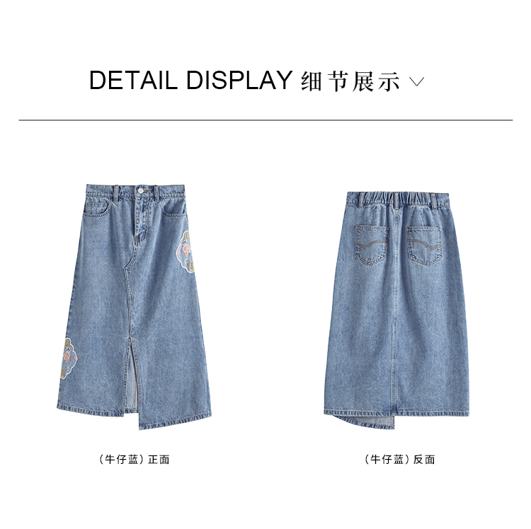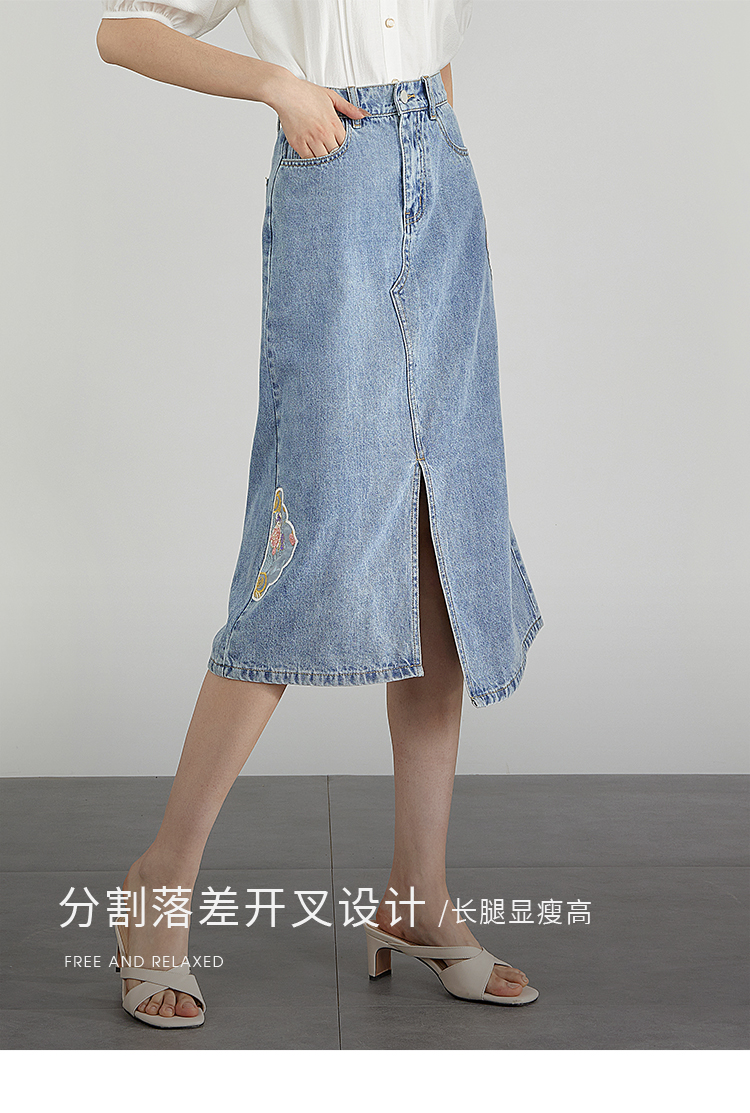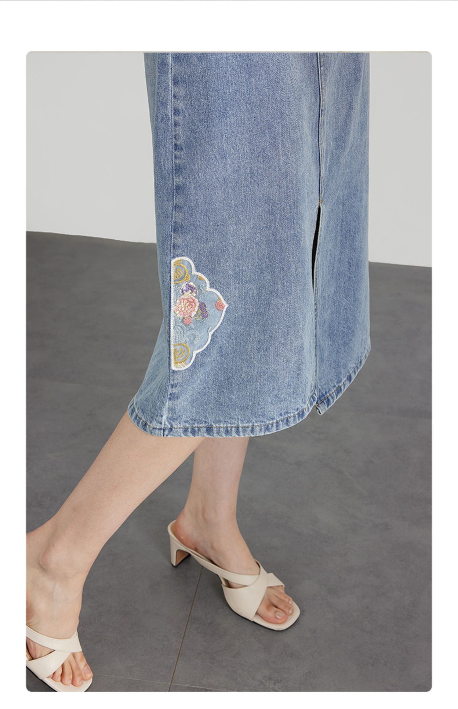 【专属特价】熙世界新中式国风刺绣牛仔半身裙夏季薄新款开叉包臀裙子中长款