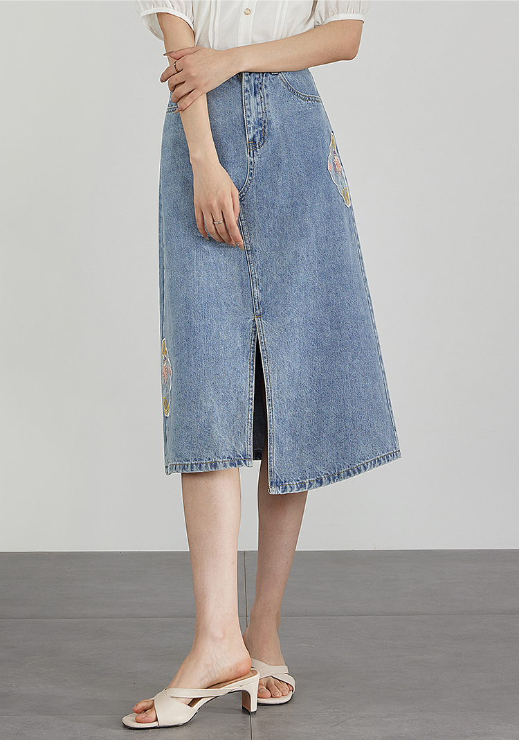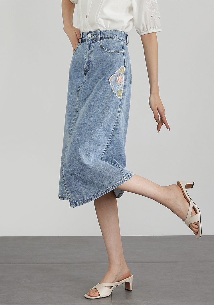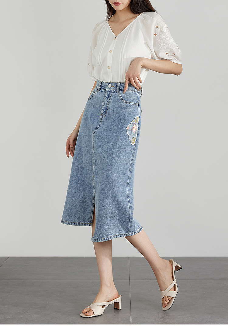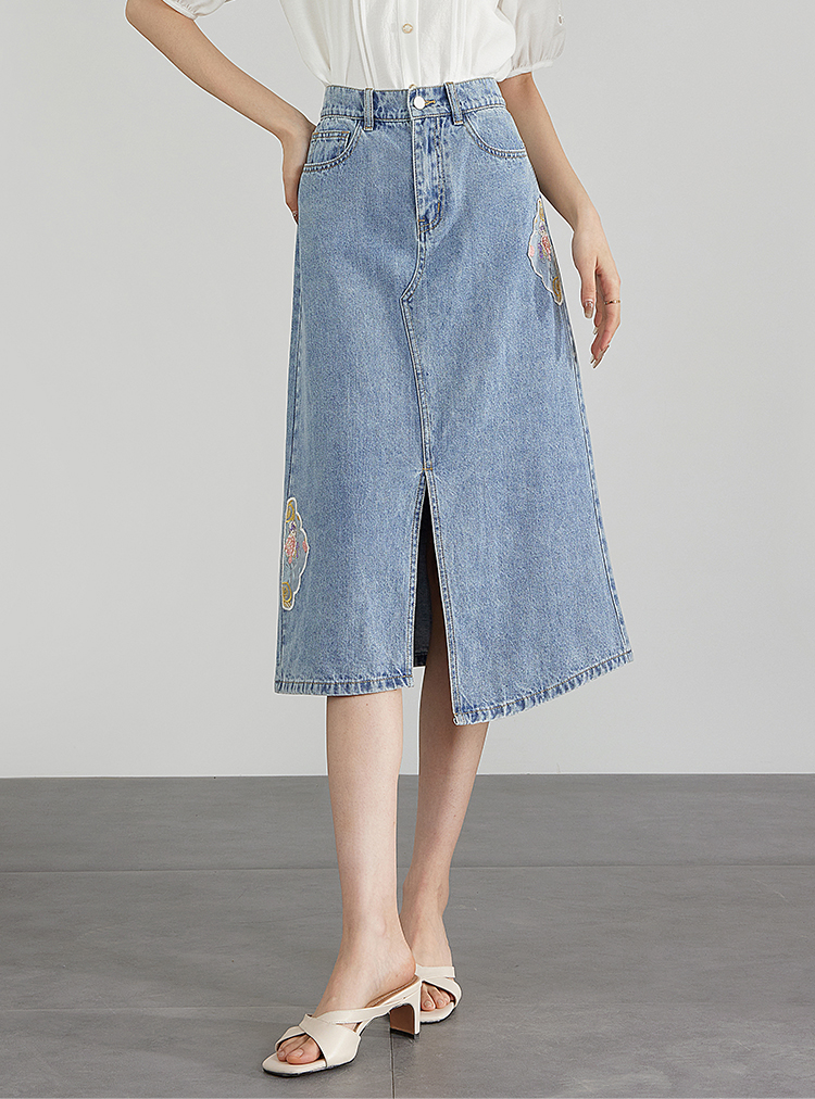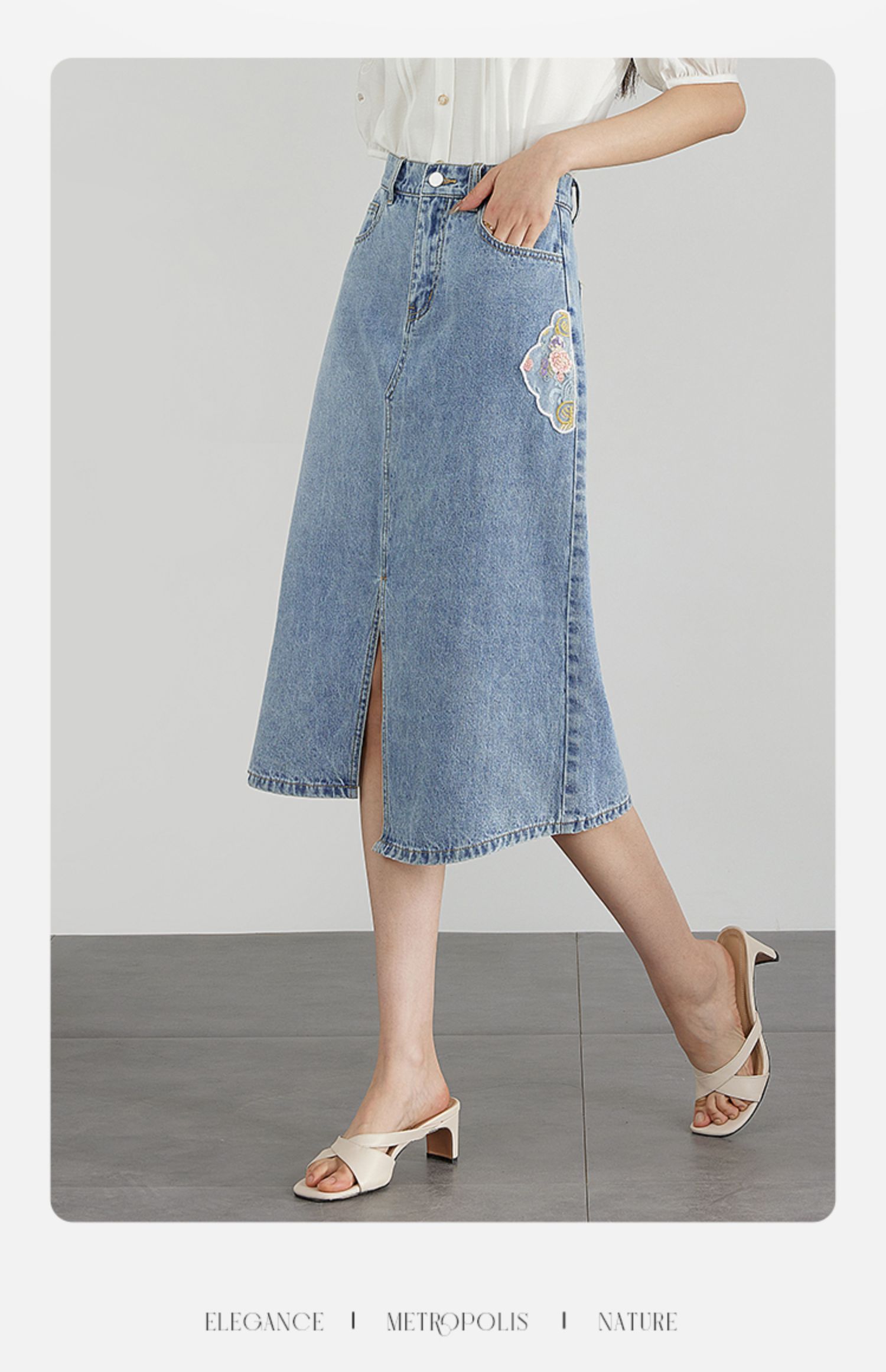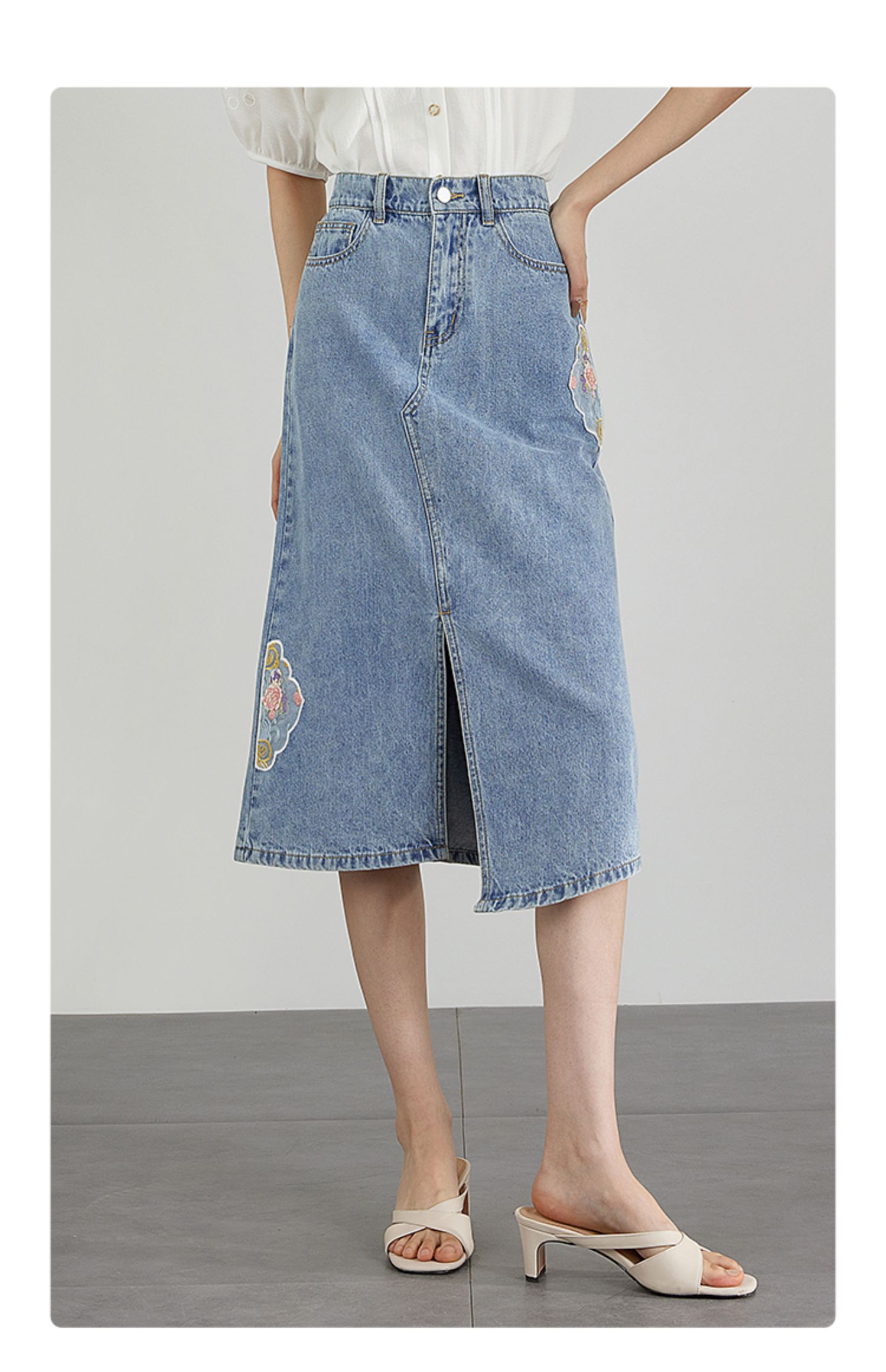 【专属特价】熙世界新中式国风刺绣牛仔半身裙夏季薄新款开叉包臀裙子中长款