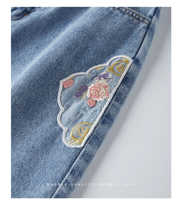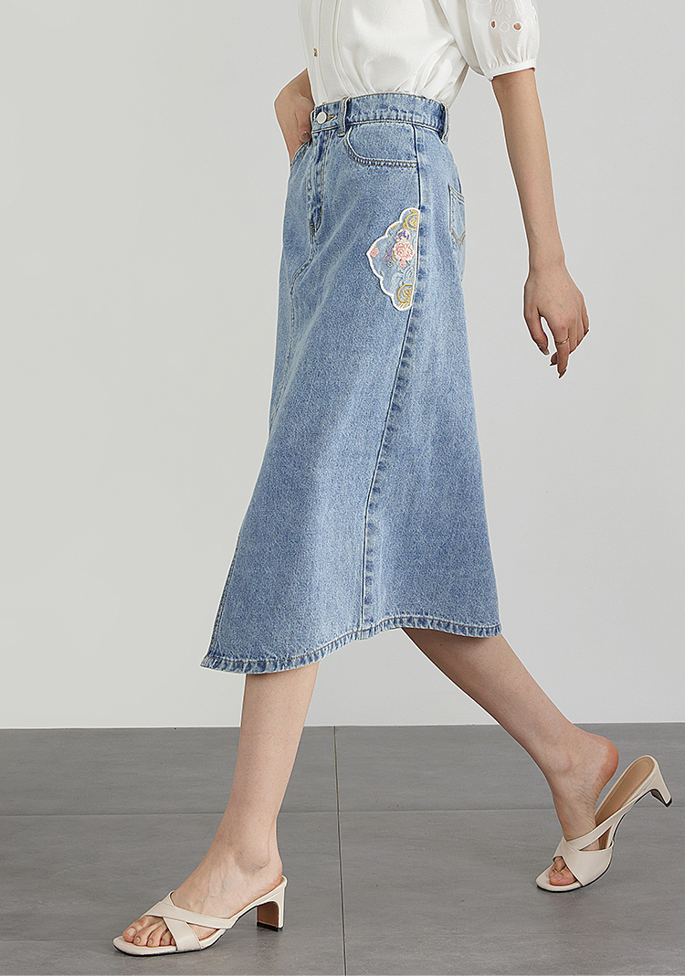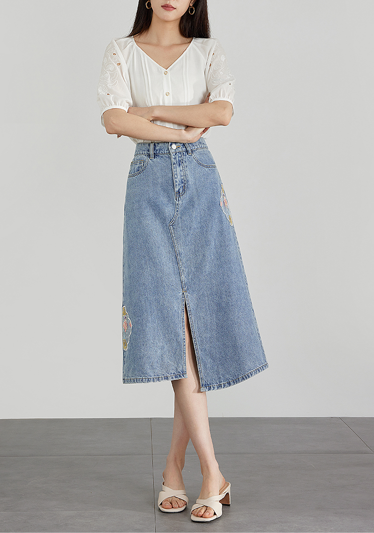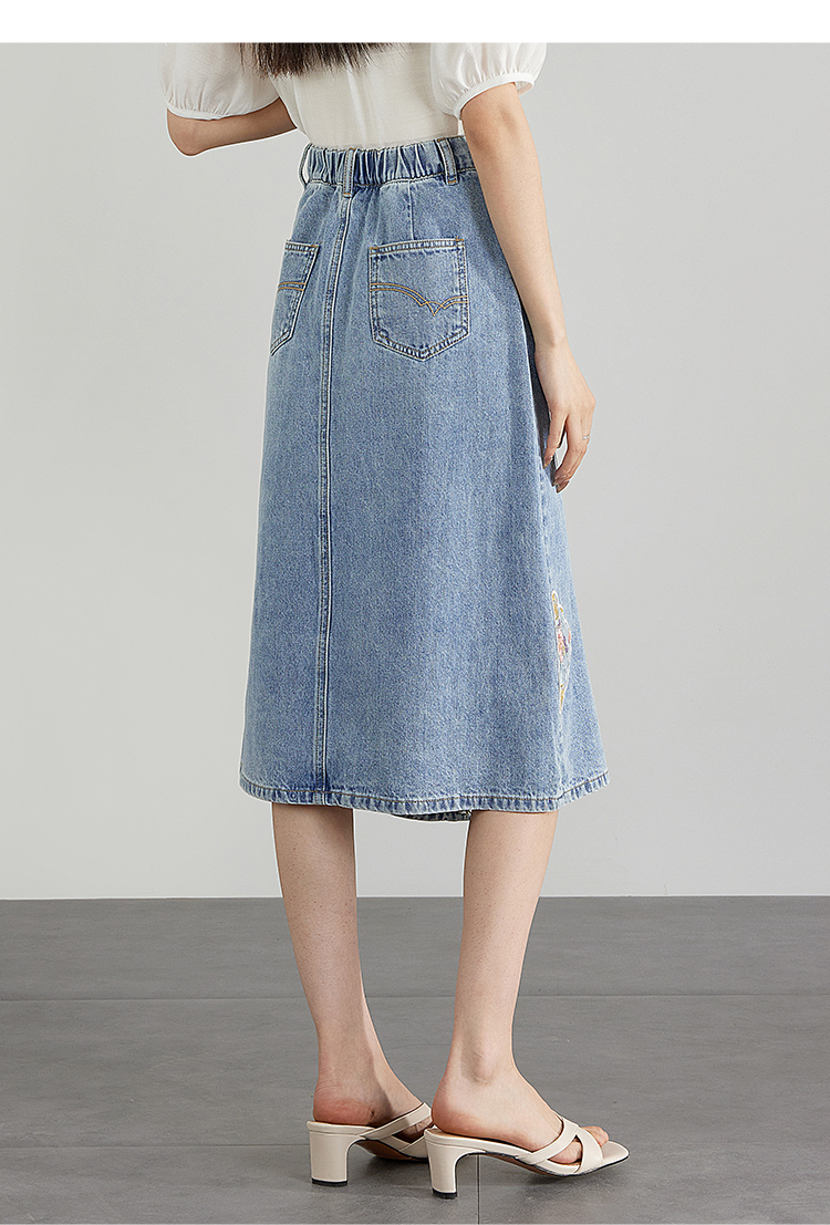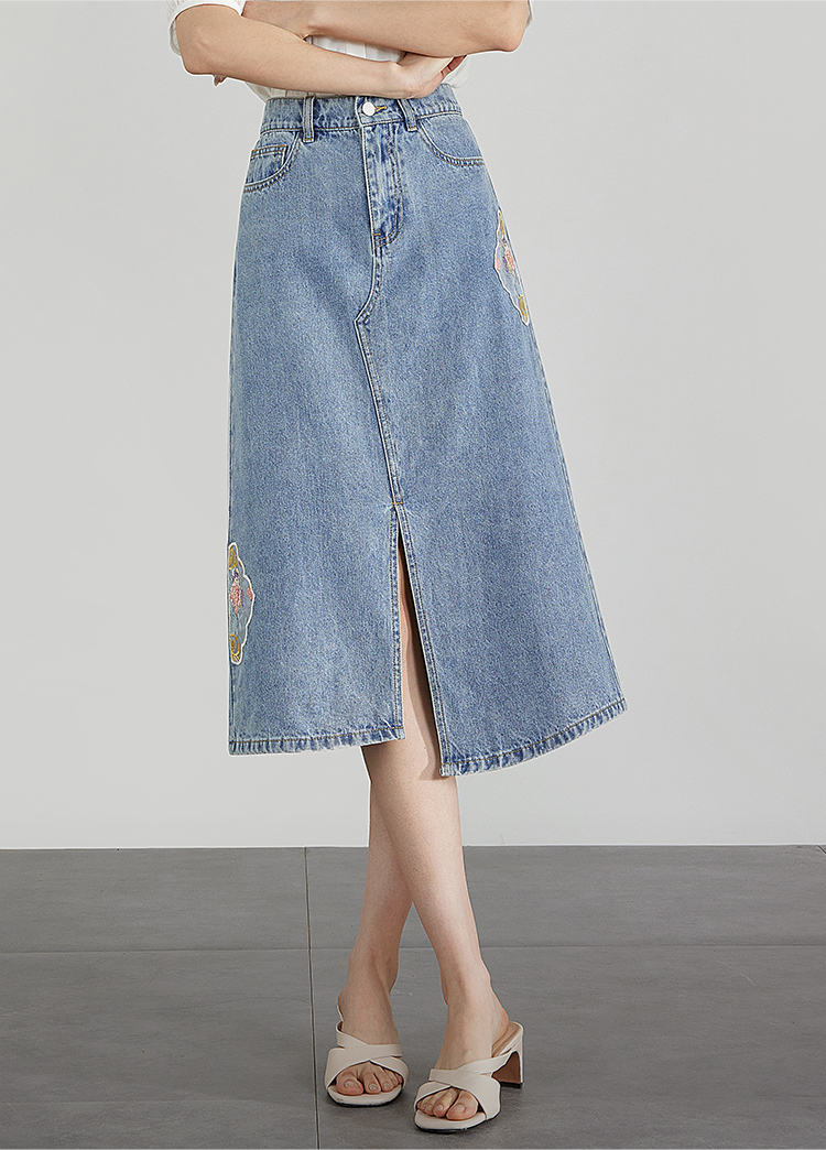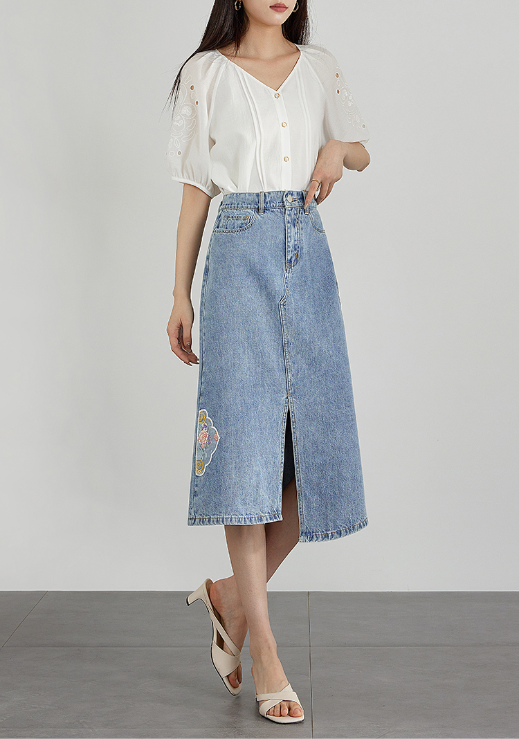 【专属特价】熙世界新中式国风刺绣牛仔半身裙夏季薄新款开叉包臀裙子中长款