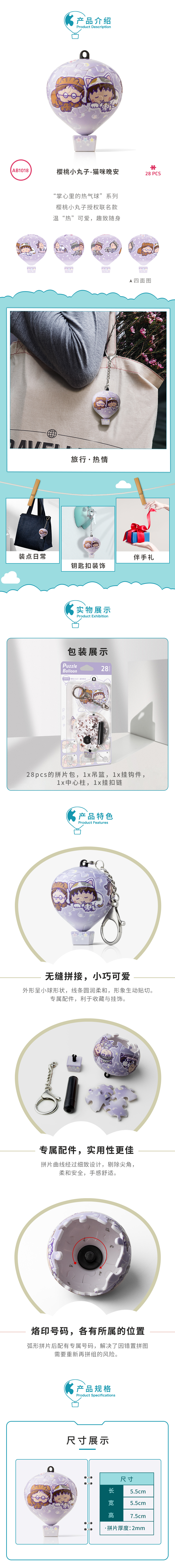 【折扣产品 不退换】28片 热气球造型 钥匙扣拼图AB1018 樱桃小丸子- 猫咪晚安
