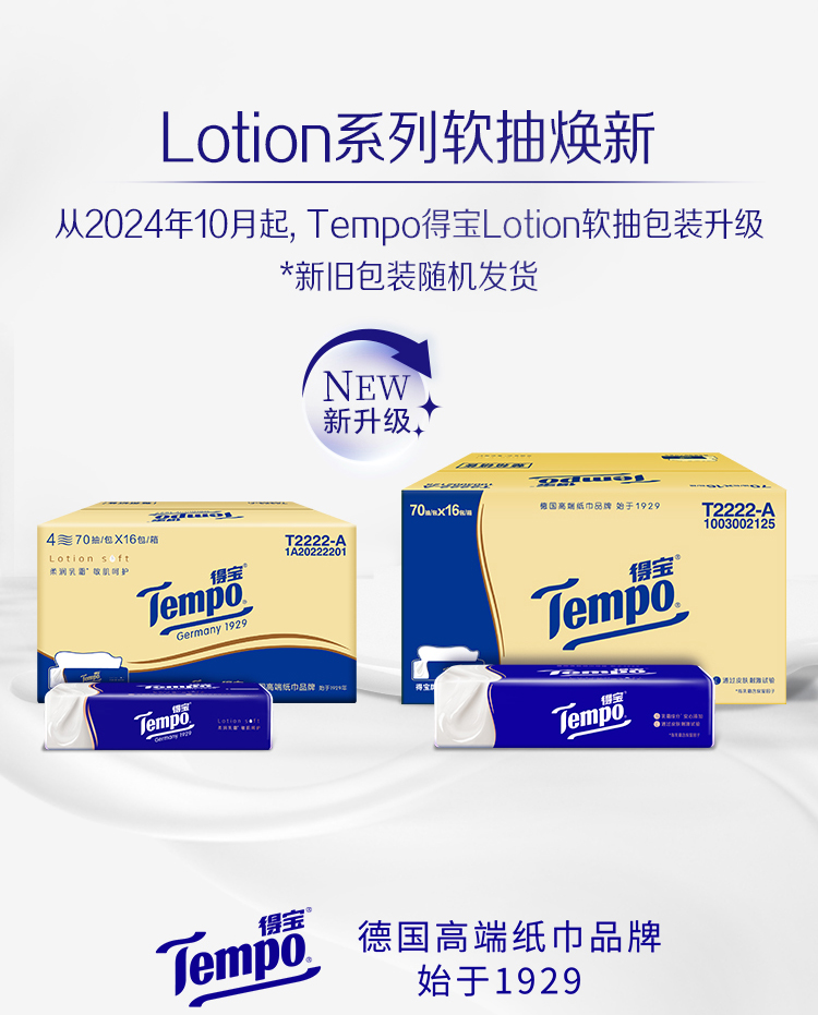 『得宝Tempo』lotion抽取式乳霜柔敏纸面巾70抽*16包/箱