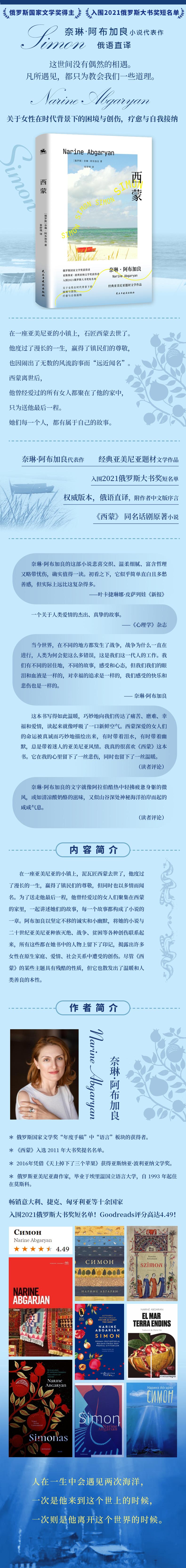 在一座亚美尼亚的小镇上,泥瓦匠西蒙去世了,他度过了漫长的一生,赢得了镇民们的尊敬,但同时也以多情而闻名。为了送走他最后一程,他曾经爱过的女人们聚集在西蒙的家里,一起讲述她们的故事,每一个故事都构成了小说的一章。阿布加良以坚定不移的诚实和小幽默,将她的小说与二十世纪亚美尼亚种族灭绝、战争、贫困等各种创伤联系起来,所有这些都在她书中的人物上留下了印记,揭露出许多女性在原生家庭、爱情、社会关系中遭受的创伤。尽管《西蒙》的某些主题具有残酷的性质,但它也散发出了温暖和人类善良的本性。