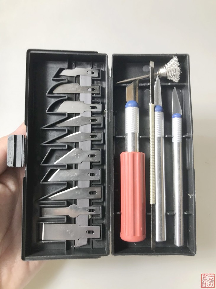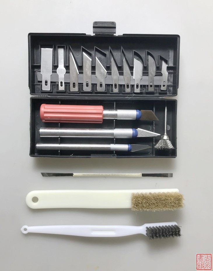 内含:3刀杆、13刀头钱币专用清理刀一盒,钢丝柄刷1支,猪鬃柄刷1支,双刀头钨钢刻刀1支、手持钢刷1支。