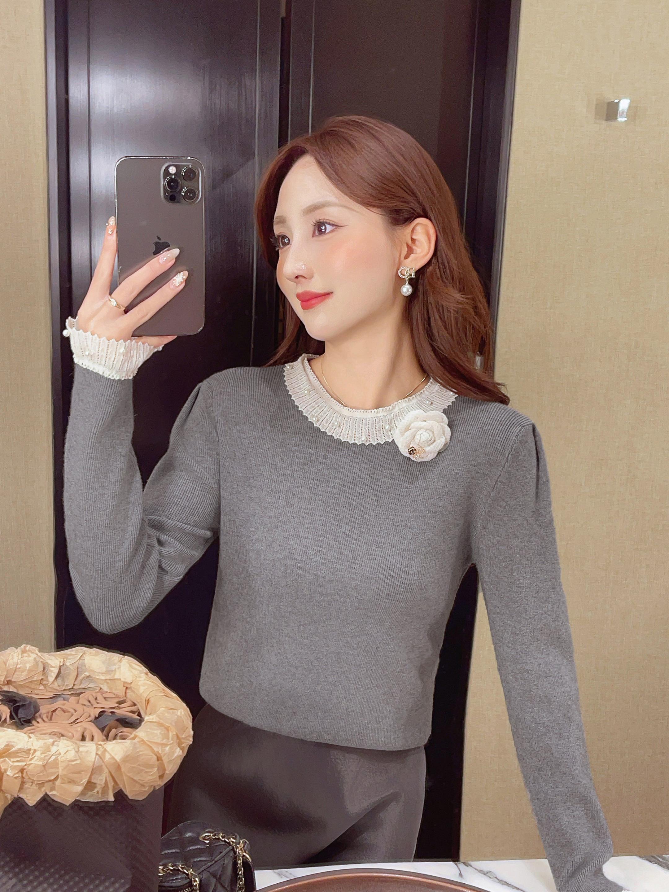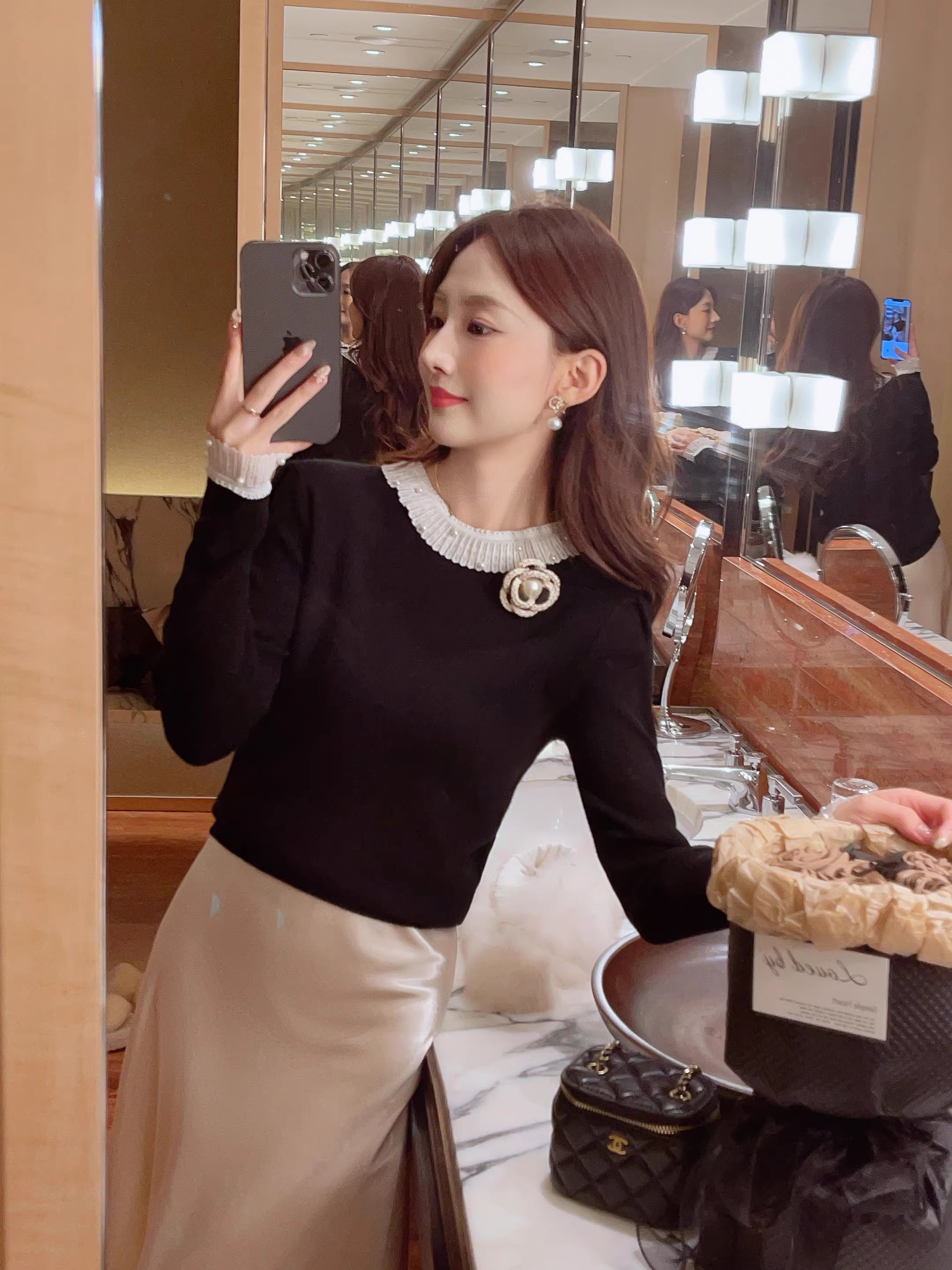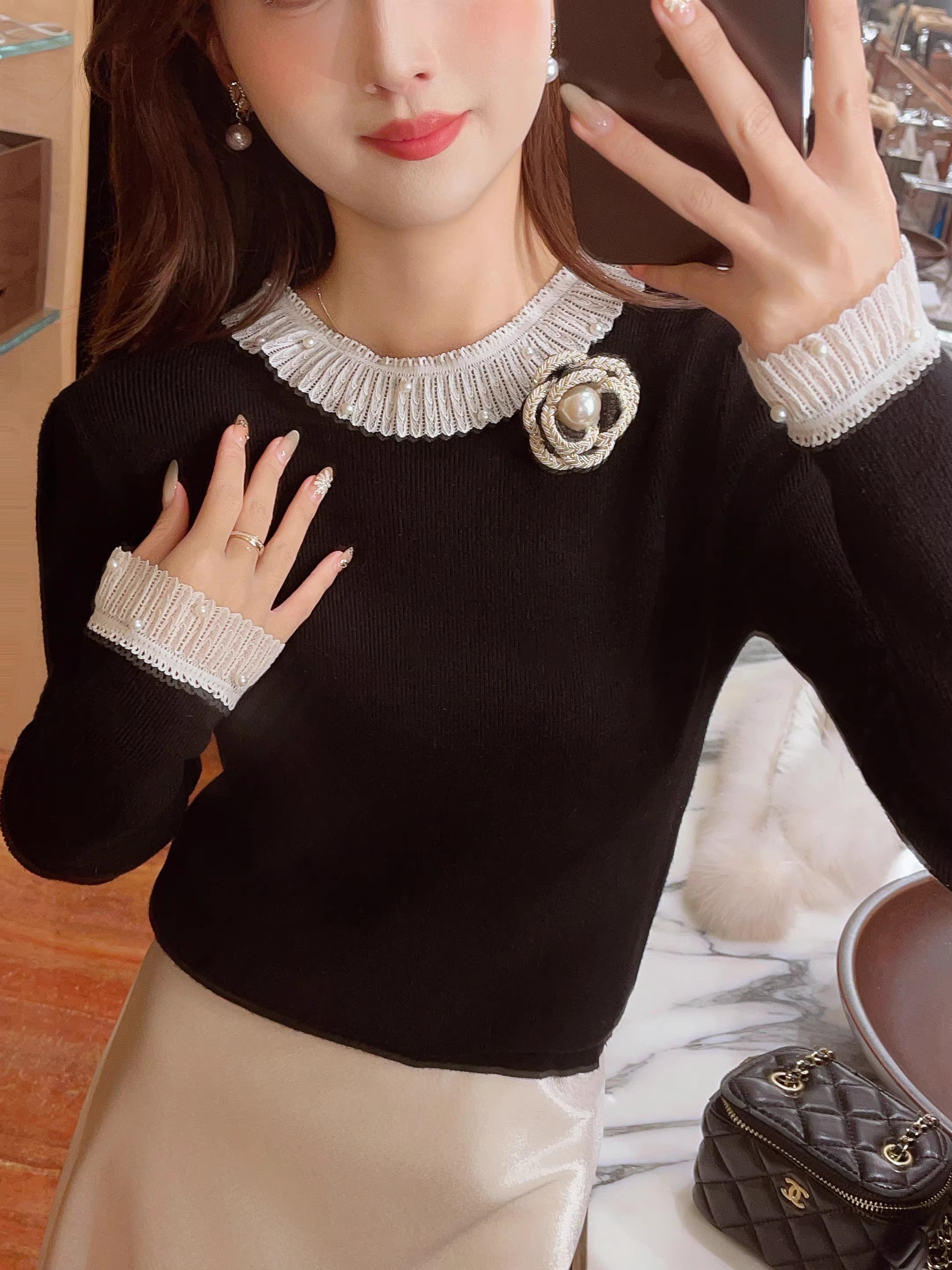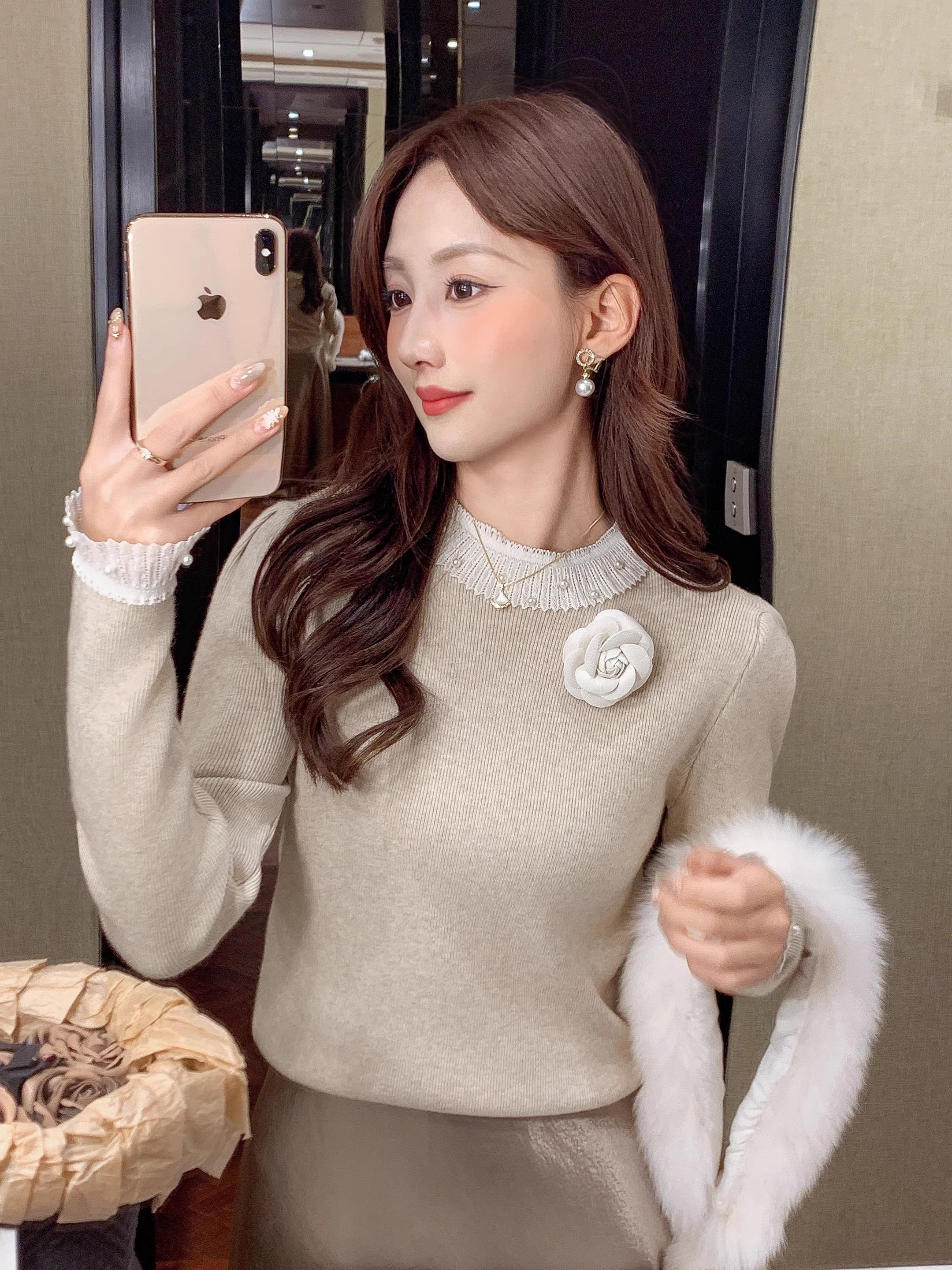 张心子【蕾丝山茶】花边蕾丝钉珠半高领弹力保暖针织衫打底上衣 U2411080