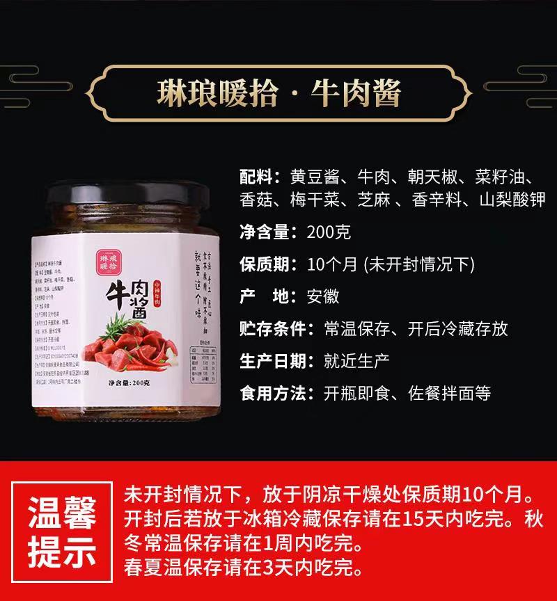 品名:牛肉酱 规格:200g/瓶发货地/产地:安徽/安徽保质期:牛肉酱10个月,番茄牛肉酱90天,建议收到后尽快食用。包装方式:瓶装