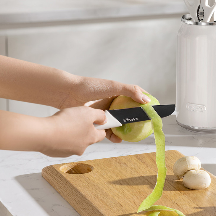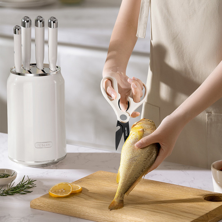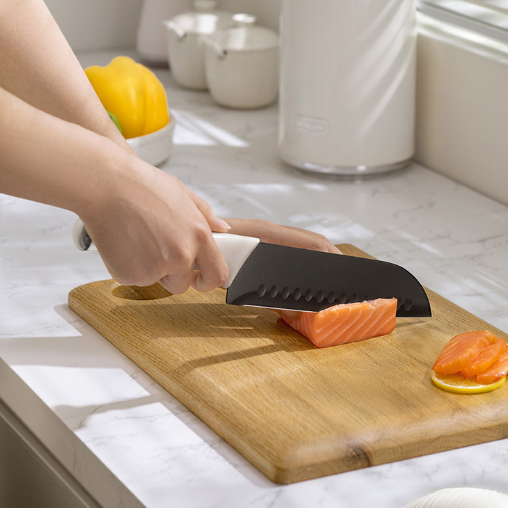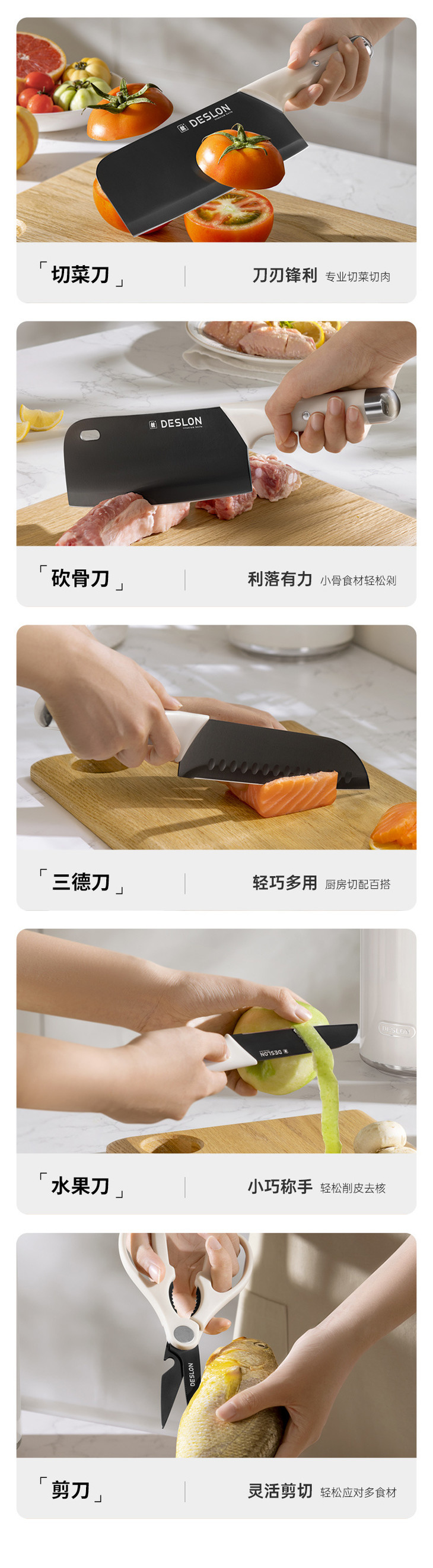 多 道手工开刃,锋利到尖叫 V 型刀刃角度 + 8 道手工开刃工序,刀刃平滑又锋利! ▪️ 切菜刀:切肉切菜唰唰快,洋葱丝、土豆丝轻松切,厨房小白也能切出大厨水准 ▪️ 砍骨刀:对付大骨头毫不费力,过年炖排骨汤再也不用求邻居借刀 ▪️ 三德刀:切水果、切熟食超顺手,一物多用超省心 ▪️ 水果刀:小巧轻便,切橙子、苹果不打滑,给孩子做辅食也放心 ▪️ 剪刀:剪鸡骨、剪葱花、开瓶盖都行,厨房万能小帮手