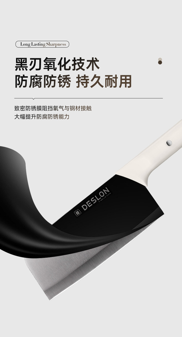 黑刃氧化防锈技术真的绝,洗完随便放也不会锈迹斑斑,用了大半个月还是锃亮,比我之前的碳钢刀耐用一百倍!刀身是40Cr13 不锈钢,