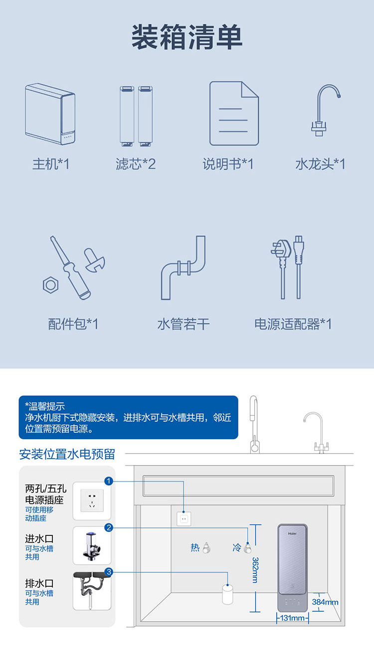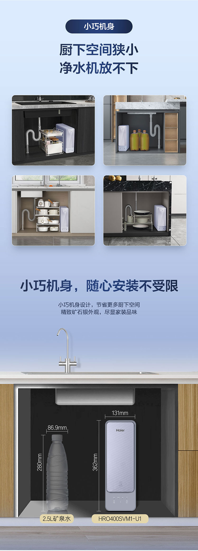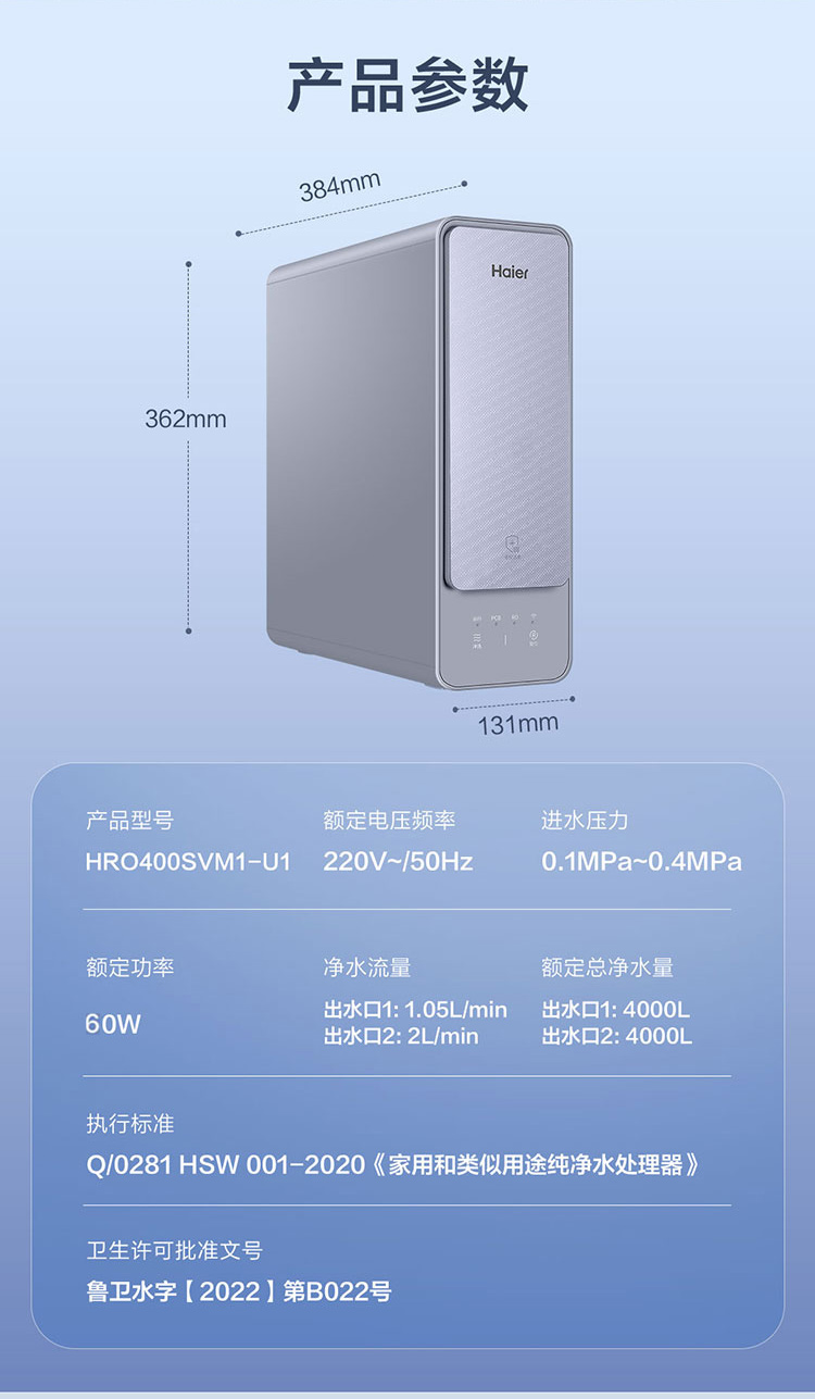 海尔(510531)(Haier)净水器家用直饮厨下式反渗透双出水净水机鲜饮系列线下同款HRO400SVM1-U1