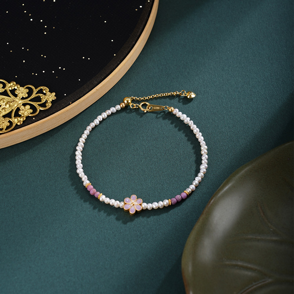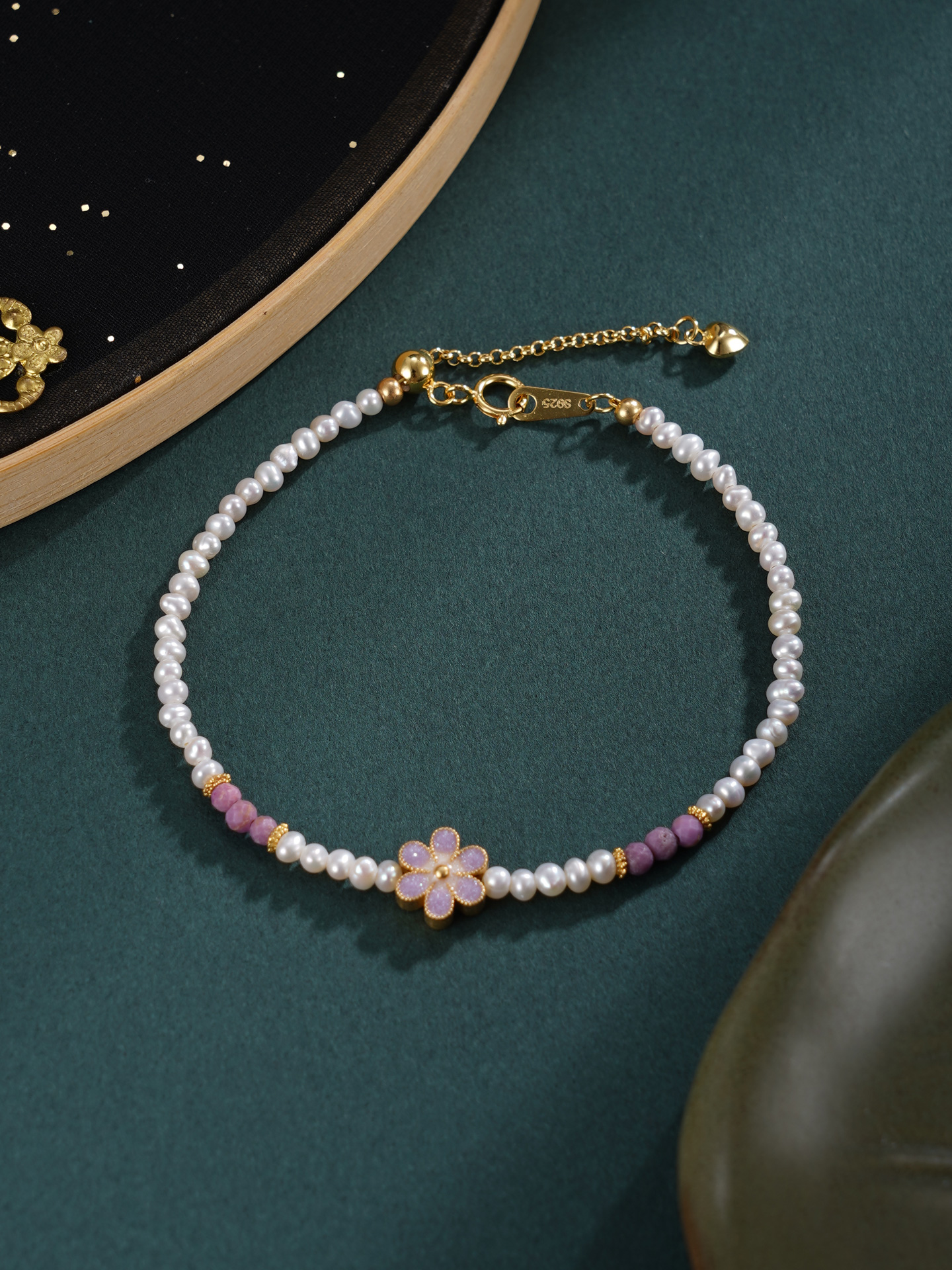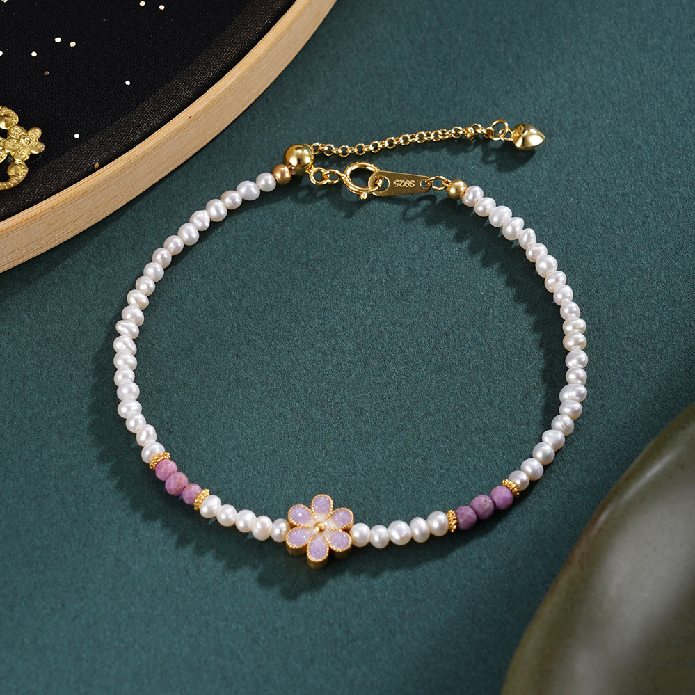 子佩集【紫梦花海】银S925珍珠惜王妃手链【SGB0770001】2.8mm珠镀金紫五瓣花朵2601