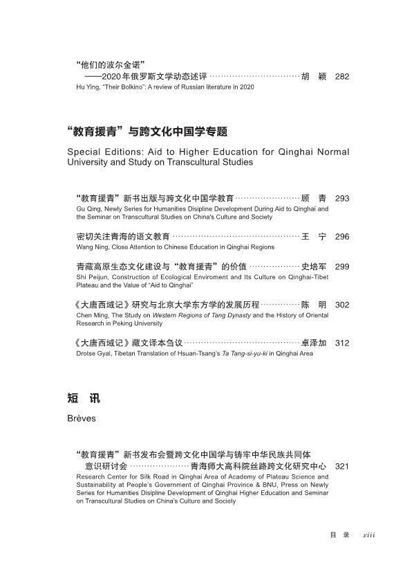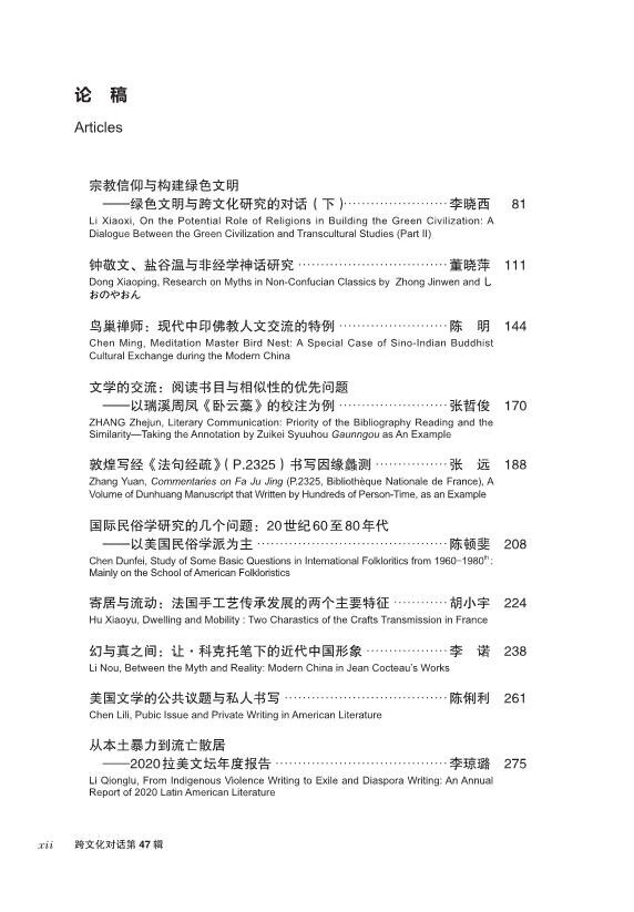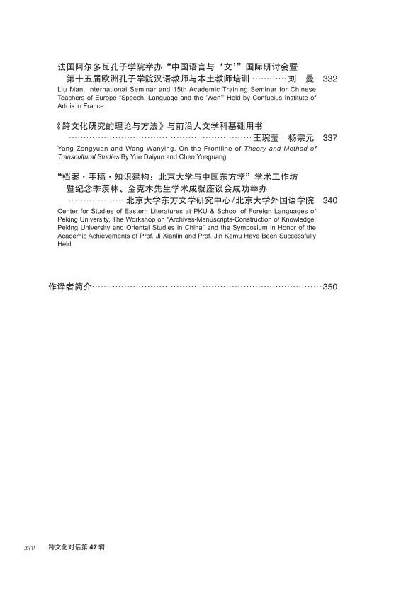 跨文化对话第47辑收入特稿5篇,论稿11篇,“教育援青”与跨文化中国学专题5篇,短讯4篇,共25篇文章,约30万字。本辑继续关注西方汉学史研究,有法国英国比利时汉学史专题文章;同时也关注古代和近代东方文明之间的文化交流,如汉藏学者对《大唐西域记》的研究,近代鸟巢禅师与中印佛教交流等文章。本辑对美国俄罗斯拉美文坛动态也有专门介绍,体现了比较文学与跨文化研究视角。会议简讯部分聚焦法国阿尔多瓦孔子学院国际研讨会和“教育援青”新书发布会与跨文化中国学研讨会。