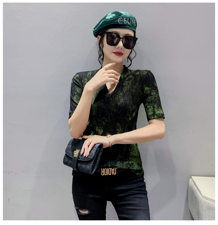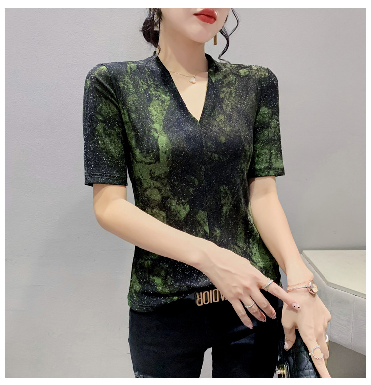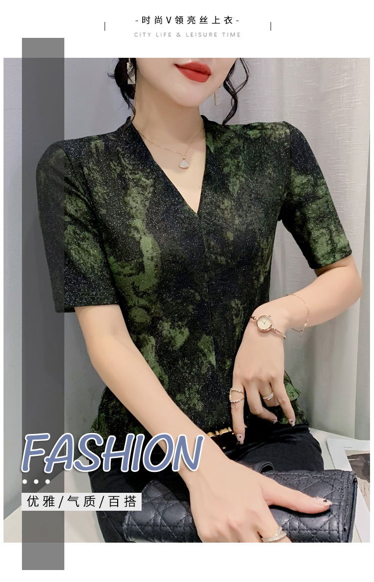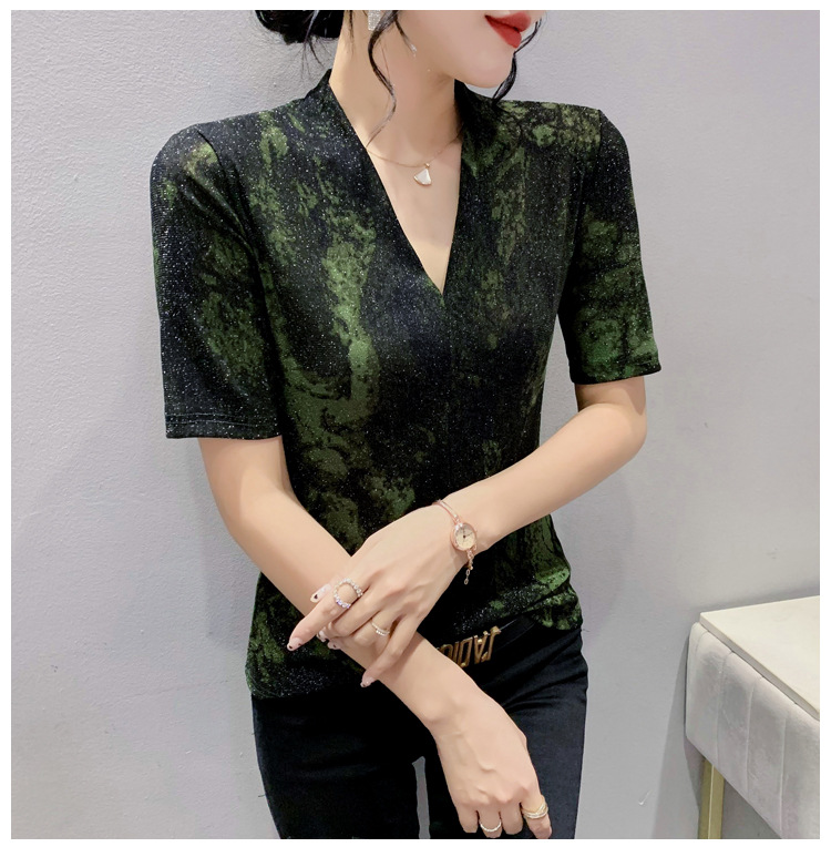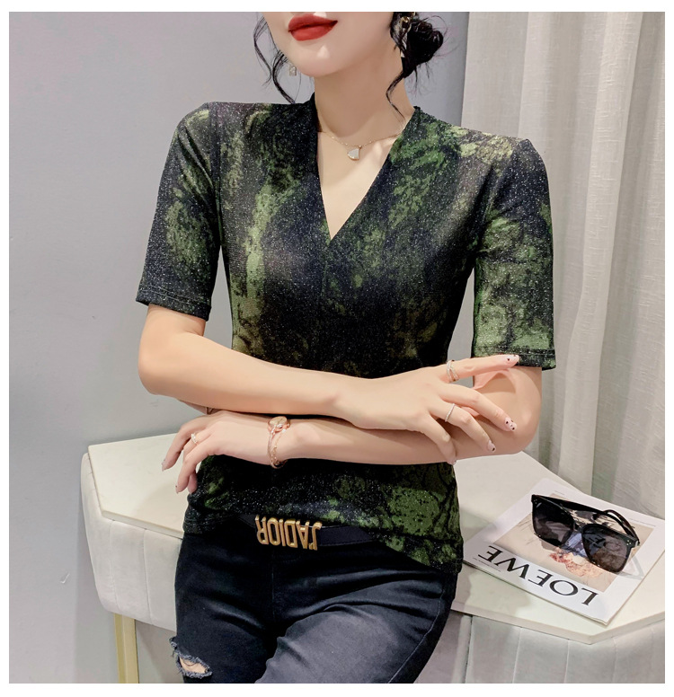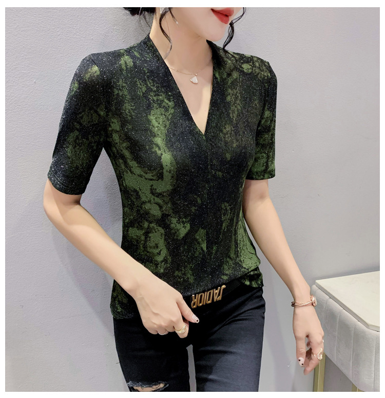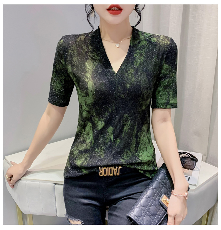 2022新款夏款洋气小衫,时髦v领亮丝网纱打底衫T恤 KQL9991
