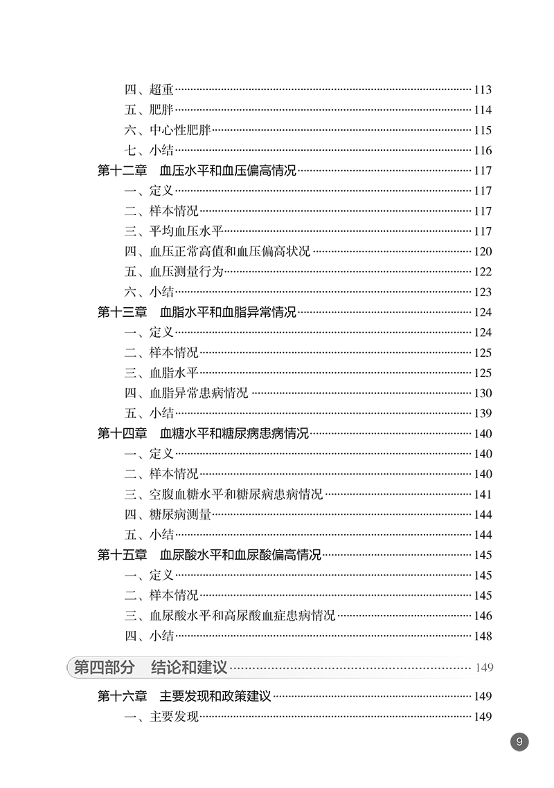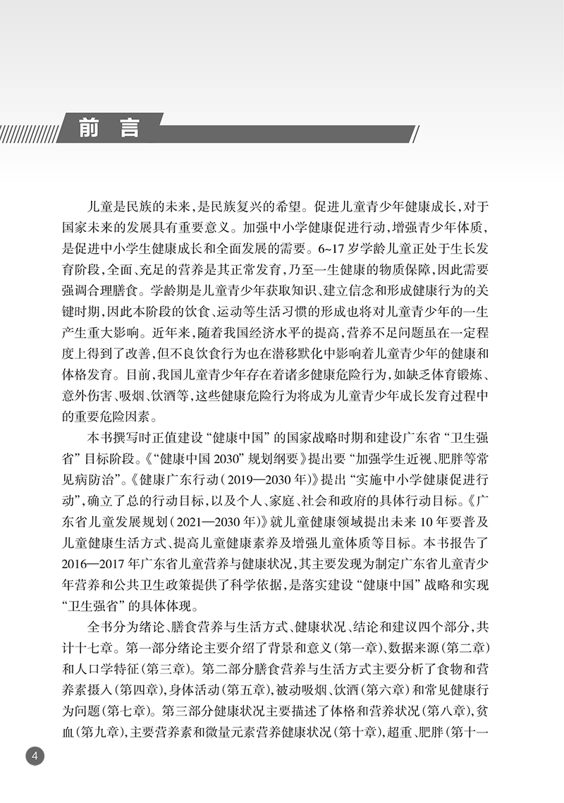 第一部分 绪论 /1 第一章 背景和意义/ 1 第二章 数据来源/3 一、 调查目的/ 3 二、 对象和内容/ 3 三、 质量控制和评价/ 6 四、 数据清理和分析/ 8 第三章 人口学特征/12 一、 性别和年龄/ 12 二、 父母及看护人文化程度/13 三、 父母民族和职业分布/ 14 四、 家庭人均年收入分布/ 15 第二部分 膳食营养与生活方式/ 17 第四章 食物和营养素摄入/17 一、 样本情况/17 二、 食物摄入情况/ 18 三、 能量和主要营养素摄入情况/ 27 四、 小结/33 第五章 身体活动/ 34 一、 定义/34 二、 样本情况/35 三、 身体活动情况/ 35 四、 小结/47 第六章 被动吸烟、饮酒/48 一、 定义/48 二、 样本情况/48 三、 被动吸烟、饮酒情况/49 四、 小结/54 第七章 常见健康行为问题/55 一、 定义/55 二、 样本情况/56 三、 调查结果/59 四、 小结/80 第三部分 健康状况 / 81 第八章 体格和营养状况/ 81 一、 定义/81 二、 样本情况/82 三、 体格发育状况/ 82 四、 营养不良状况/ 87 五、 小结/90 第九章 贫血/91 一、 定义/91 二、 样本情况/91 三、 铁蛋白、转铁蛋白受体、血红蛋白水平/92 四、 小结/97 第十章 主要营养素和微量元素营养健康状况/98 一、 定义/98 二、 样本情况/99 三、 维生素A 和维生素D 营养状况/ 99 四、 锌和碘营养状况/ 105 五、 小结/ 109 第十一章 超重、肥胖/ 111 一、 定义/ 111 二、 样本情况/ 111 三、 身高、体重、体重指数和腰围情况/111 四、 超重/ 113 五、 肥胖/ 114 六、 中心性肥胖/115 七、 小结/ 116 第十二章 血压水平和血压偏高情况/117 一、 定义/ 117 二、 样本情况/ 117 三、 平均血压水平/ 117 四、 血压正常高值和血压偏高状况/ 120 五、 血压测量行为/ 122 六、 小结/ 123 第十三章 血脂水平和血脂异常情况/124 一、 定义/ 124 二、 样本情况/ 125 三、 血脂水平/ 125 四、 血脂异常患病情况/130 五、 小结/ 139 第十四章 血糖水平和糖尿病患病情况/ 140 一、 定义/ 140 二、 样本情况/ 140 三、 空腹血糖水平和糖尿病患病情况/141 四、 糖尿病测量/144 五、 小结/ 144 第十五章 血尿酸水平和血尿酸偏高情况/145 一、 定义/ 145 二、 样本情况/ 145 三、 血尿酸水平和高尿酸血症患病情况/ 146 四、 小结/ 148 第四部分 结论和建议/ 149 第十六章 主要发现和政策建议/ 149 一、 主要发现/ 149 二、 政策建议/ 151 第十七章 膳食指导/ 154 一、 儿童青少年的膳食指导原则/ 154 二、 广东地区儿童青少年的膳食建议/157 三、 广东省6~17 岁儿童膳食建议/161 参考文献 /166 附 录 / 169 附录一 2016—2017 年广东省儿童乳母营养健康调查抽样流程/ 169 附录二 调查内容及质量控制方案/ 170 一、 不同调查对象及调查内容/170 二、 询问调查和膳食调查质量控制方法/ 171 附录三 医学体检方法及质量控制方案/ 173 一、 医学体检方法/ 173 二、 医学体检质量控制方法/ 176 附录四 实验室检测方法及质量控制方案/178 一、 实验室检测方法/ 178 二、 实验室检测的质量控制/ 183 附录五 膳食调查相关结果/ 186 附录六 各调查点情况/214 附录七 参加调查工作人员名单/ 224