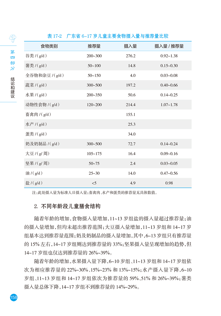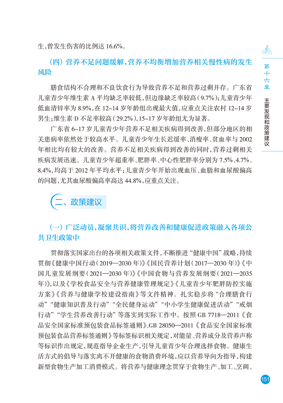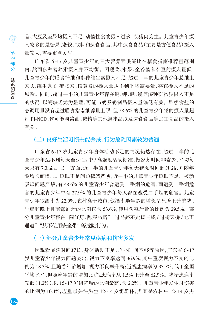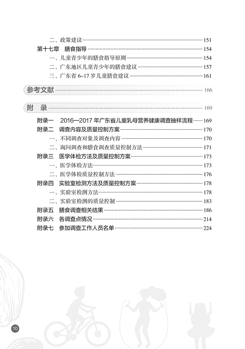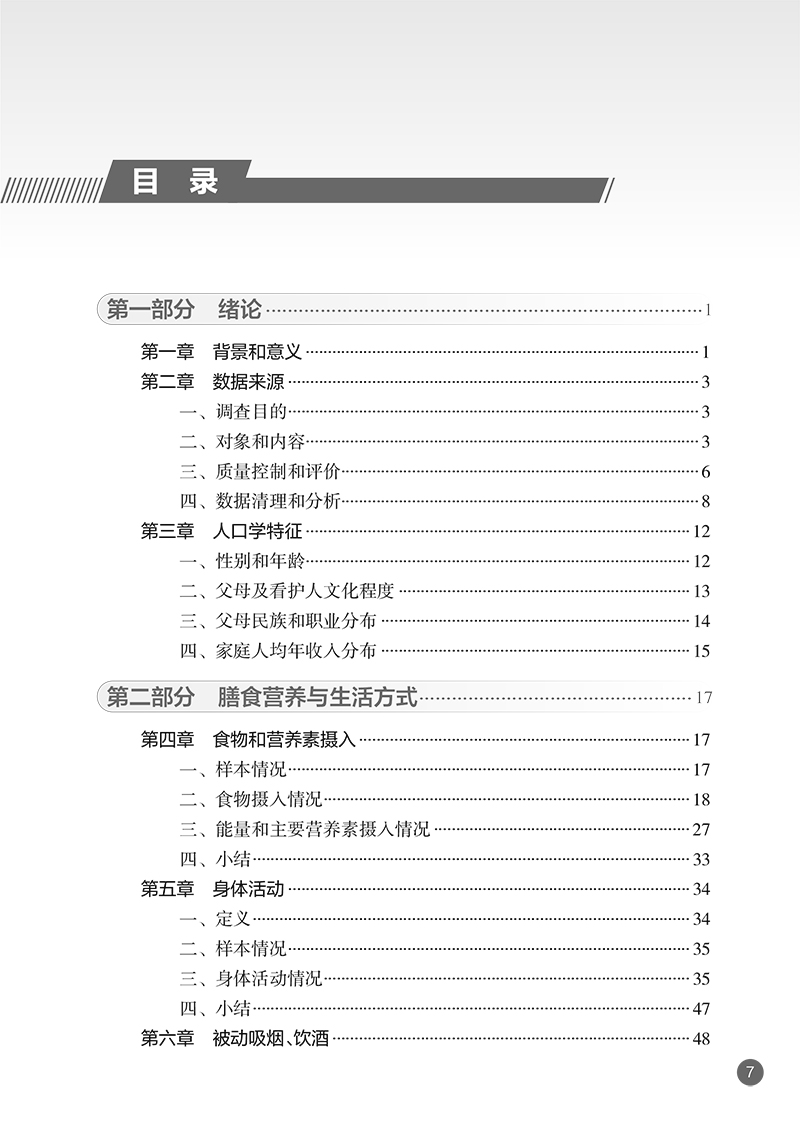 本书通过多阶段整群分层随机抽样方法,抽取了广东省13个县区3644名6~17岁儿童青少年,对其开展询问调查、医学体检、实验室检测和膳食调查,包括测量身高、体重、腰围和血压,进行3天24小时膳食回顾,收集食物摄入数据等。 全书共分总论、膳食营养和生活方式、健康状况、主要发现和建议4个部分,分析项目涵盖食物和营养摄入、身体活动、吸烟、饮酒、口腔、视力、哮喘、体格和营养状况、贫血、超重/肥胖、血压水平、血糖水平、尿酸水平等10余项健康指标,并在此基础上对数据进行分析,总结归纳了广东省儿童青少年的膳食营养状况和问题,最终提出相应的饮食指导和建议。
