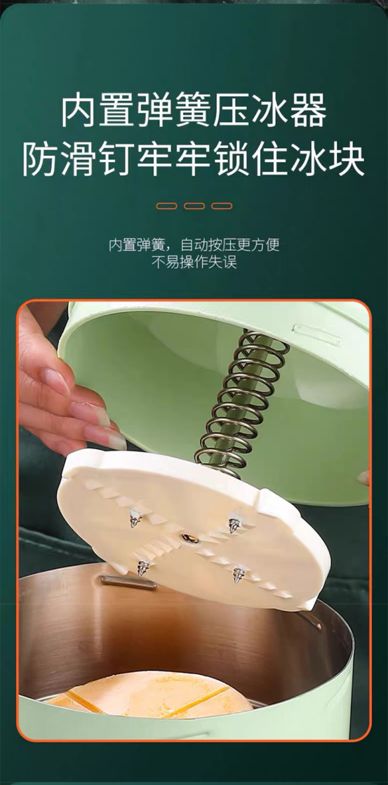 手摇制作绵绵冰,体验感拉满 在家享受健康DIY冰沙冷饮 内置弹簧压冰器,固定冰块易旋转 附带冷冻盒,轻松GET冰块 4步操作,轻松摇冰