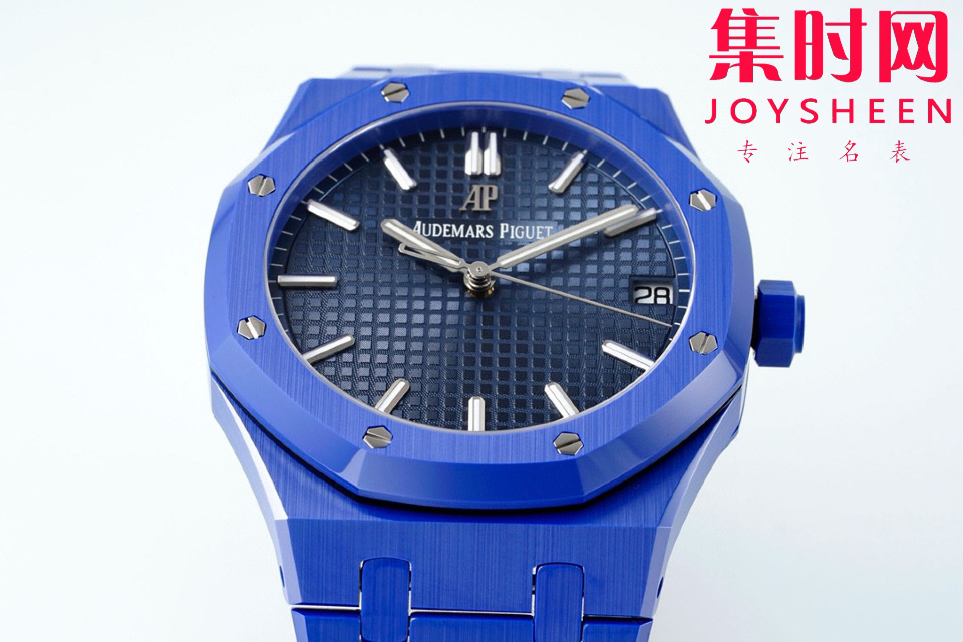 一体式结构:表壳与表带无缝衔接,延续皇家橡树标志性八角形表圈和“Tapisserie”格纹表盘,陶瓷材质赋予现代感。