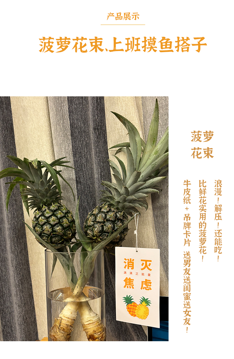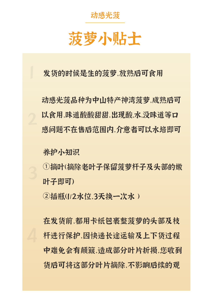 3.动感光菠养护小知识:①摘叶(摘除老叶子保留菠萝杆子及头部的嫩叶子即可)②插瓶(1/2水位,3天换一次水 )