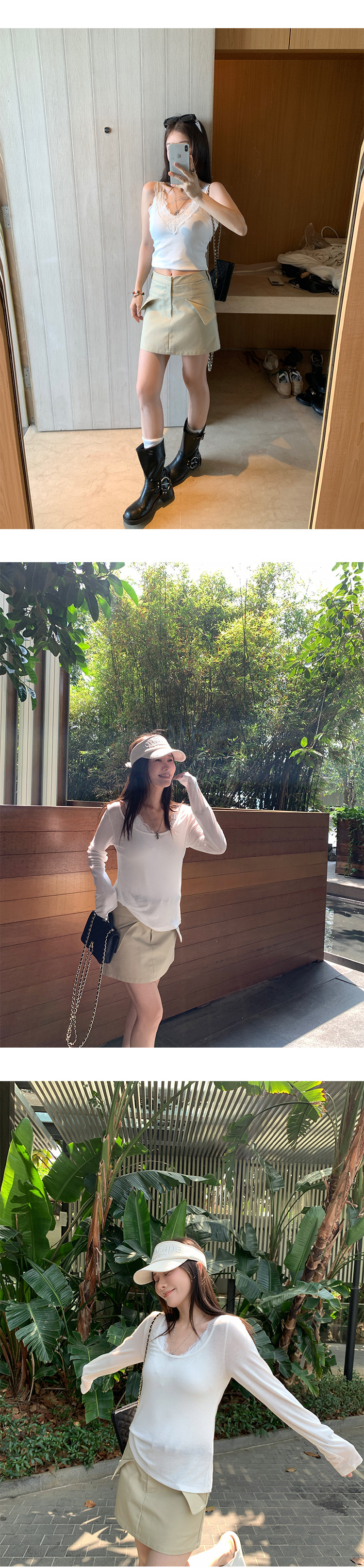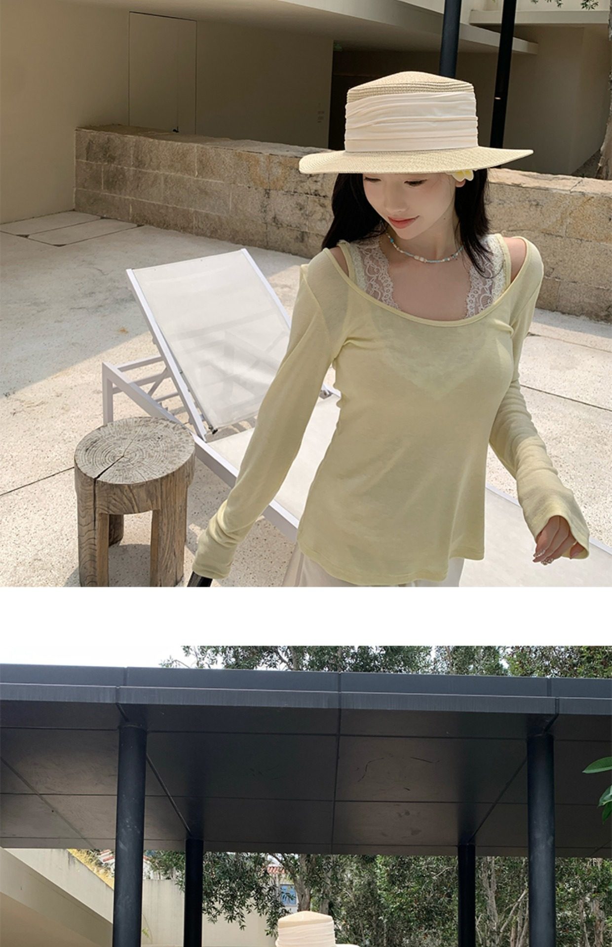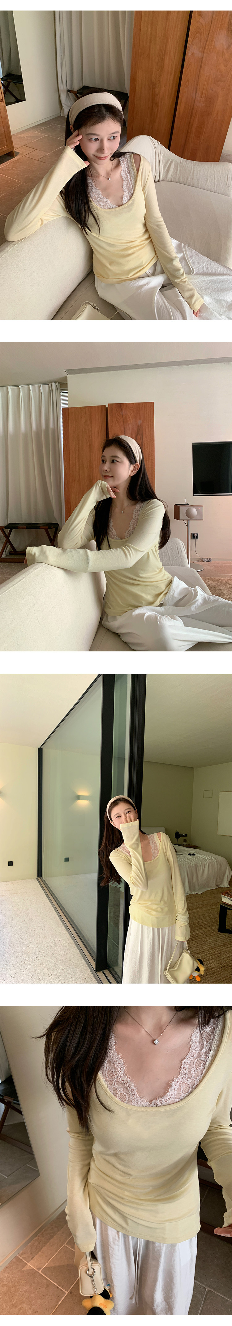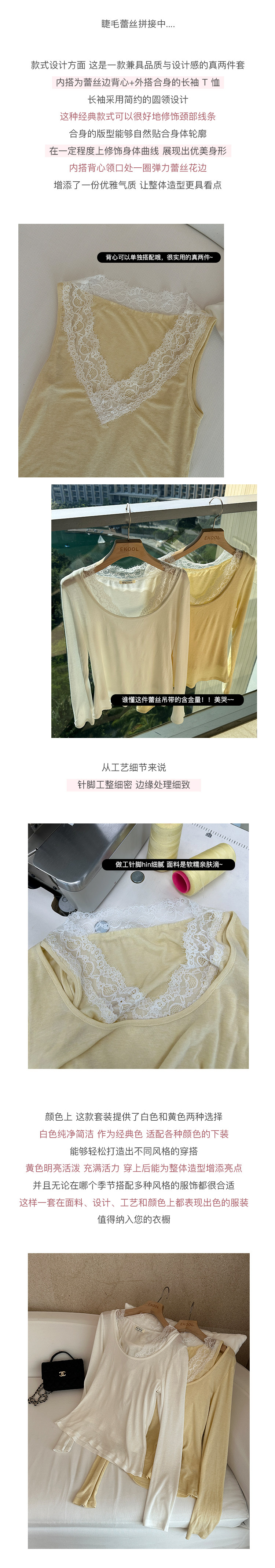 EKOOL衣库天丝羊毛圆领长袖T恤女夏季新款蕾丝花边吊带背心两件套