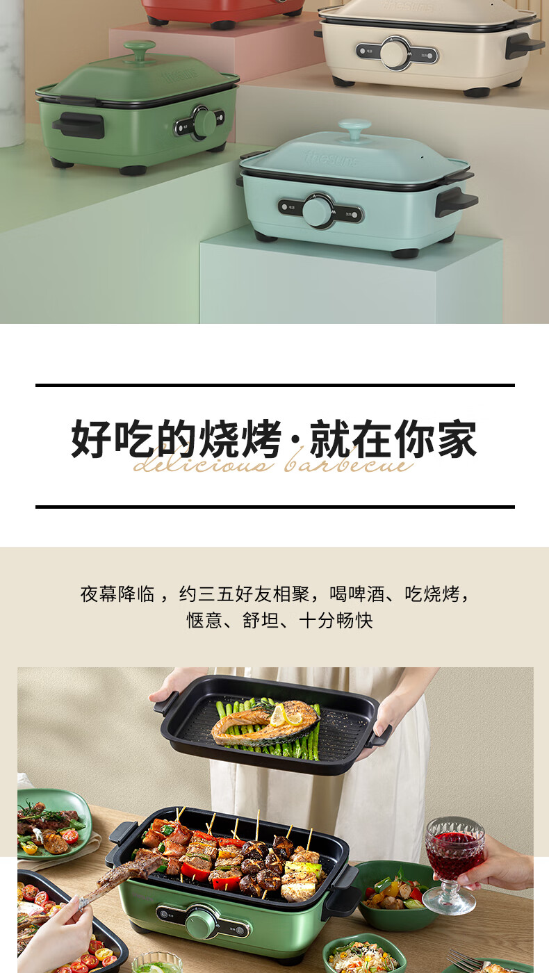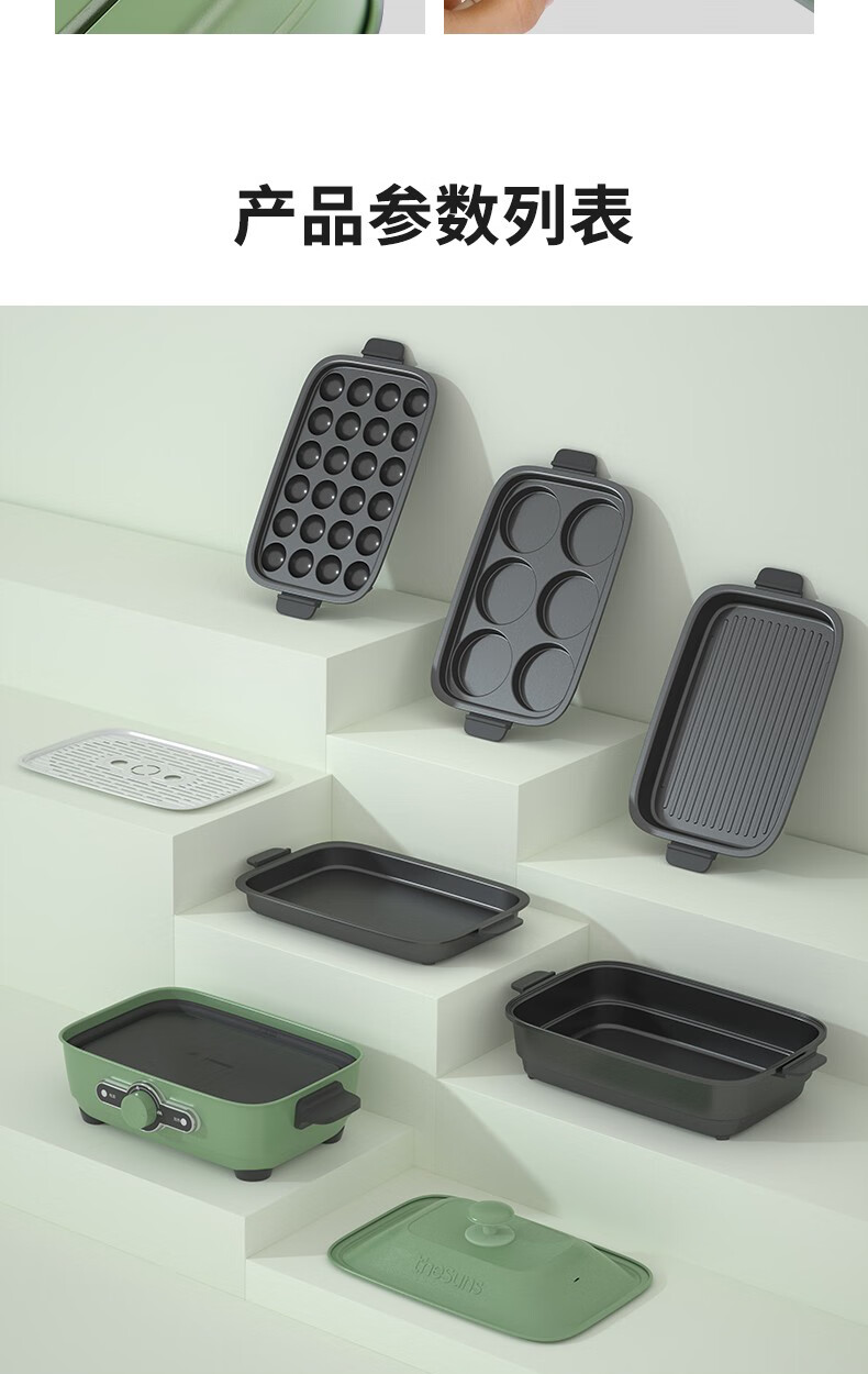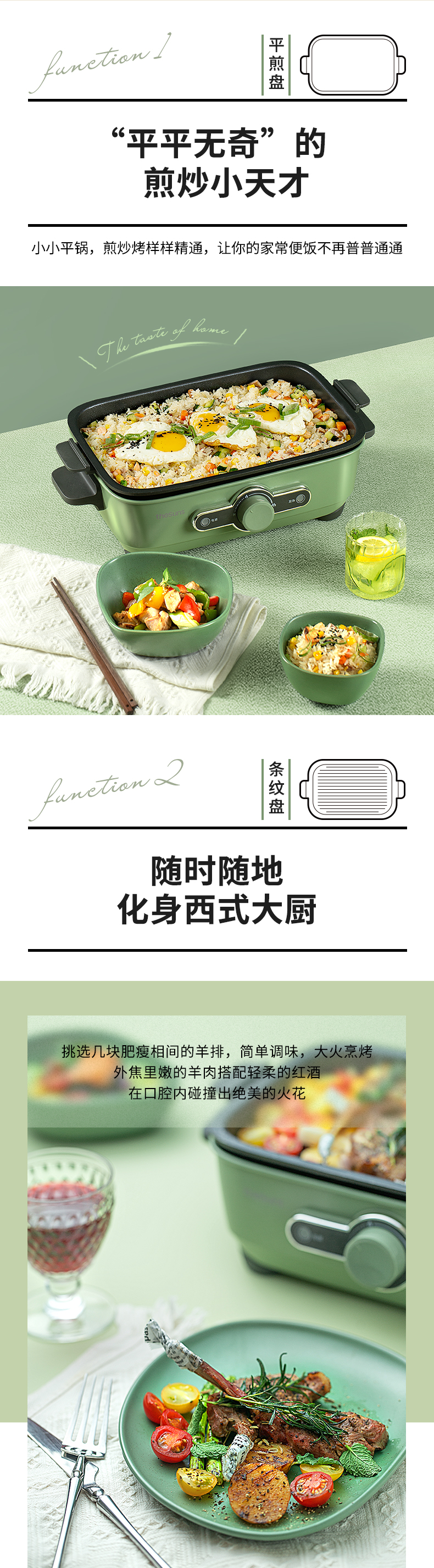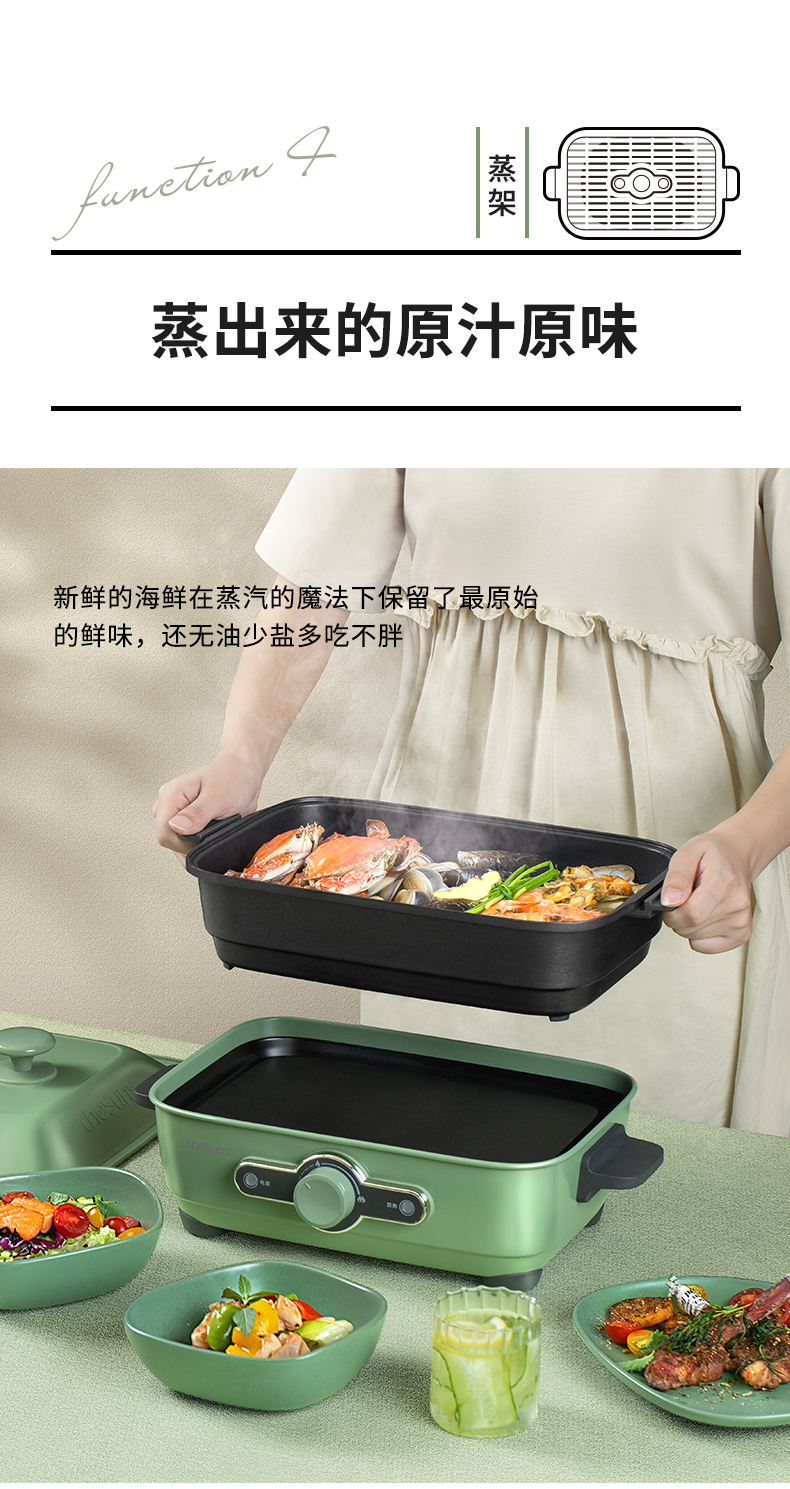 三食黄小厨 多功能锅网红料理锅电火锅锅家用电热炒锅烤肉蒸炒烧烤煎涮烤一体多用途电炖煮锅 复古绿+专业款(平煎盘+深锅+蒸架+条纹盘)