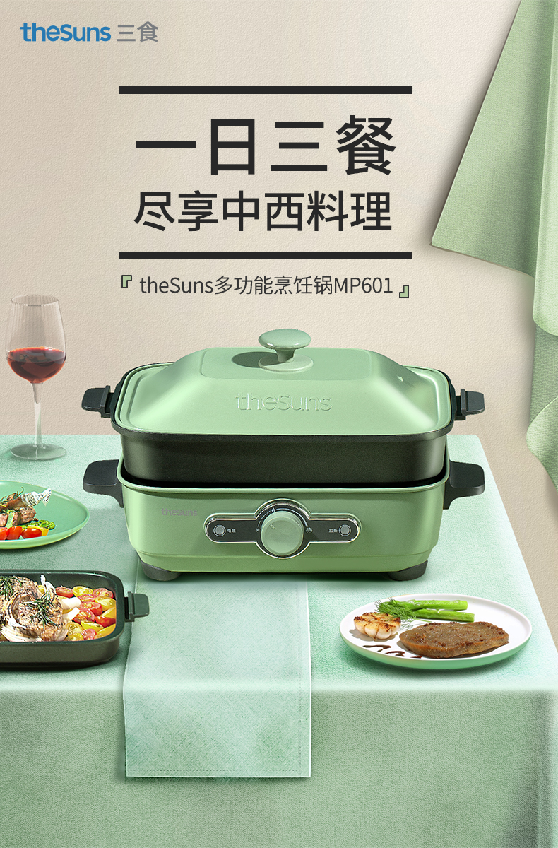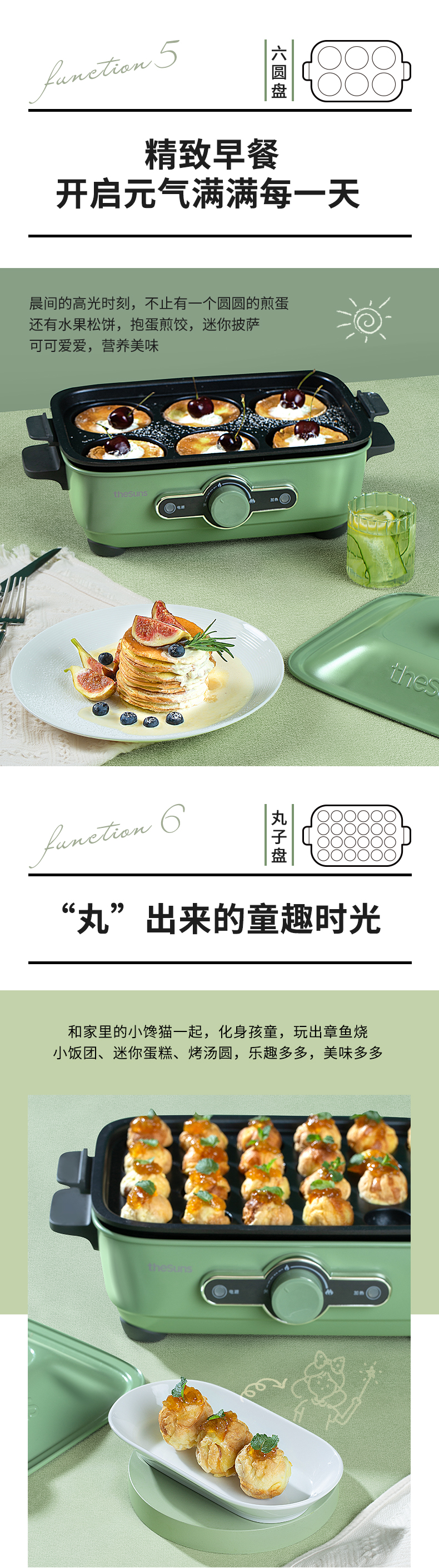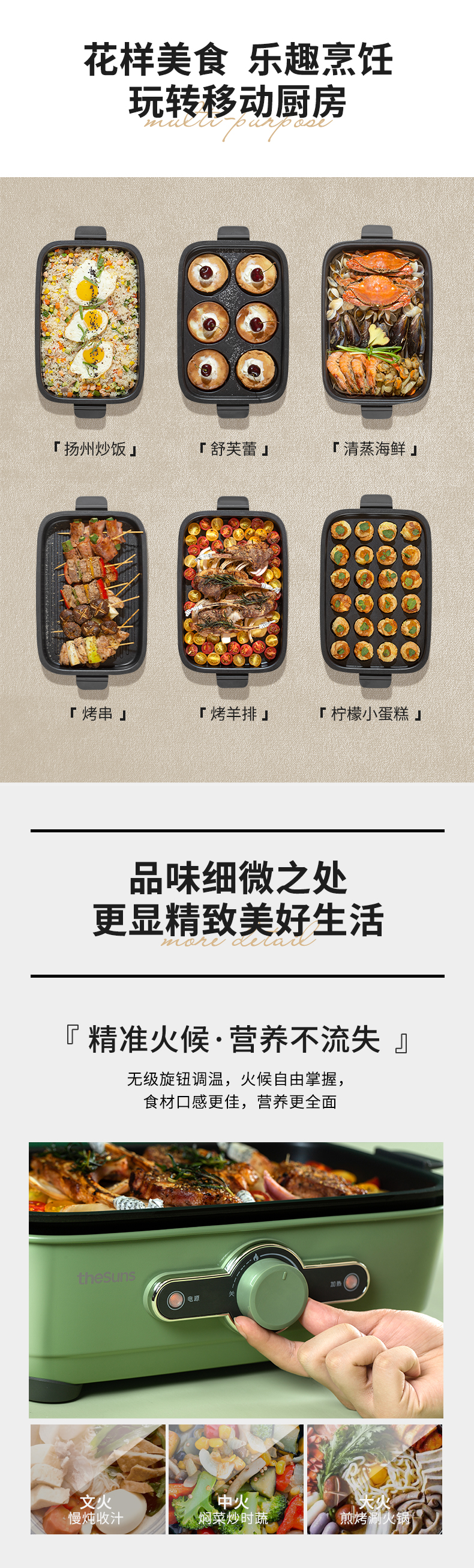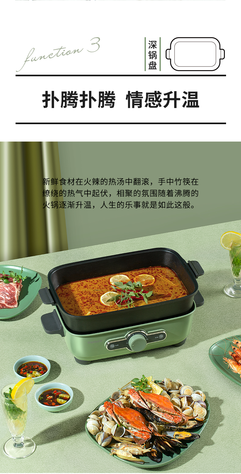 三食黄小厨 多功能锅网红料理锅电火锅锅家用电热炒锅烤肉蒸炒烧烤煎涮烤一体多用途电炖煮锅 复古绿+专业款(平煎盘+深锅+蒸架+条纹盘)