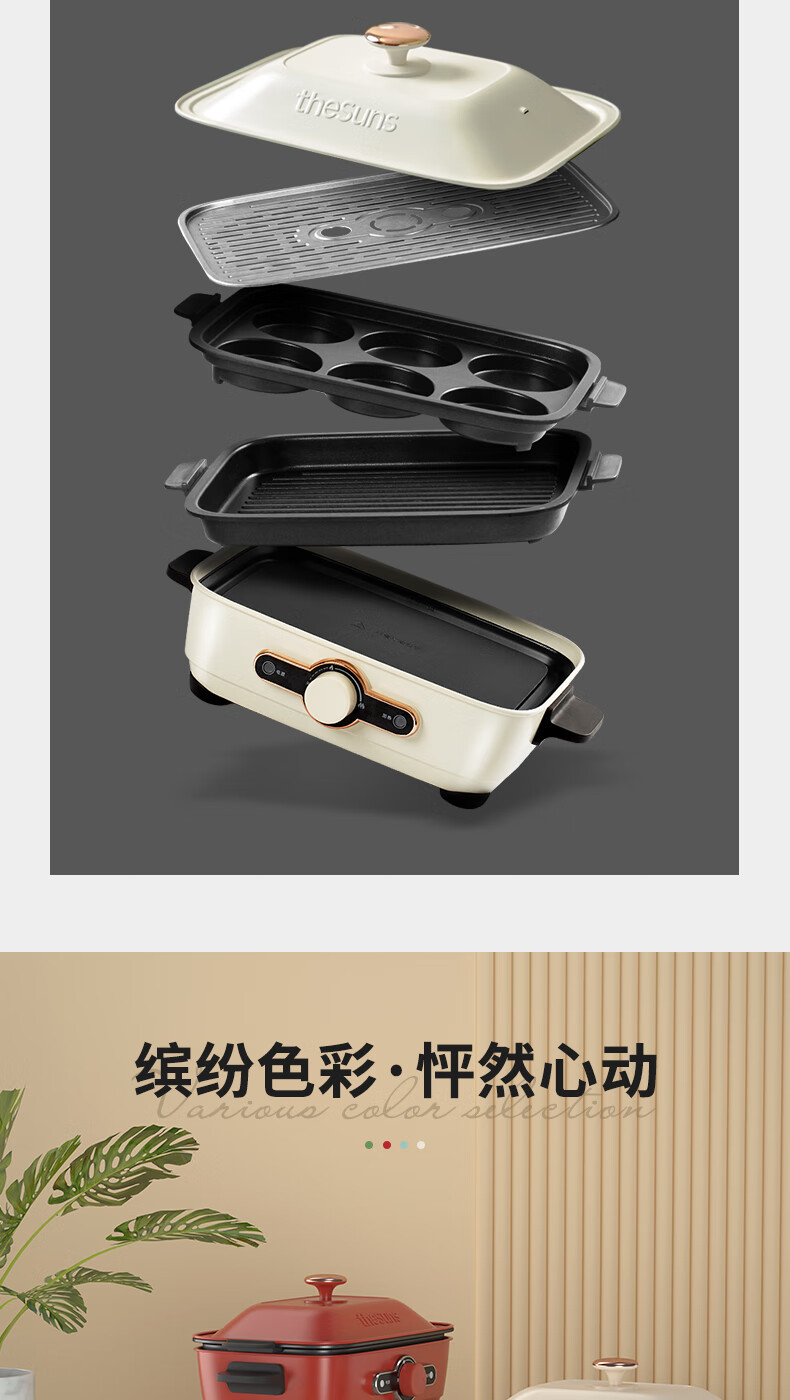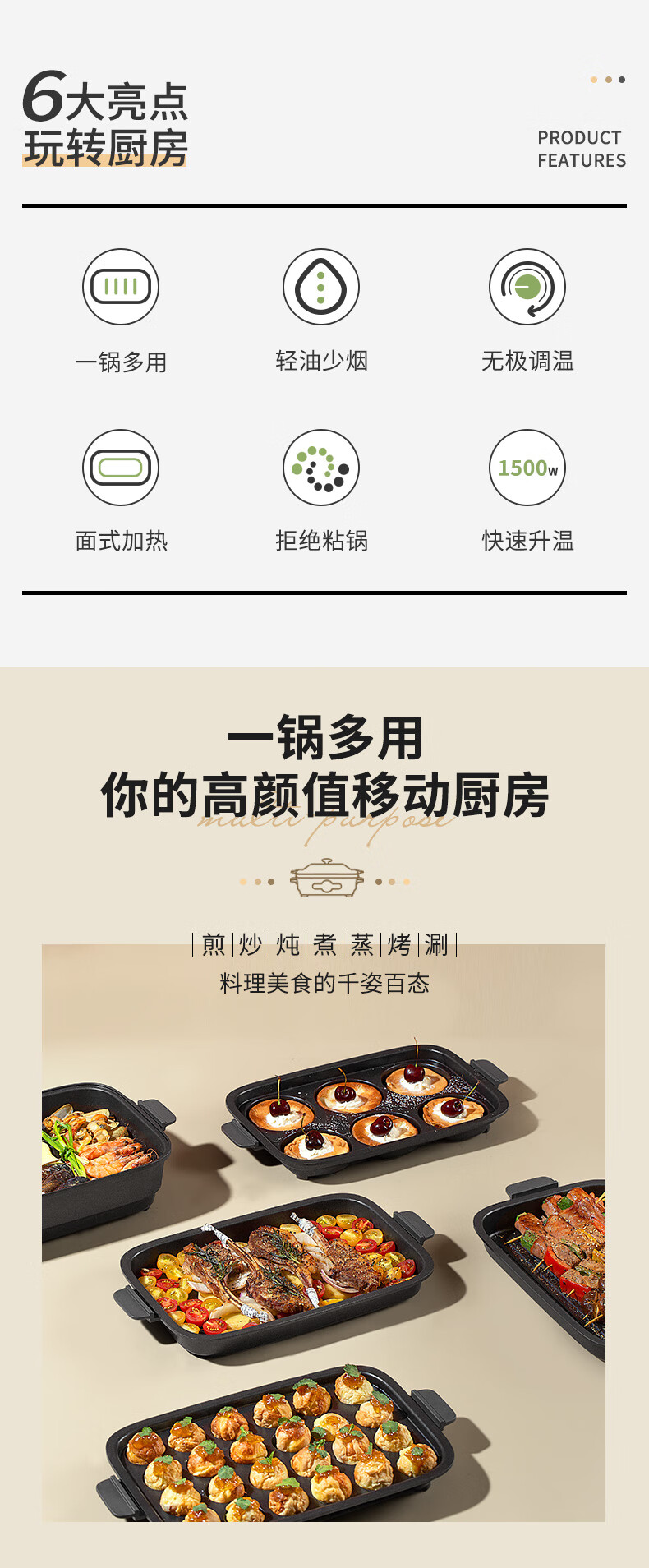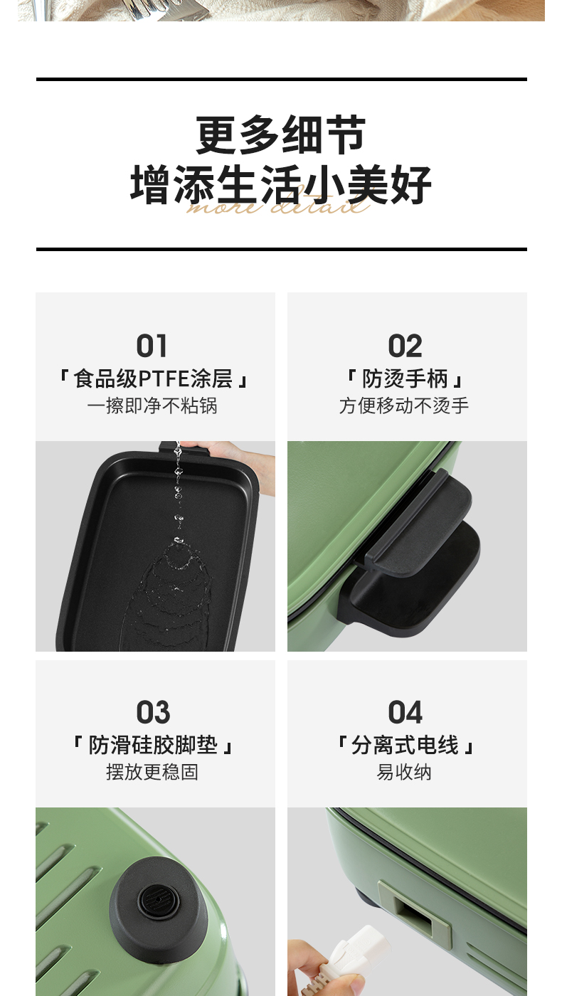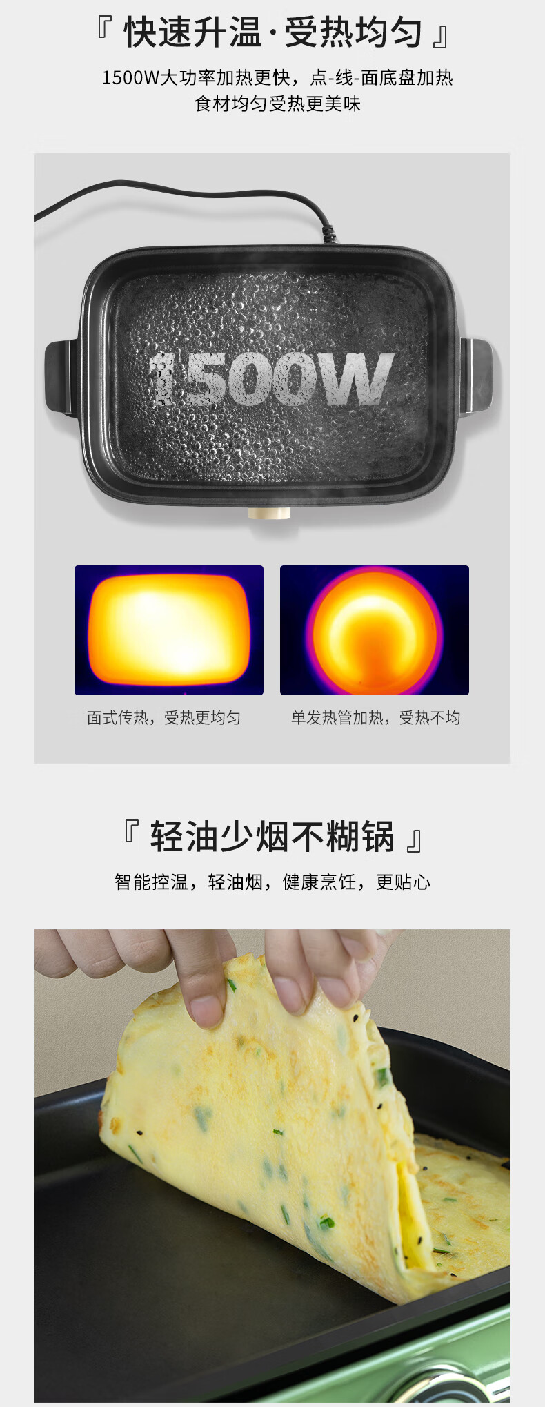 三食黄小厨 多功能锅网红料理锅电火锅锅家用电热炒锅烤肉蒸炒烧烤煎涮烤一体多用途电炖煮锅 复古绿+专业款(平煎盘+深锅+蒸架+条纹盘)