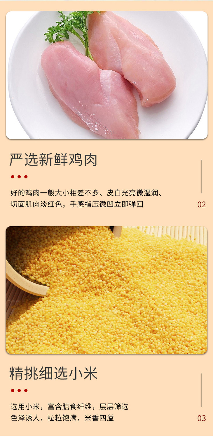 严格甄选优质大米、小米,搭配上鸡肉,精研配方,匠心制作;