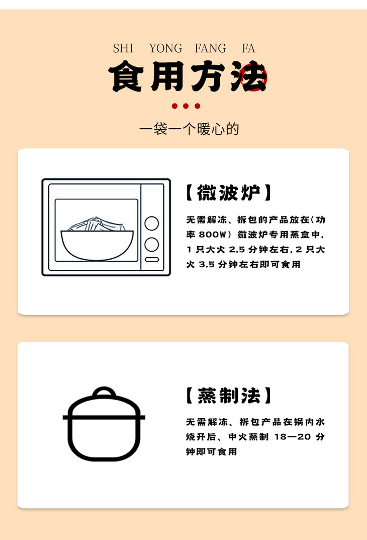 做法:无需解冻,直接微波炉加热,每个加热3分钟左右;