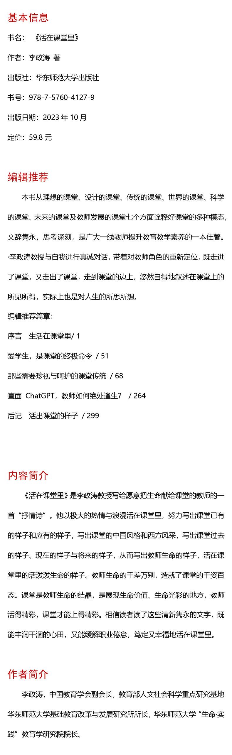 《活在课堂里》是李政涛教授写给愿意把生命献给课堂的教师的一首“抒情诗”。他以极大的热情与浪漫活在课堂里,努力写出课堂已有的样子和应有的样子,写出课堂的中国风格和西方风采,写出课堂过去的样子、现在的样子与将来的样子,从而写出教师生命的样子,活在课堂里的活泼泼生命的样子。教师生命的千差万别,造就了课堂的千姿百态。课堂是教师生命的结晶,是展现生命价值、生命光彩的地方,教师活得精彩,课堂才能上得精彩。相信读者读了这些清新隽永的文字,既能丰润干涸的心田,又能缓解职业倦怠,笃定又幸福地活在课堂里。