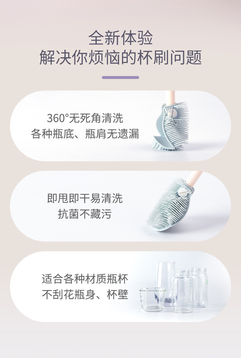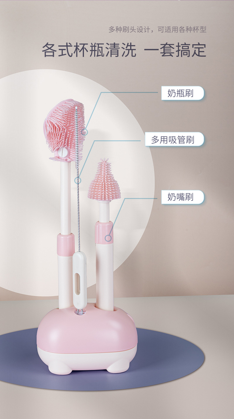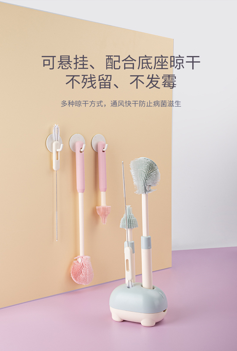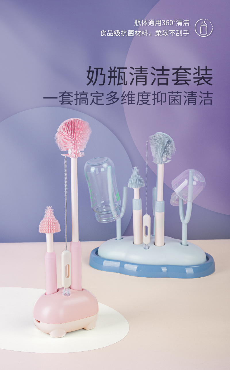 儿童瓶刷三件套带沥水架便携硅胶长柄可折叠刷头洗杯涮子