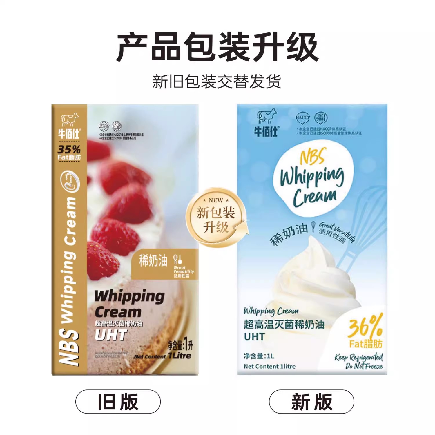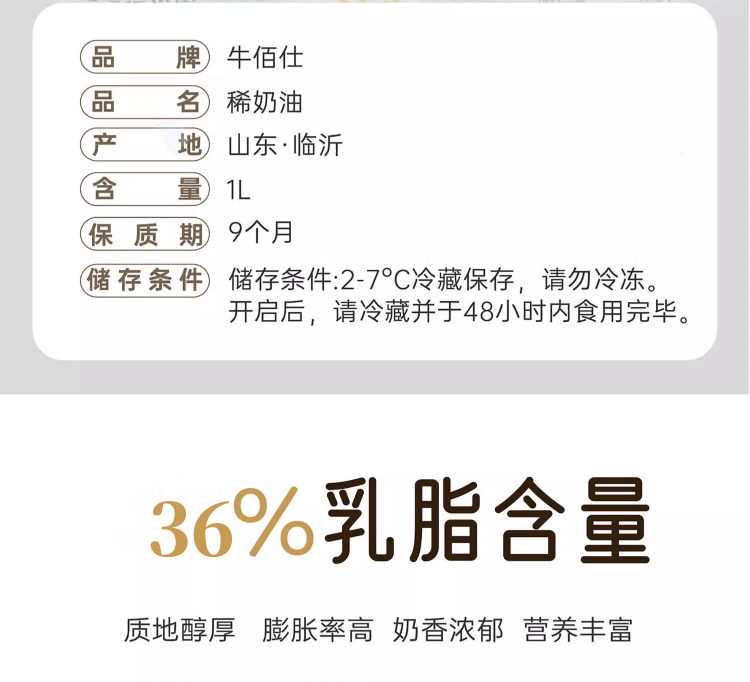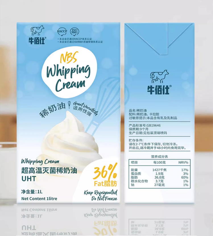 1L 牛佰仕稀奶油 动物性淡奶油 超高温灭菌 36%乳脂含量 烘焙奶油