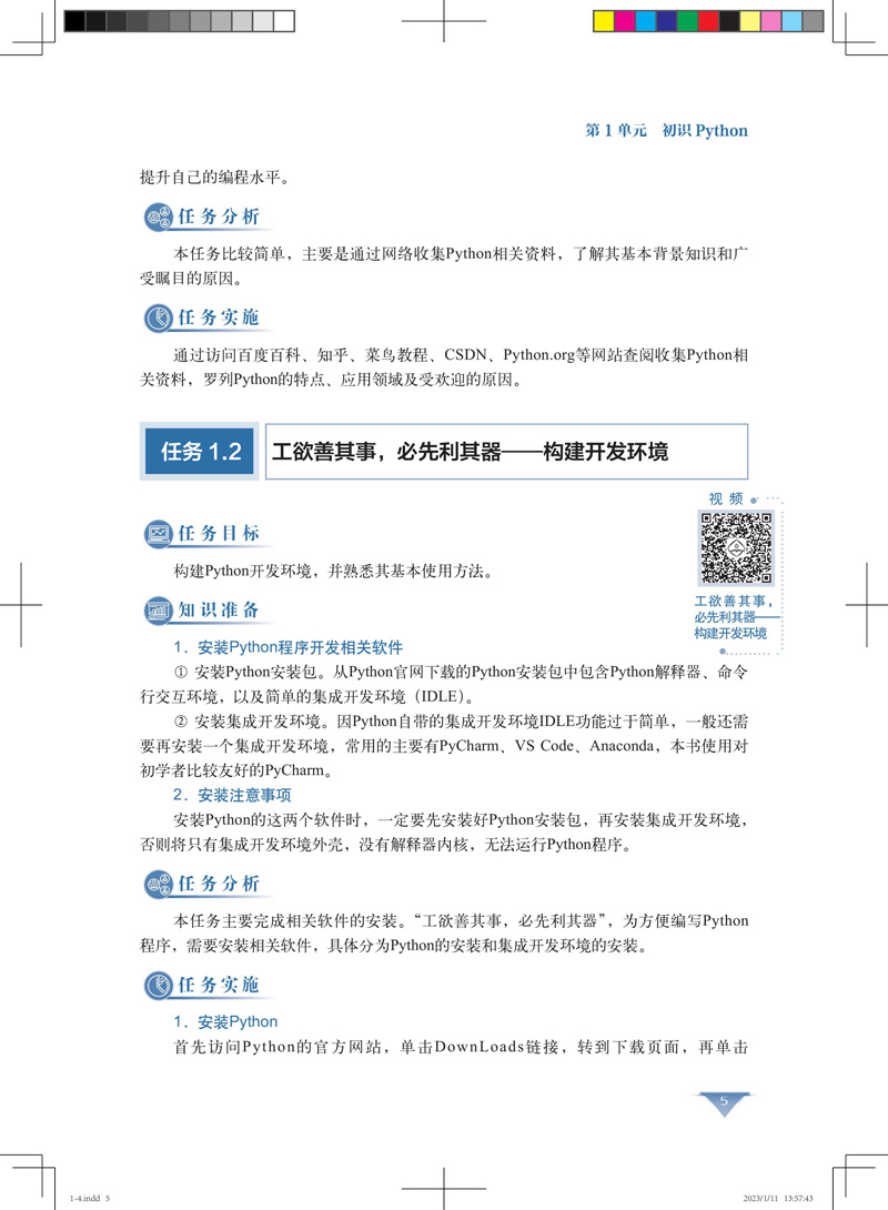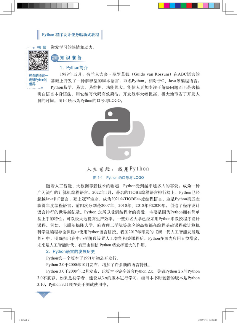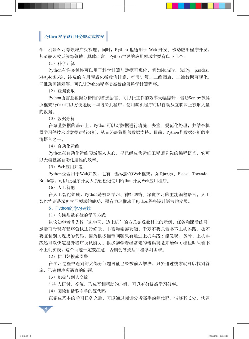 本教材内容覆盖了Python语言最常用的知识点,知识体系新颖、内容安排循序渐进,以大量任务和实例为依托,辅以大量学习资料、在线视频、题库、立体化教学资源。