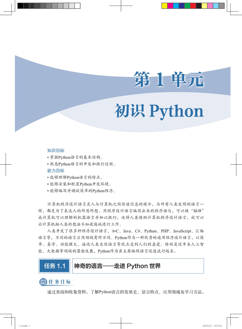 Python程序设计语言以语法优雅、简洁、入门简单等优点受到人们的喜爱,适合初学者作为程序设计入门语言进行学习。本教材以最新的Python 3.10版为基础,以应用为导向,采用任务驱动方式向读者介绍Python的基础知识,重视问题解决方法与编程能力的训练。本书共11单元,主要内容有初识Python、语法基础、选择结构、循环结构、列表与元组、字典与集合、函数与模块、面向对象编程、异常处理、文件操作、数据处理基础。