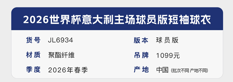 小李子ADIDAS阿迪达斯2026世界杯意大利主场球员版短袖球衣JL6934