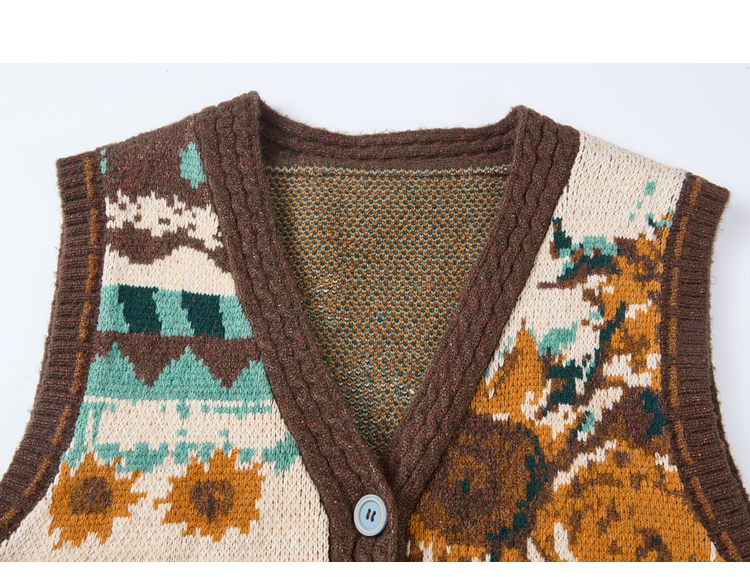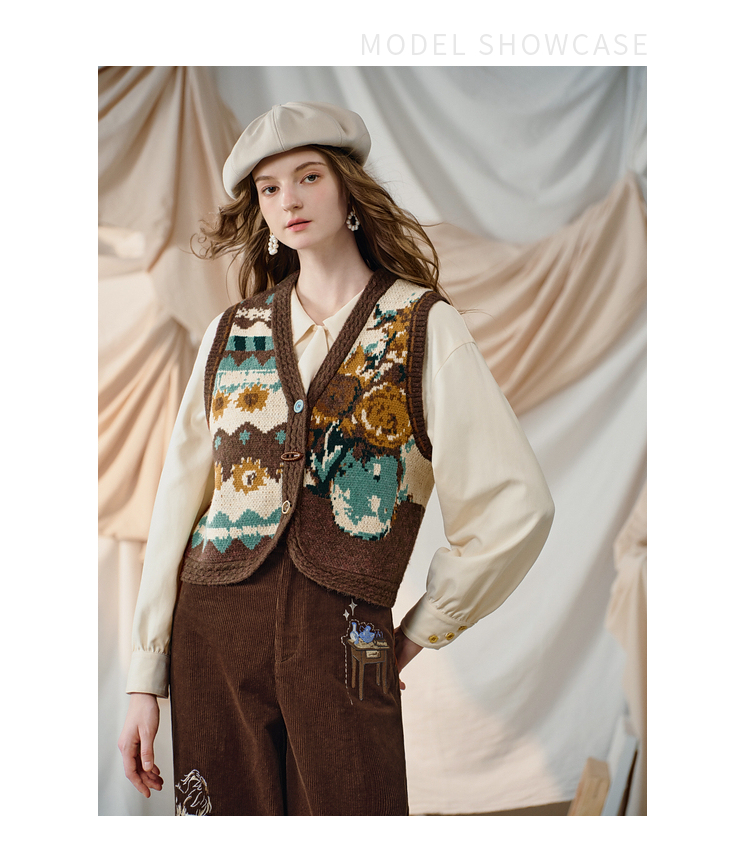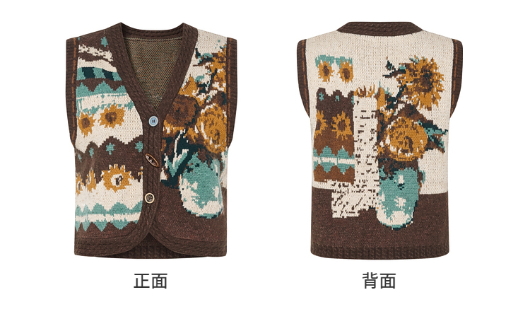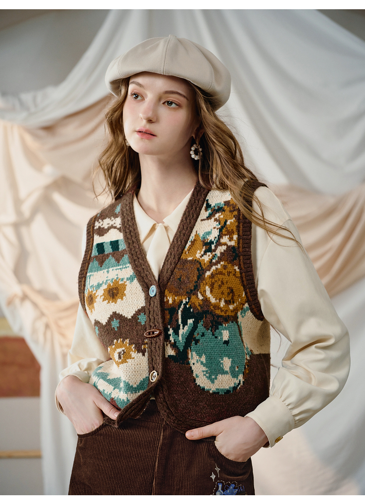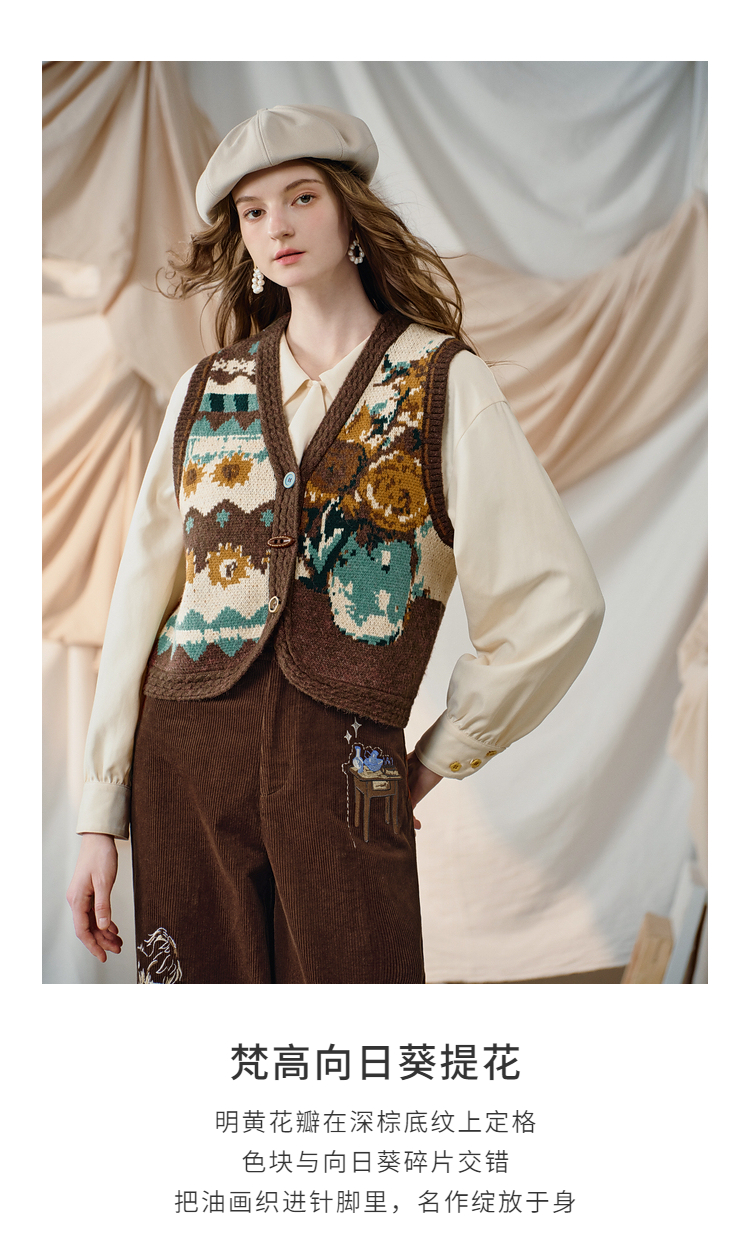 两三事梵高文艺松茶可可2025秋冬新款几何图形纽扣花色马甲女宽松