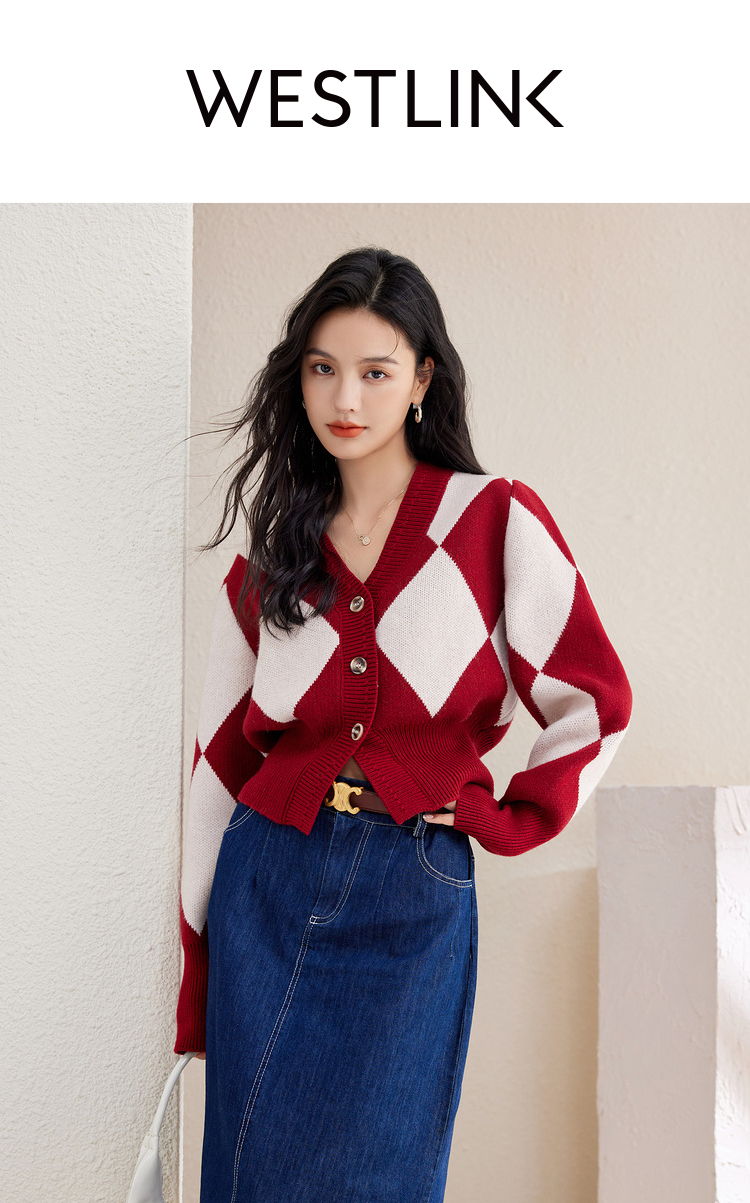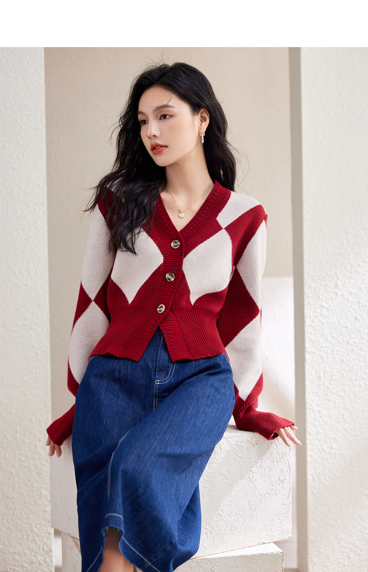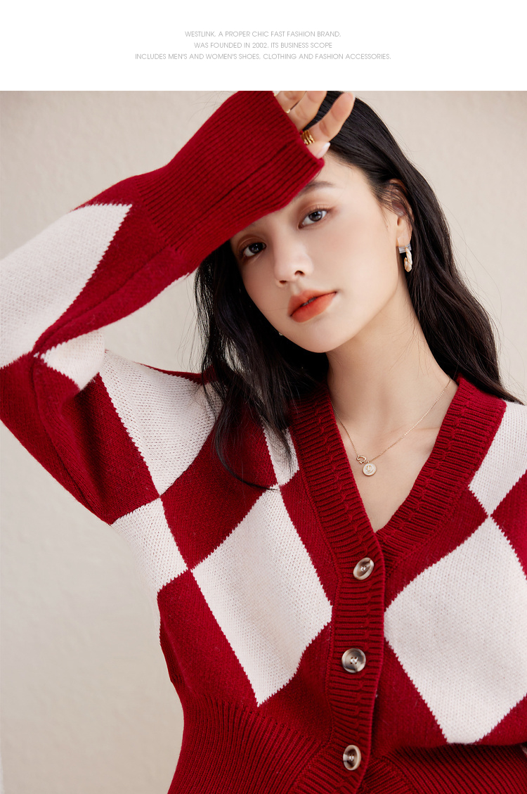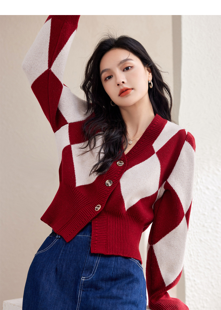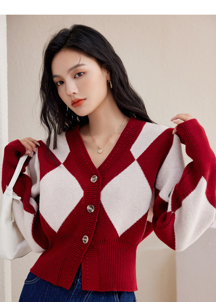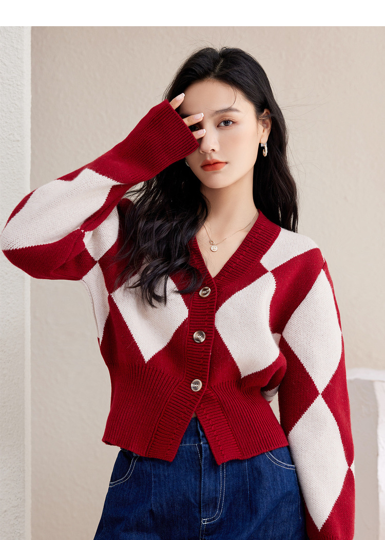 西遇复古针织开衫女秋季新款白色菱格短款红色毛衣外套SS141152