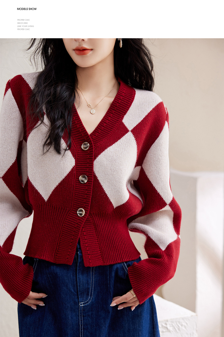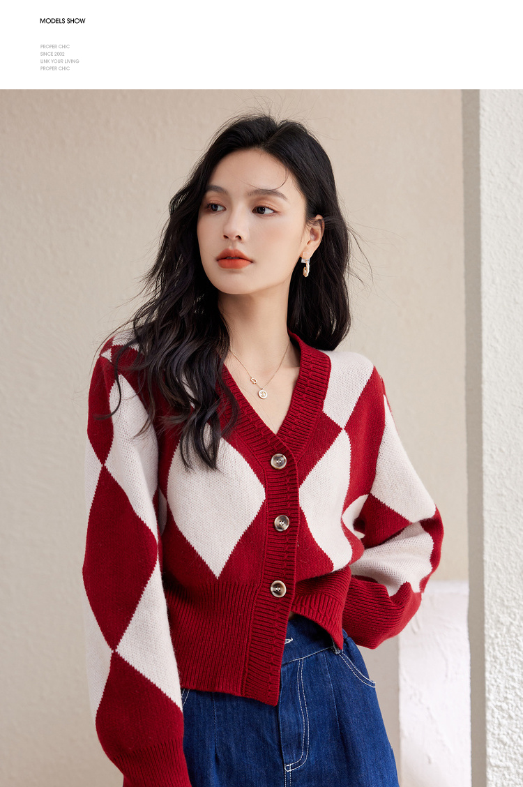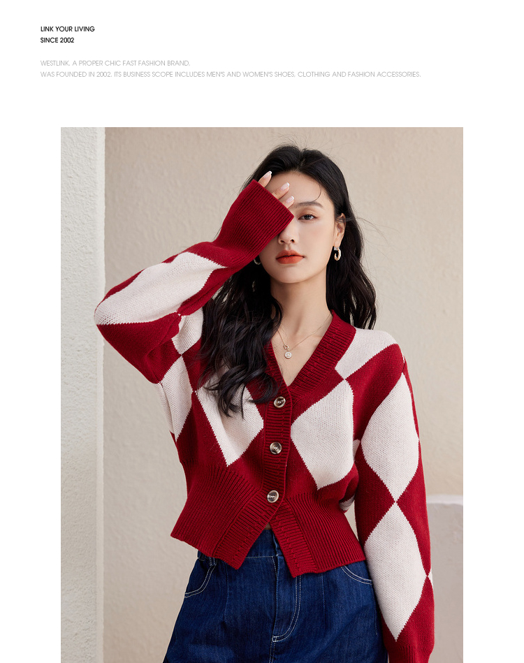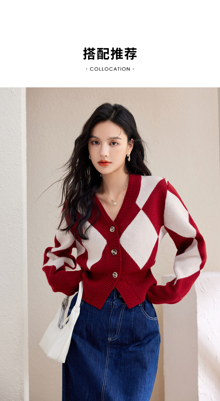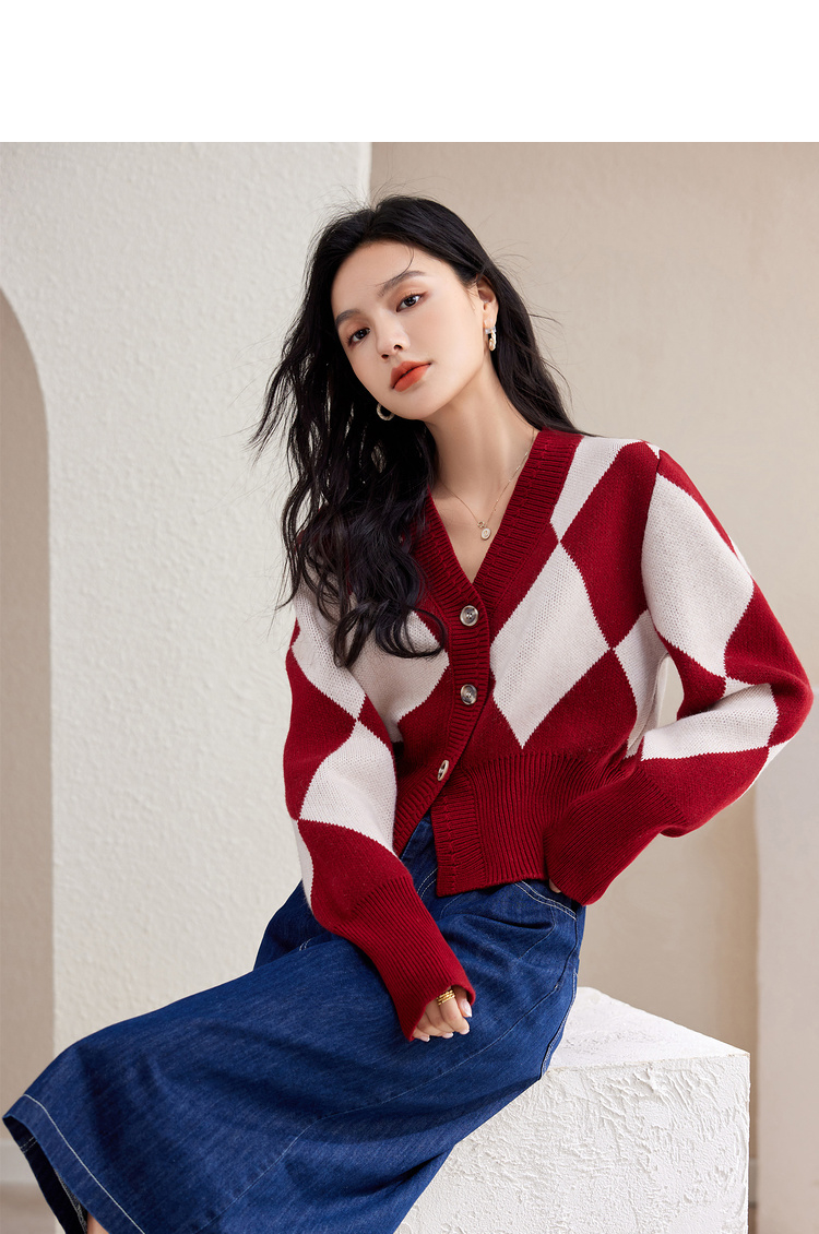 西遇复古针织开衫女秋季新款白色菱格短款红色毛衣外套SS141152