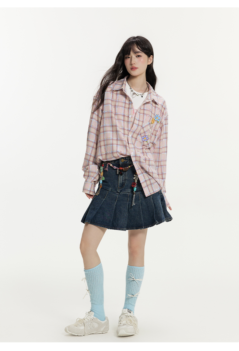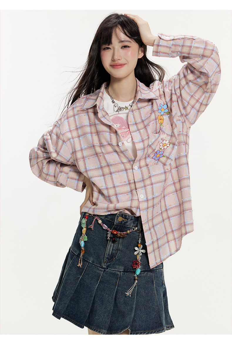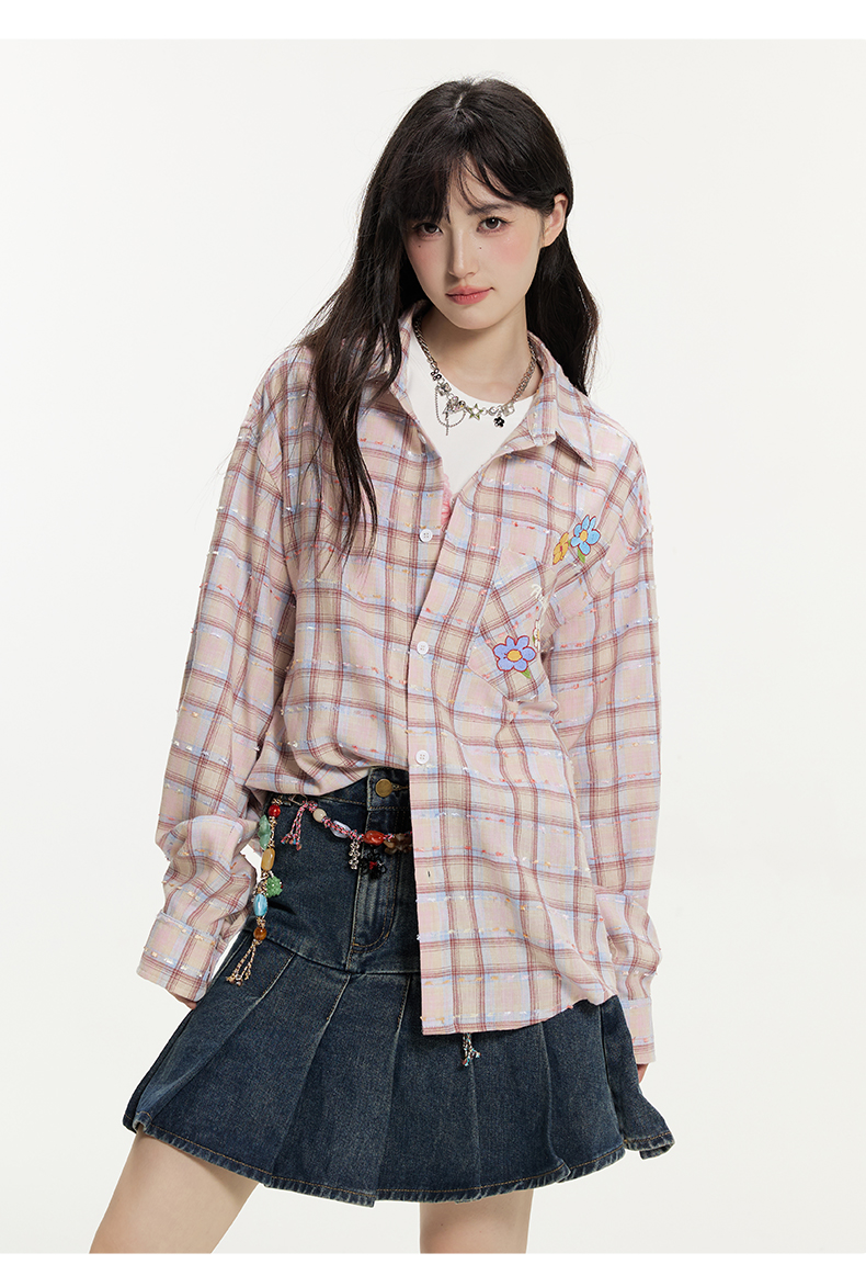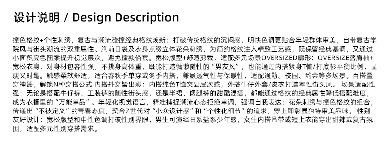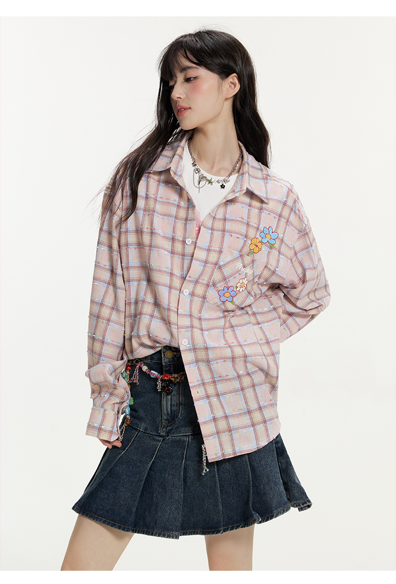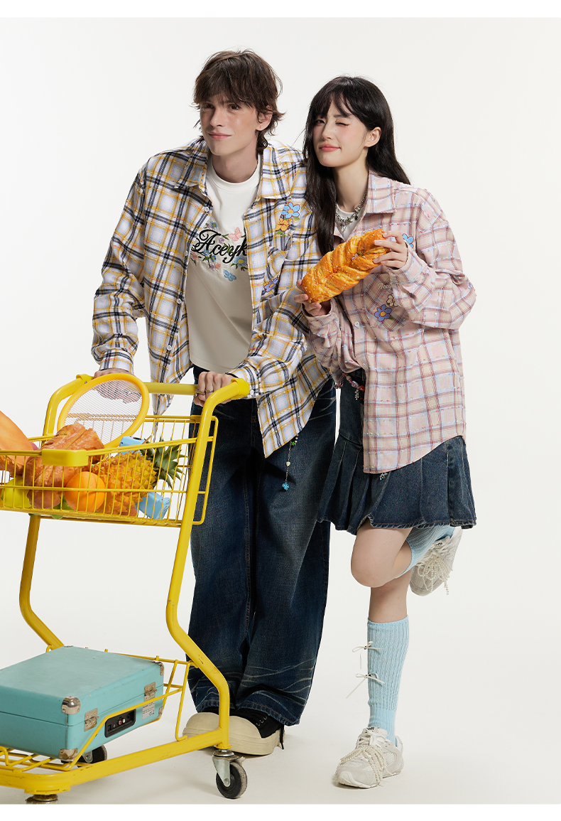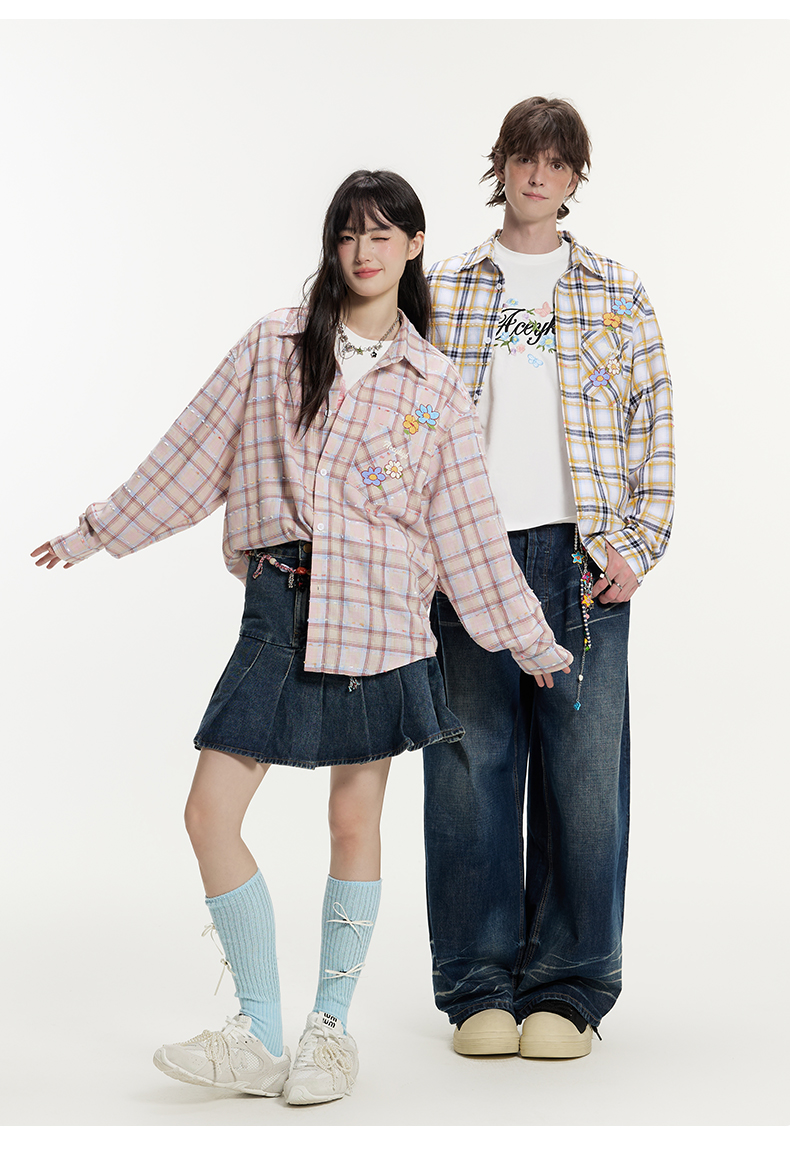 YKYB黄子韬 潮流格纹设计感衬衫刺绣小花百搭格子长袖衬衣外套秋Y53NCS055