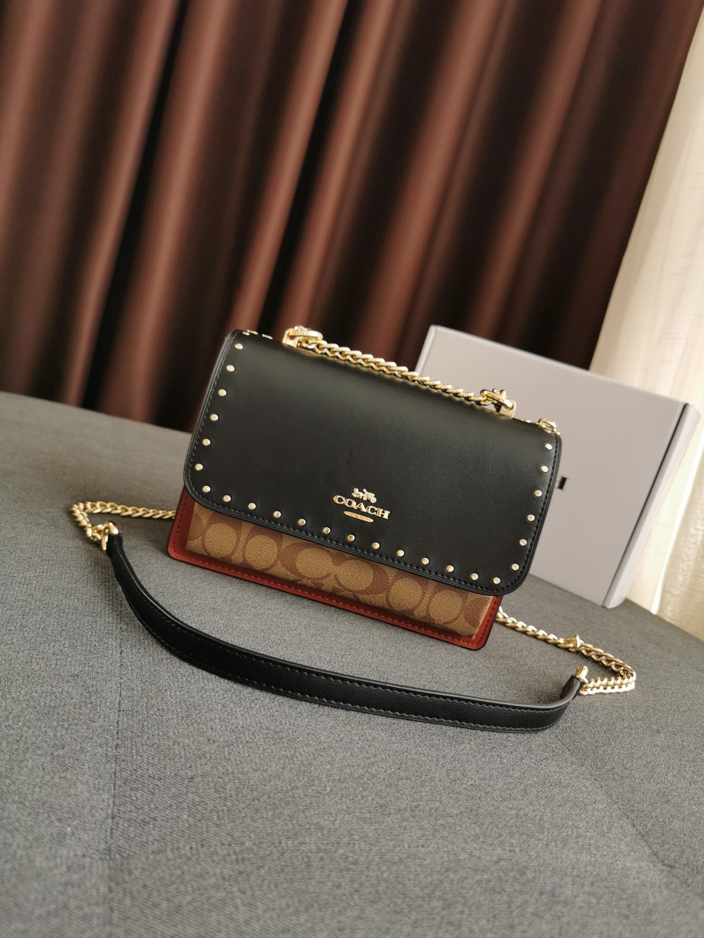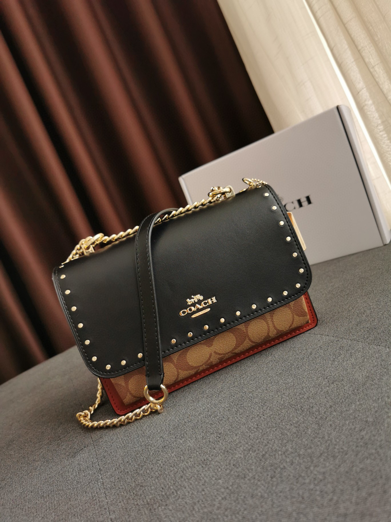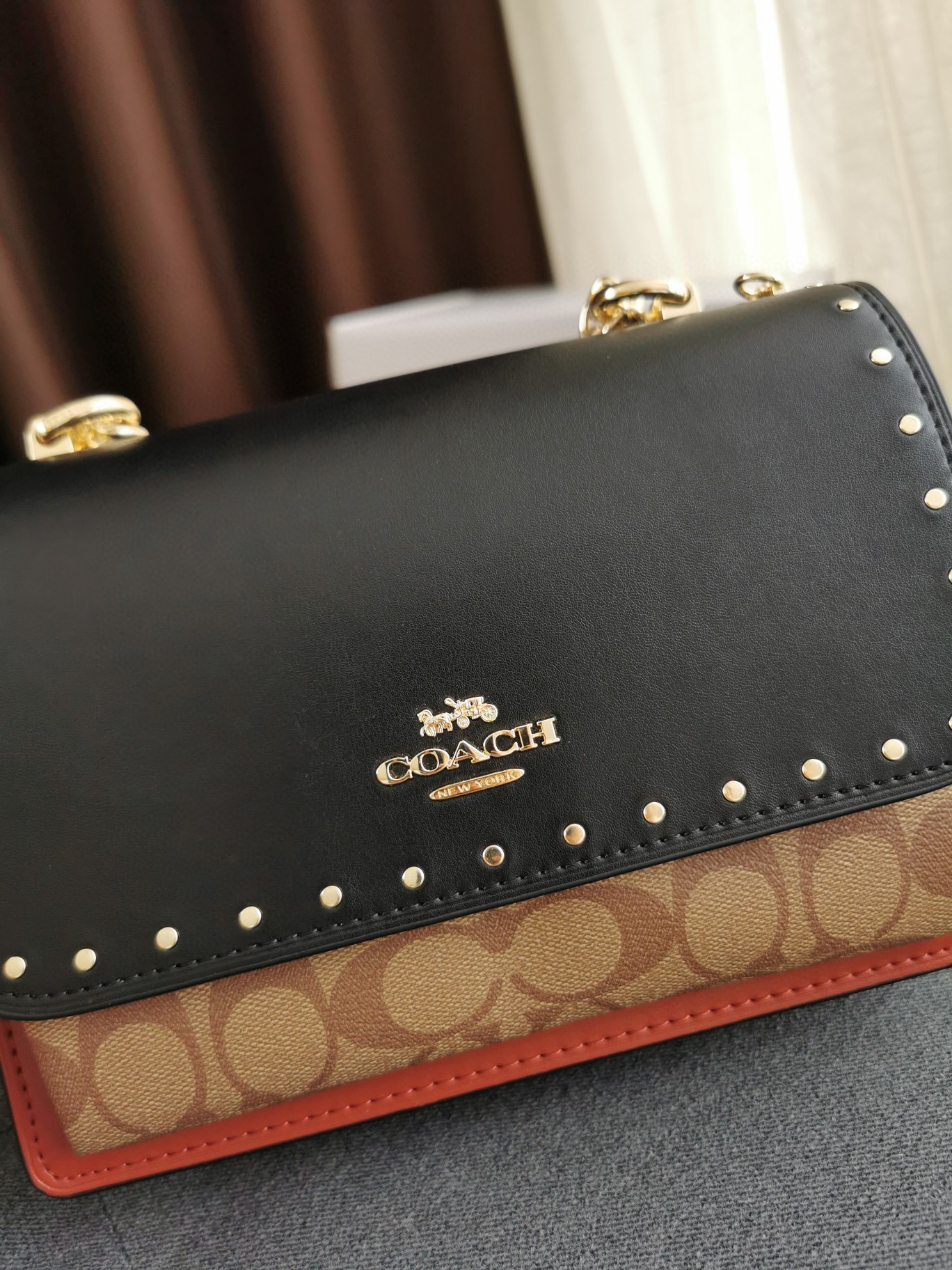 细节实拍/黑棕配色Coach Klare风琴包