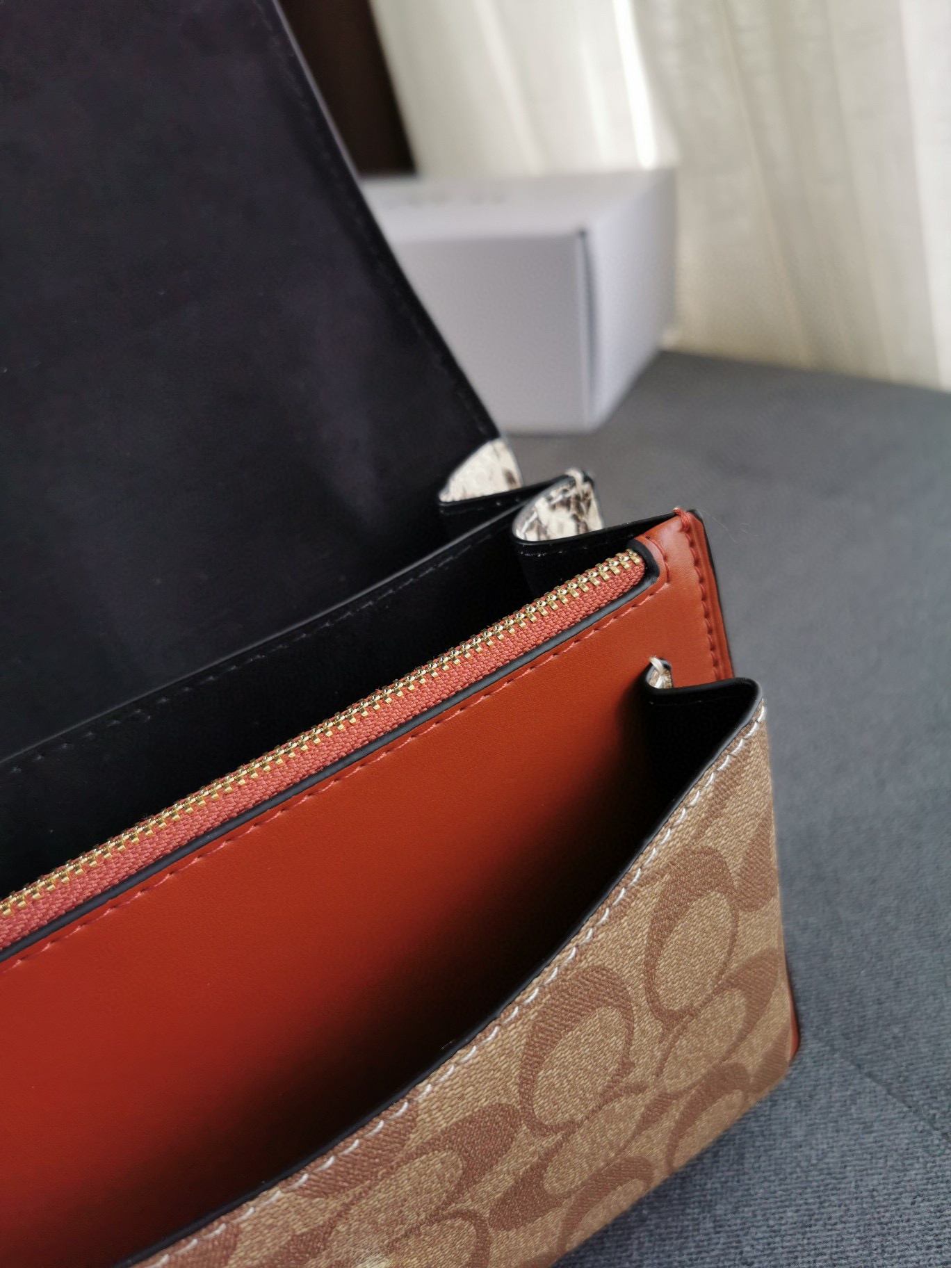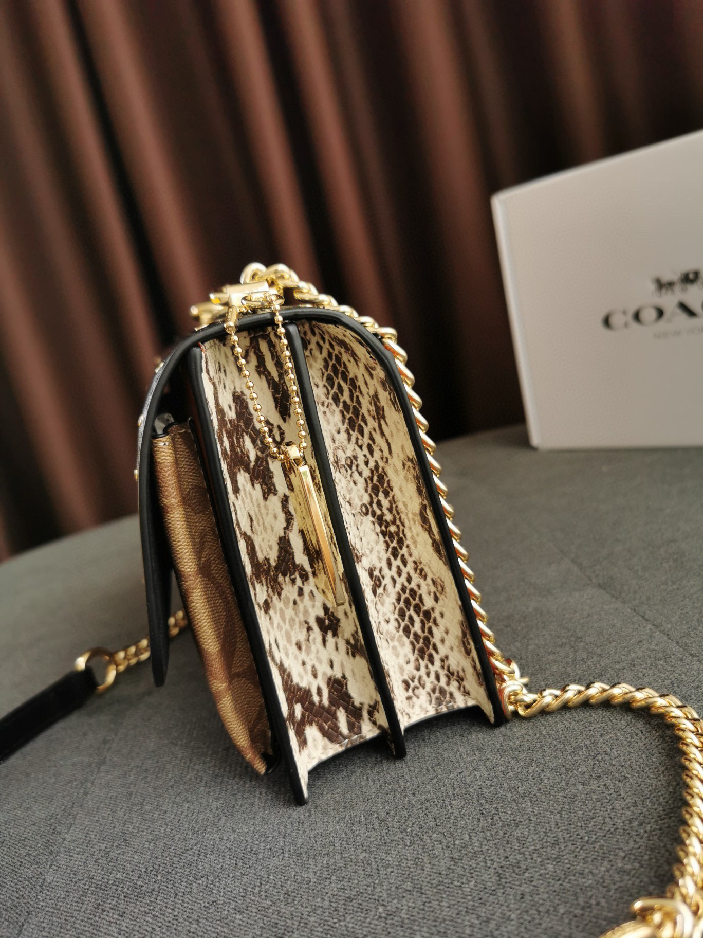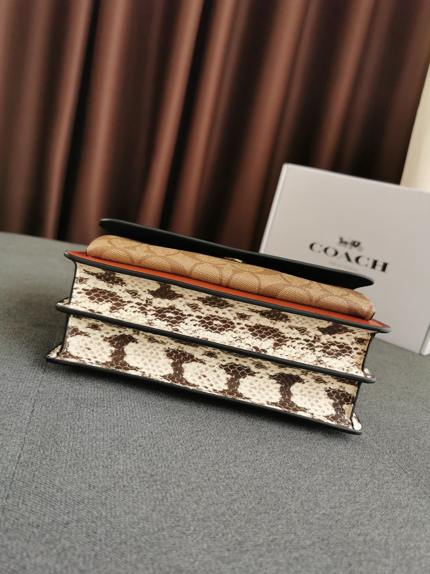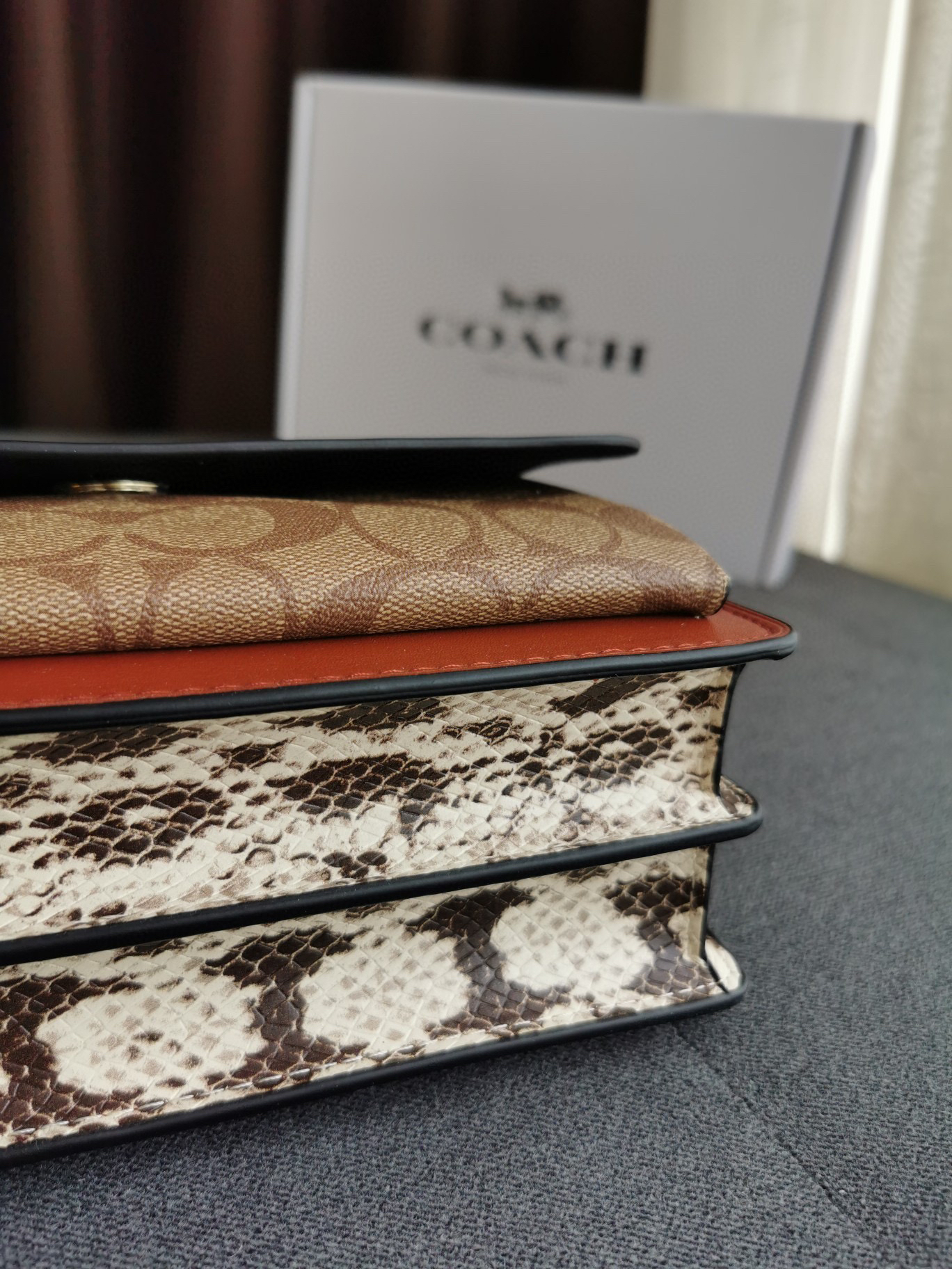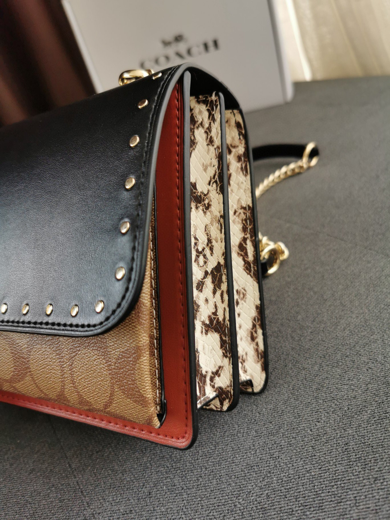 coach经典山茶花的配色,风琴包的包型,外配铆钉,翻盖黑色的光滑小🐂皮,丰富的细节及蛇皮压纹的侧边,简直让人爱不释手啊