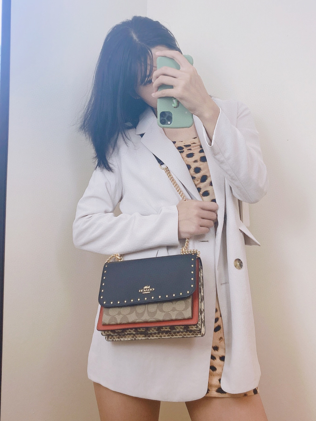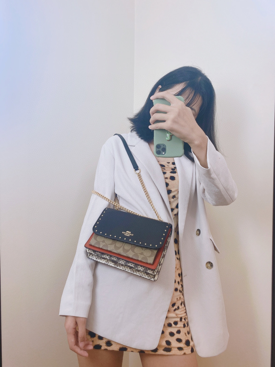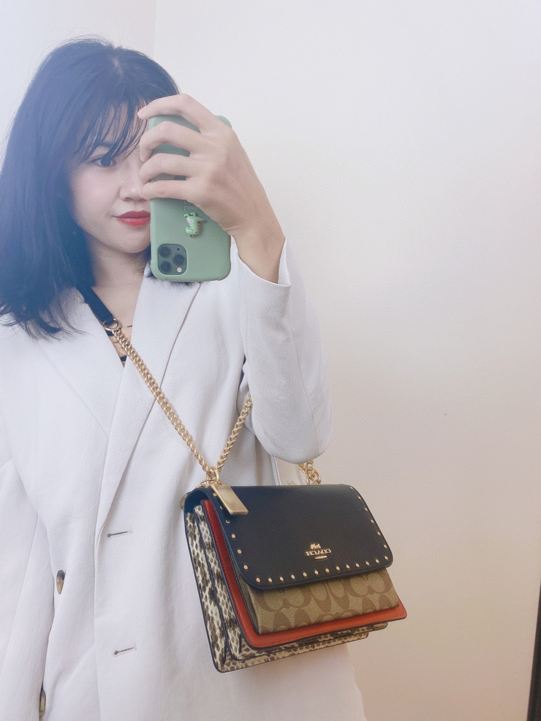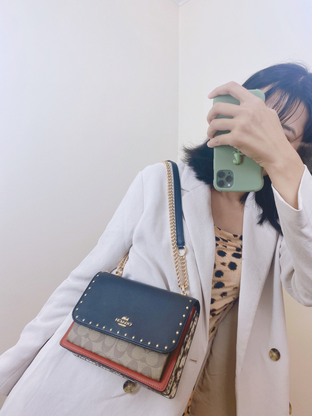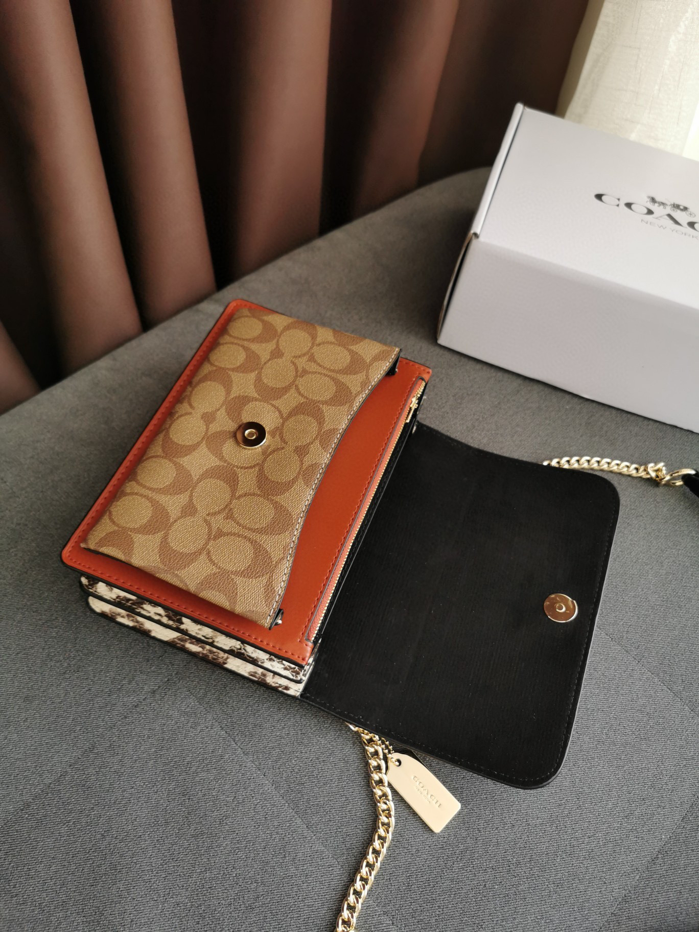 coach经典山茶花的配色,风琴包的包型,外配铆钉,翻盖黑色的光滑小🐂皮,丰富的细节及蛇皮压纹的侧边,简直让人爱不释手啊