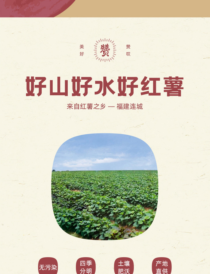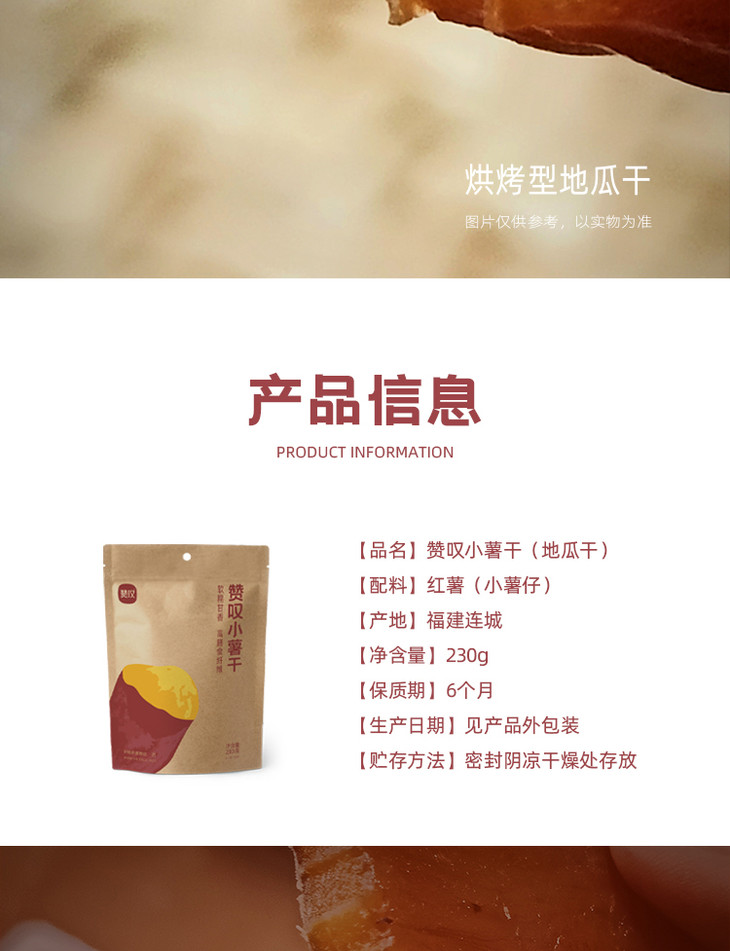 【品名】赞叹小红薯 【规格】230g/袋 【保质期】6个月 【储存方法】密封阴凉干燥处存放 【产地】福建龙岩 【发货地】福建龙岩 【发货快递】中通,圆通,邮政,极兔 【不发货区域】全国包邮,港澳台不发货 【发货时效】48小时,节假日顺延 |