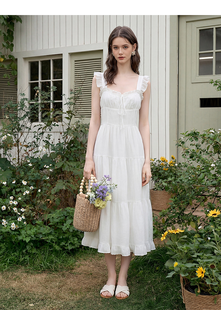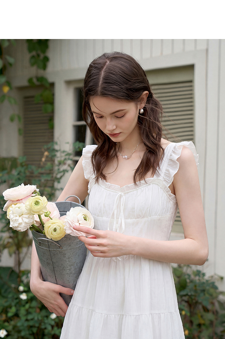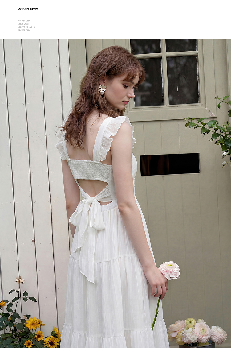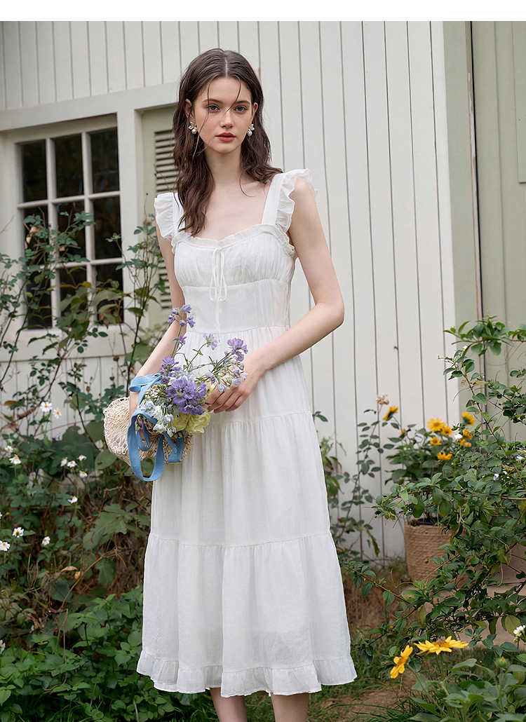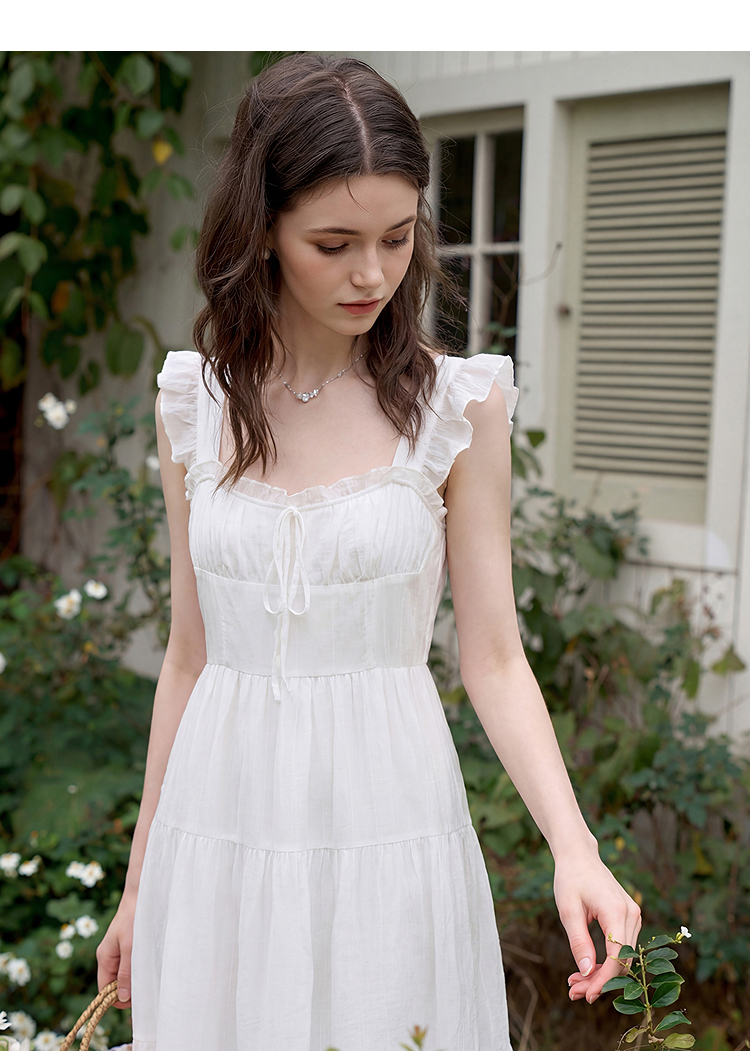 西遇法式飞飞袖排扣2026春夏方领蝴蝶结系带连衣裙气质露背长裙女H0060256