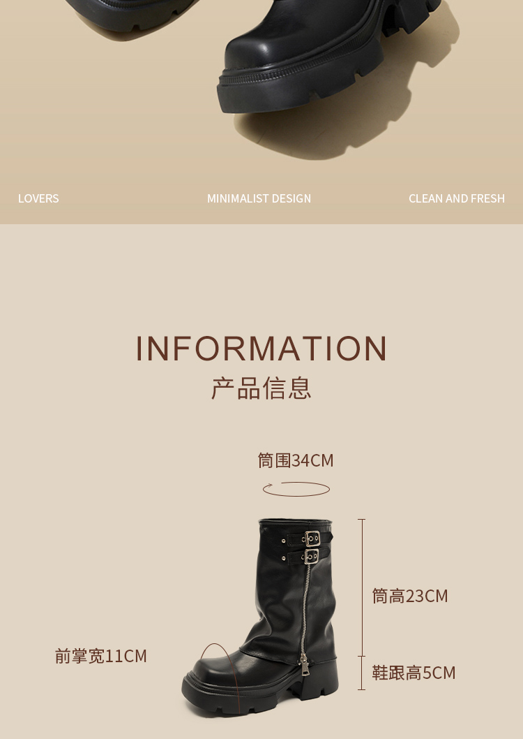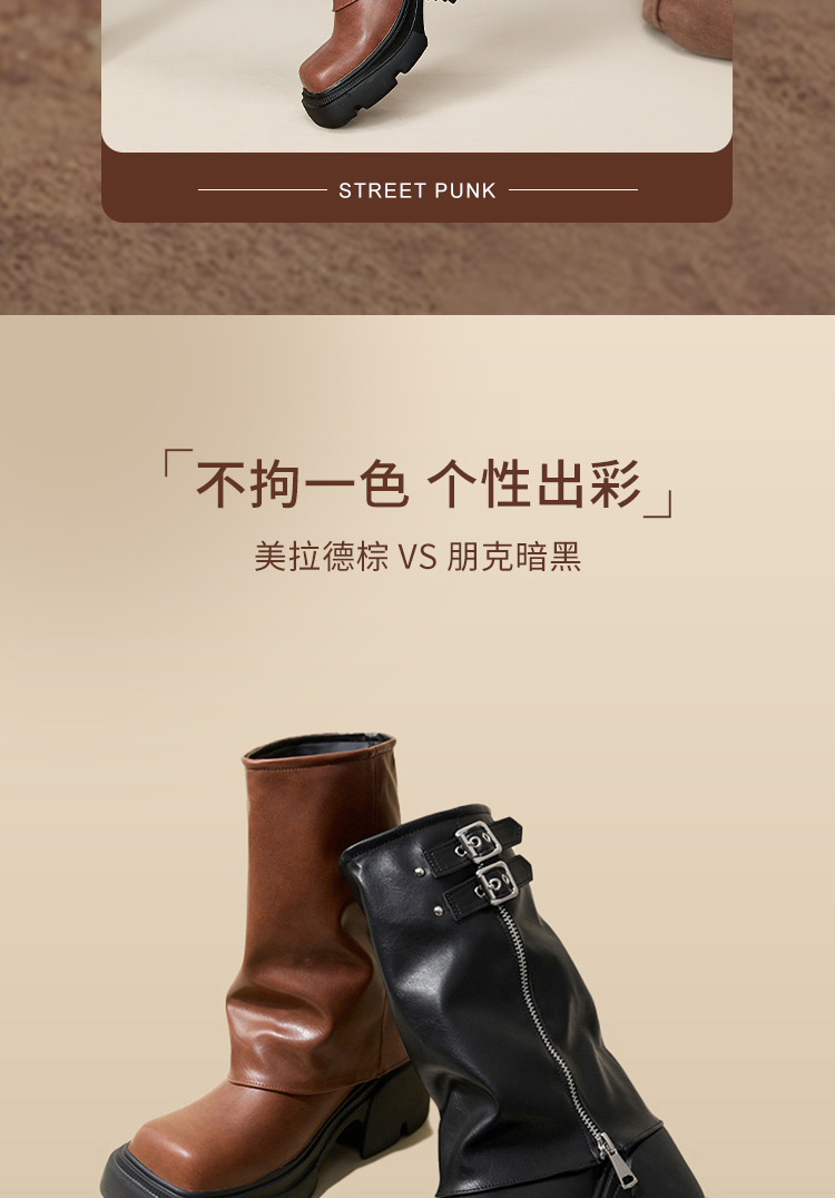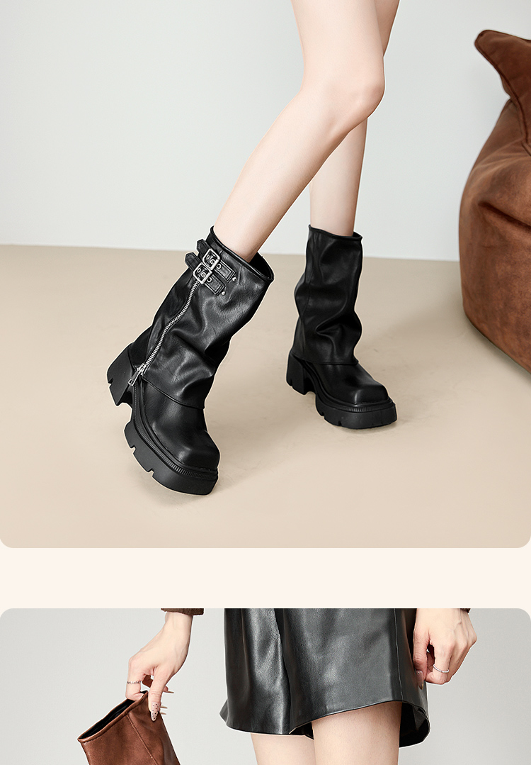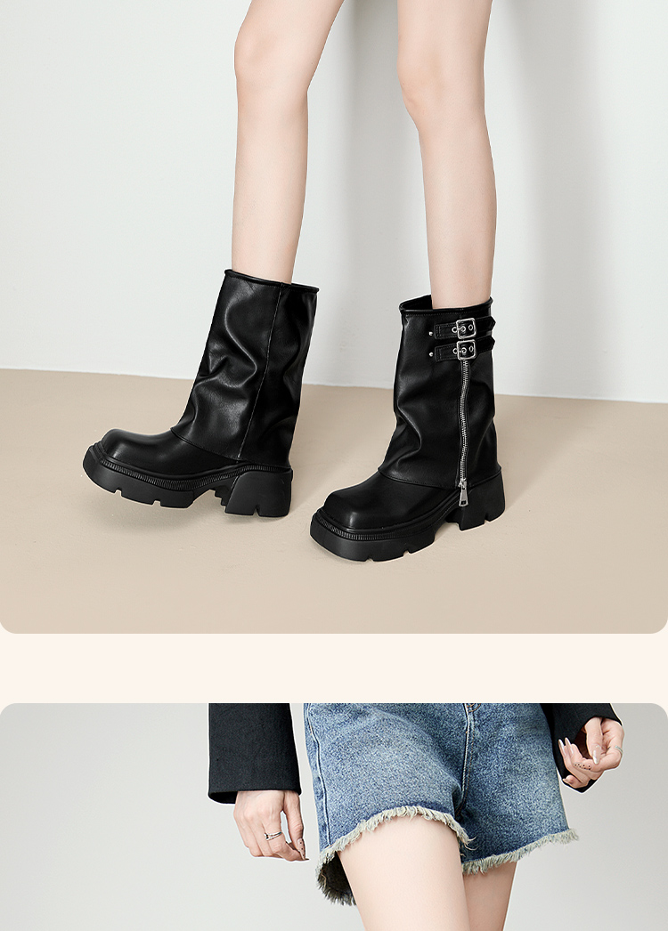 西遇厚底裤管靴女新款秋冬复古软皮套筒不过膝长筒靴增高长靴D3547667