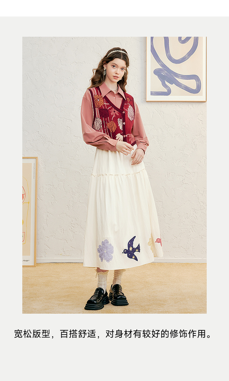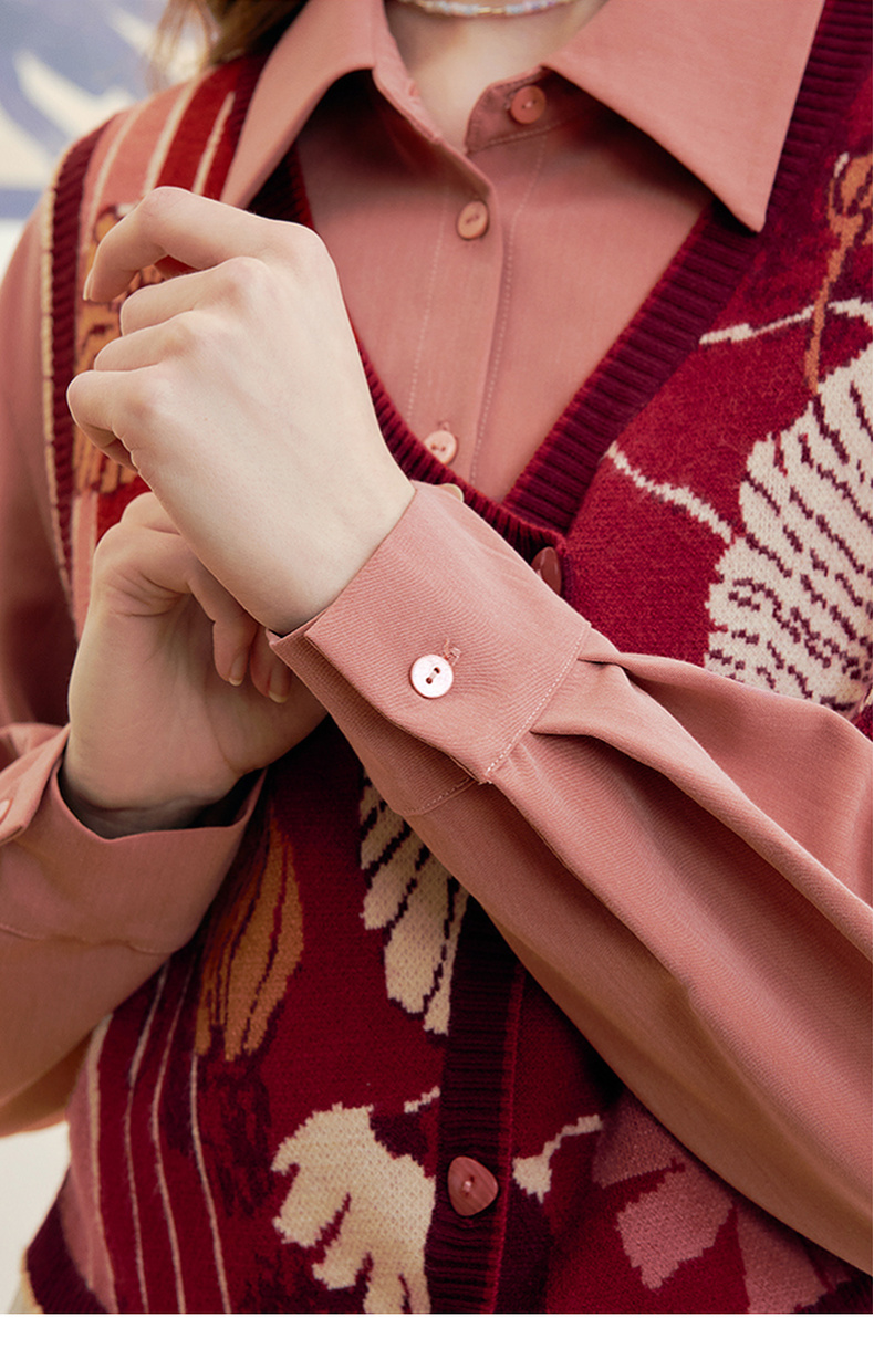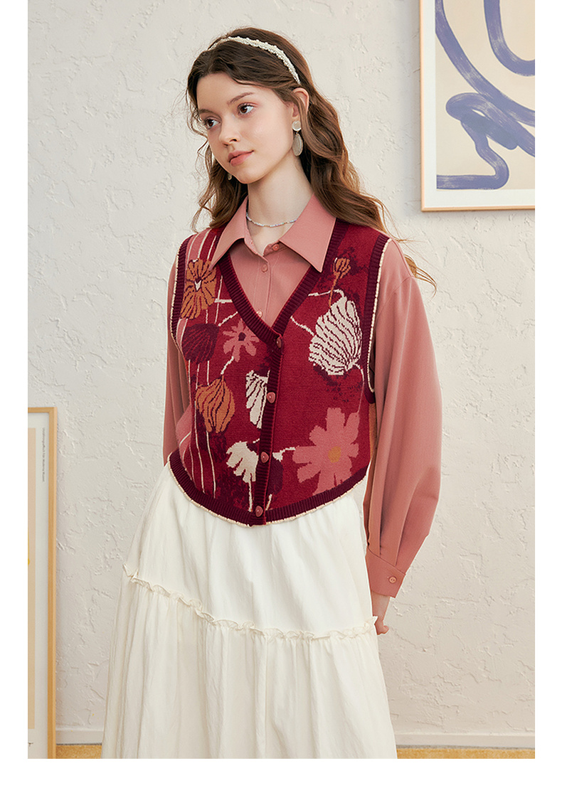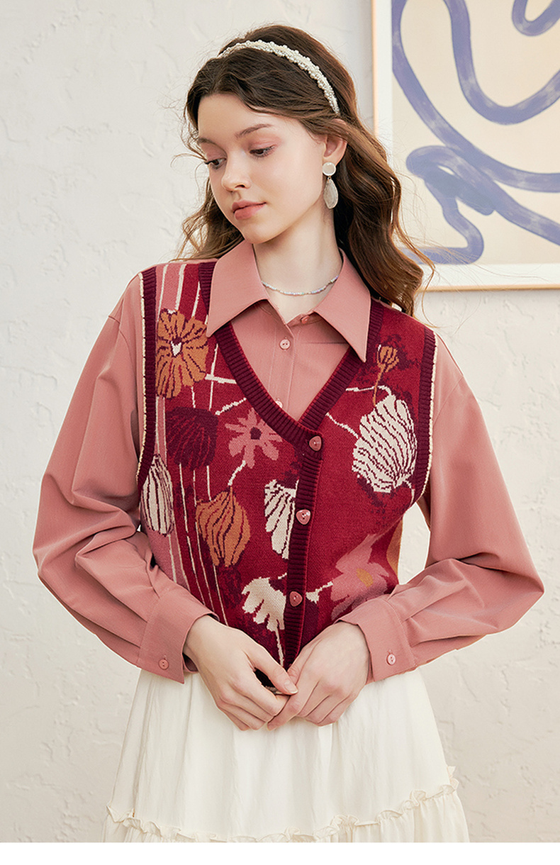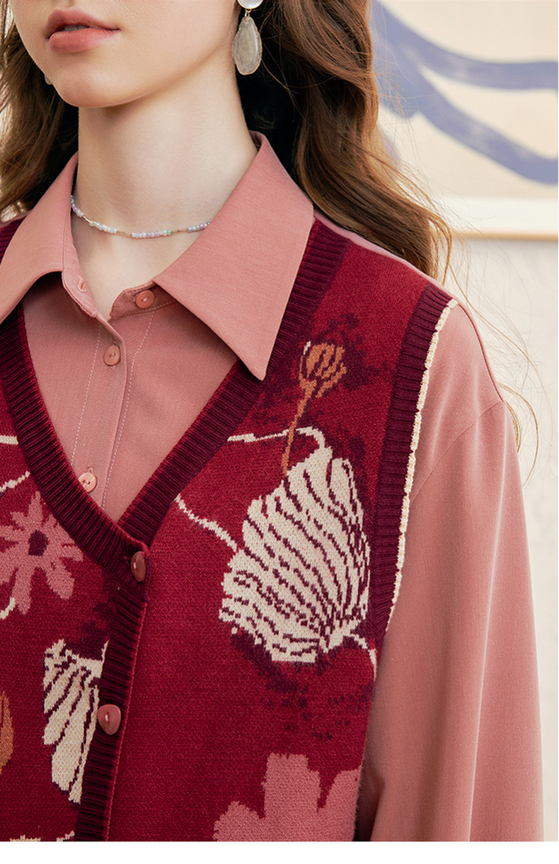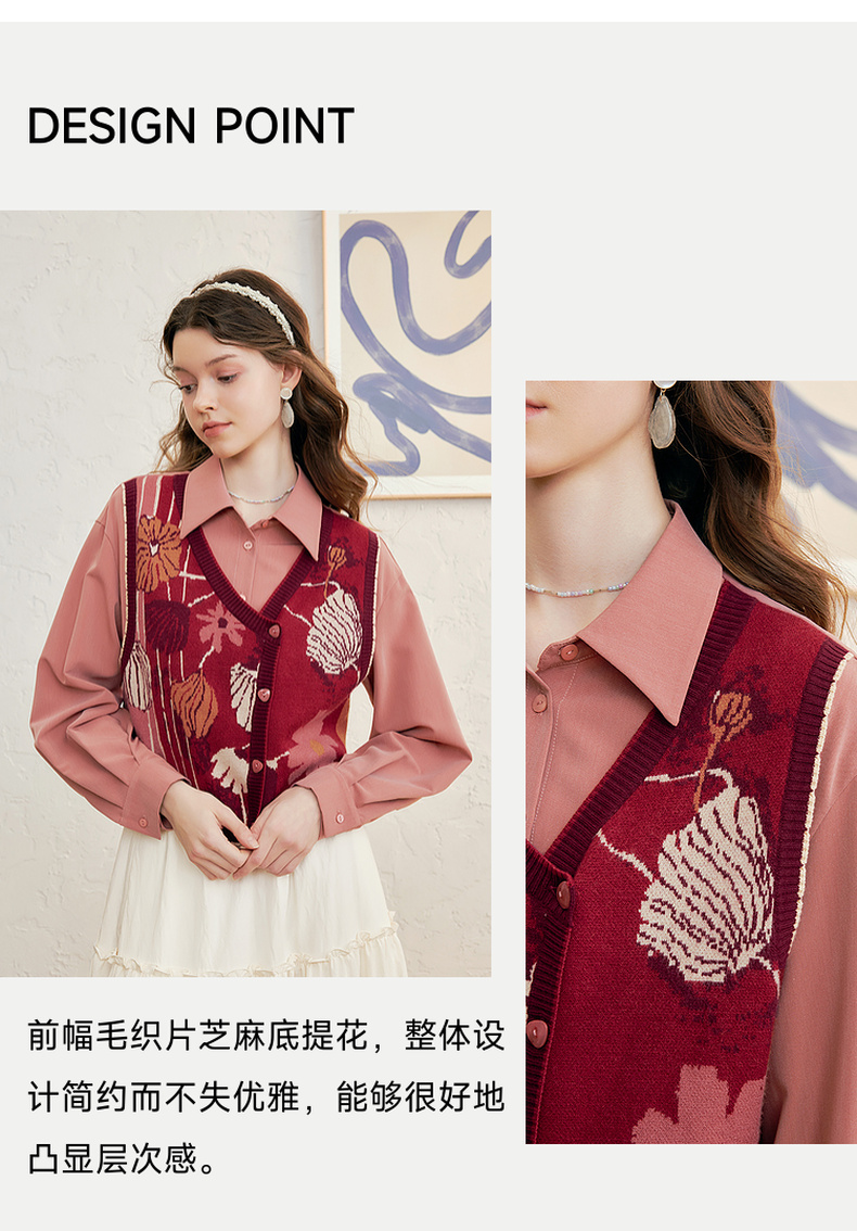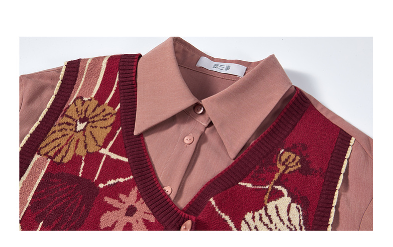 两三事 红莓夕霞 2025春季新款复古针织花卉拼接假两件衬衫女宽松S25CC453