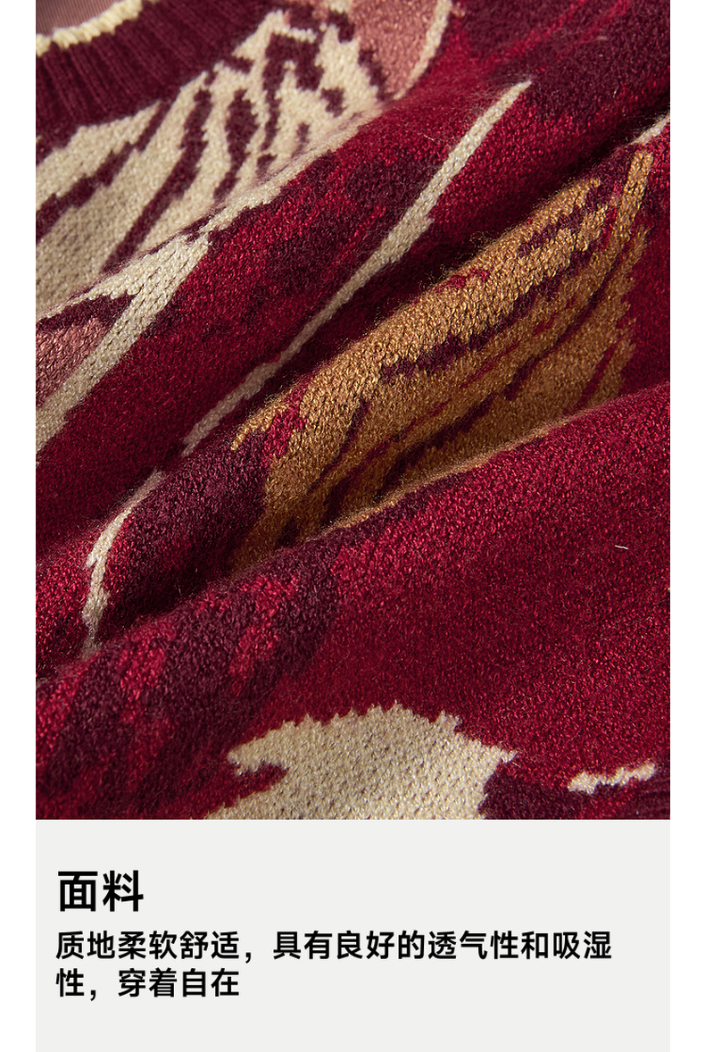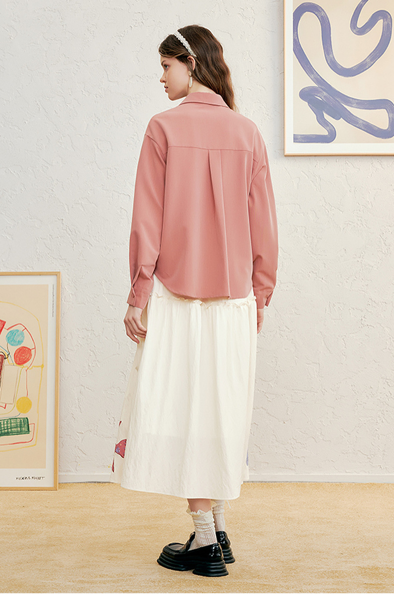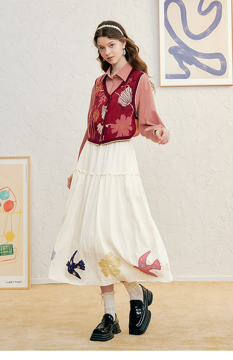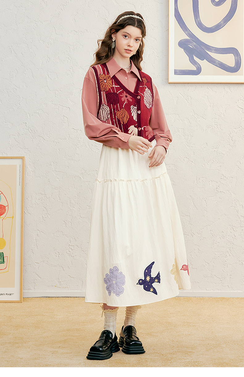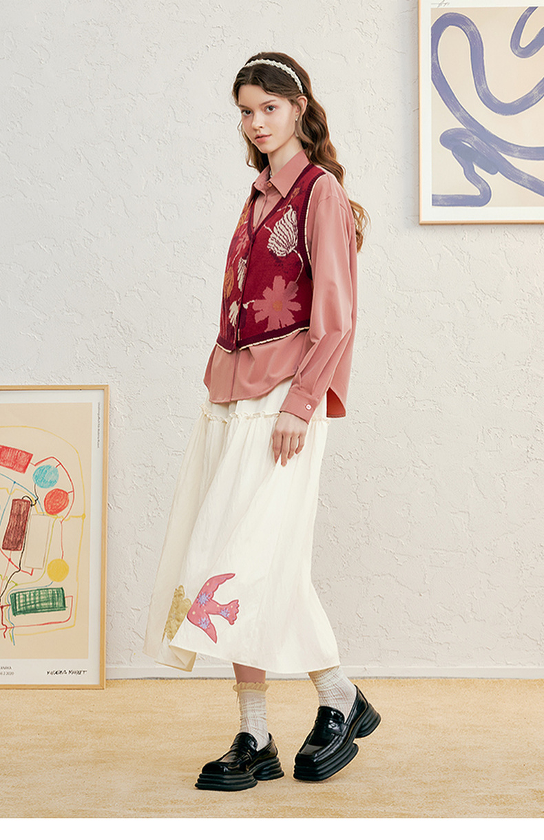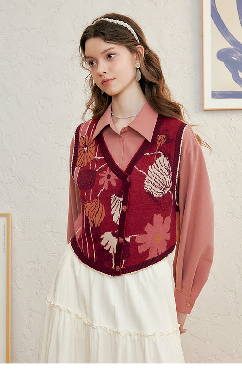 两三事 红莓夕霞 2025春季新款复古针织花卉拼接假两件衬衫女宽松S25CC453